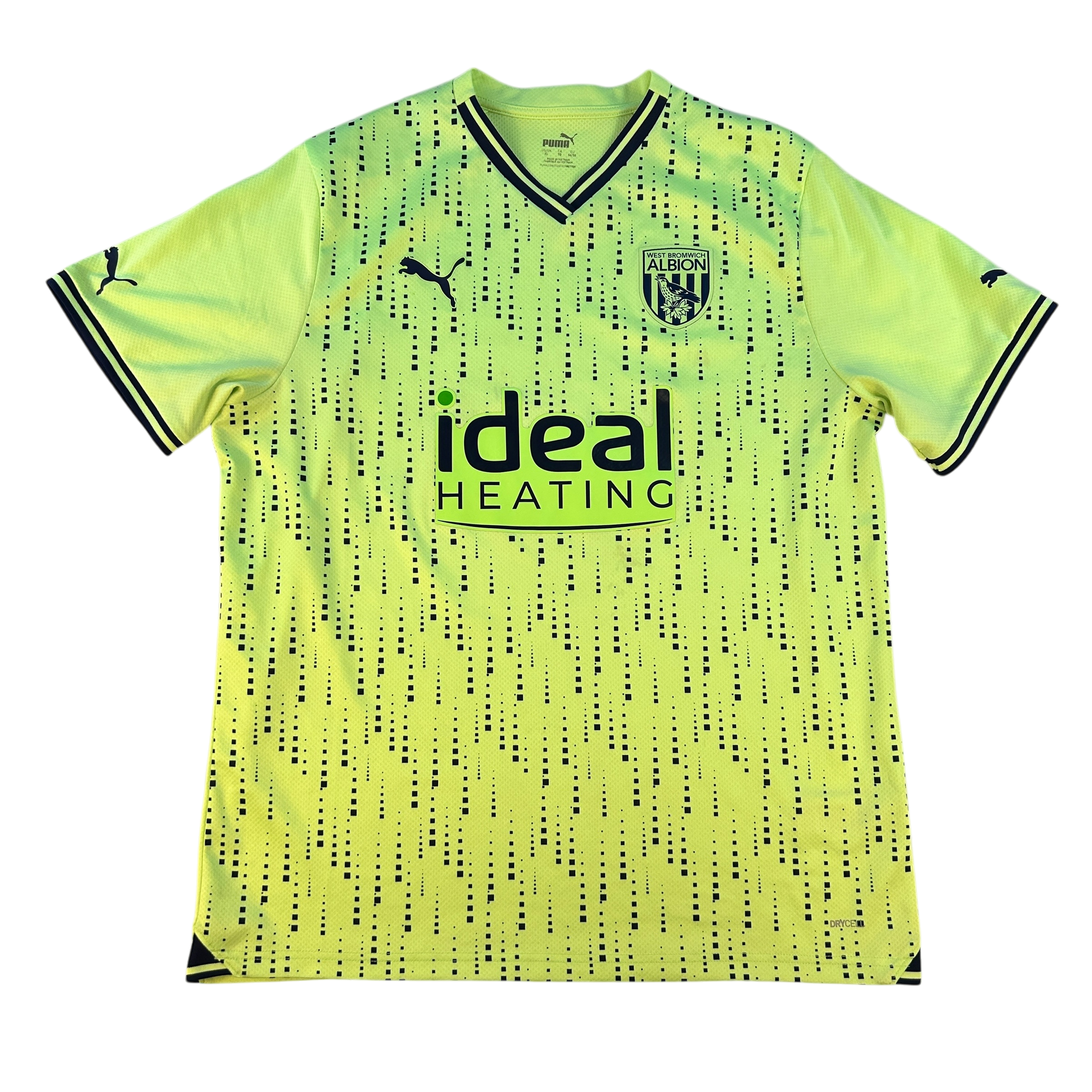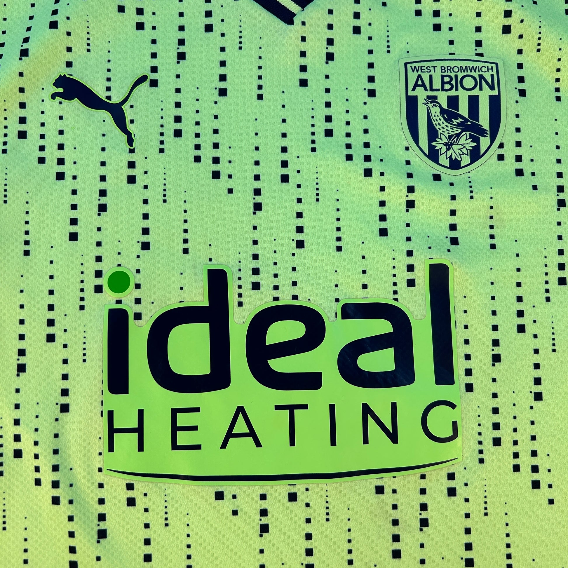 Shirt info: This is the West Brom home shirt for the 23/24 season. It is a bold green design from Puma with front Ideal Heating sponsorship with a matching green background.