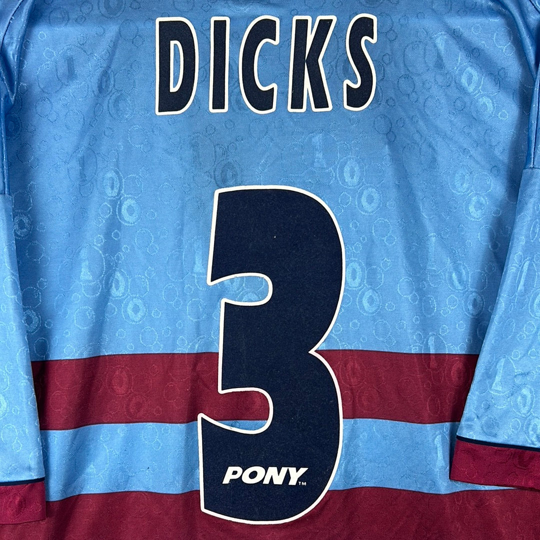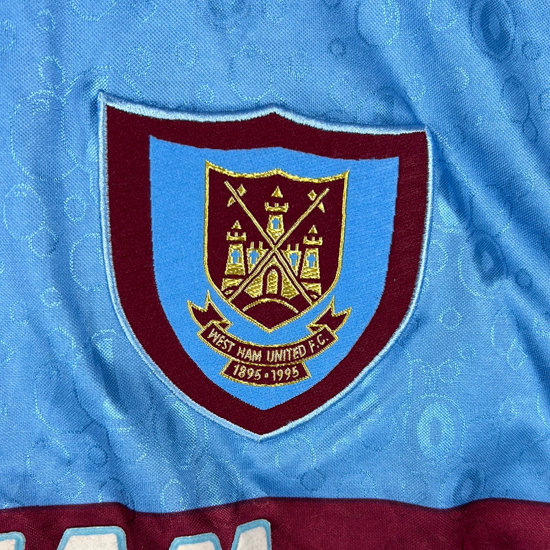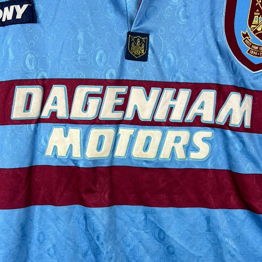 Shirt info: The West Ham United sky blue away shirt worn during the 1995-1996 and as the third shirt in the following 1996-1997 Premier League seasons. The shirt features; a West Ham badge which is a patch, an embroidered Pony logo and a felt 'Dagenham Motors' sponsor. The shirt has a contrast collar in claret. The back has 'Dicks 3' printed in felt.