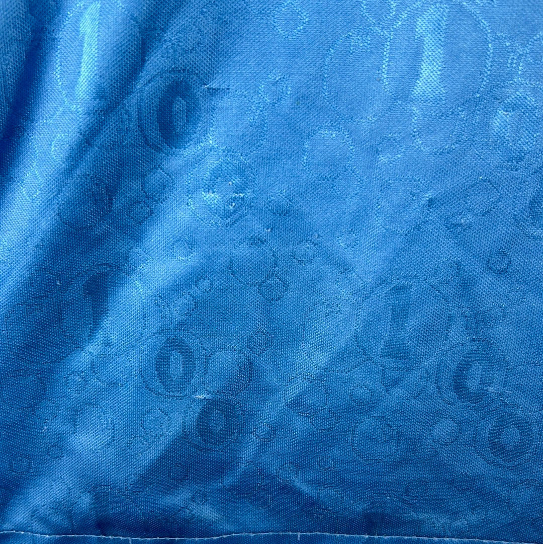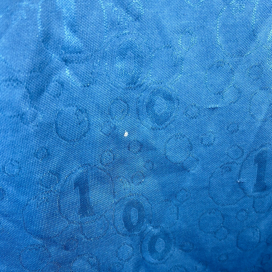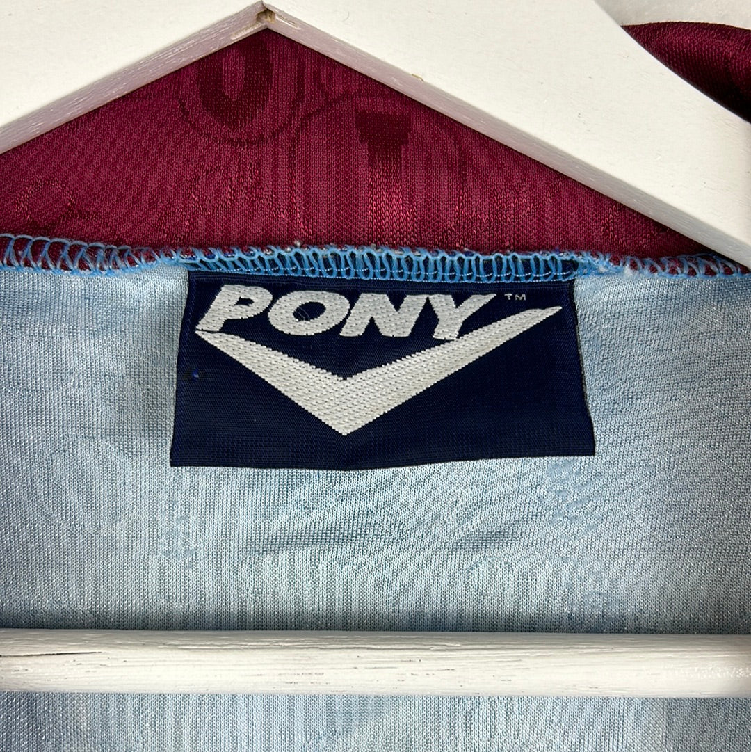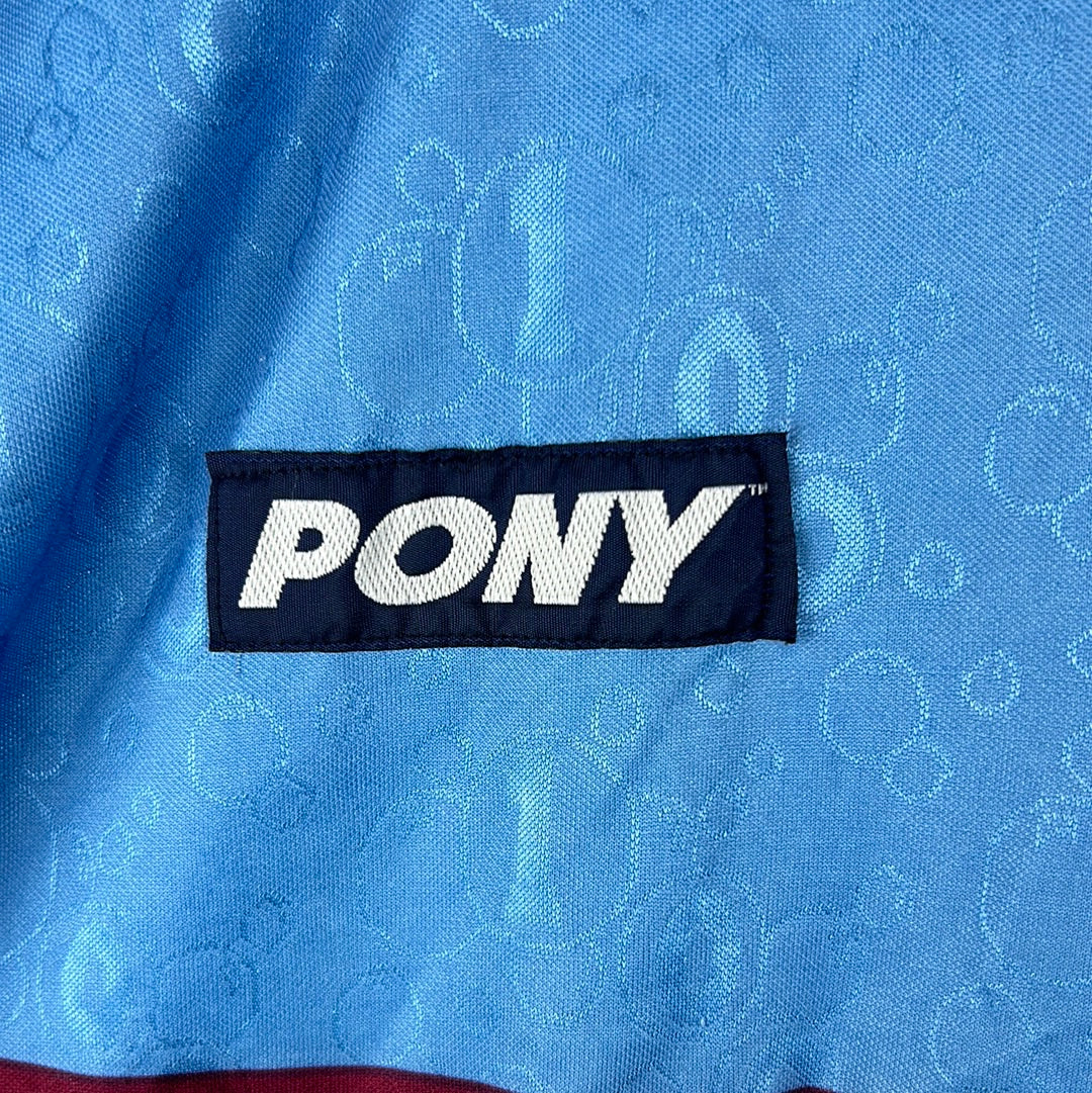 Shirt info: The West Ham United sky blue away shirt worn during the 1995-1996 and as the third shirt in the following 1996-1997 Premier League seasons. The shirt features; a West Ham badge which is a patch, an embroidered Pony logo and a felt 'Dagenham Motors' sponsor. The shirt has a contrast collar in claret. The back has 'Dicks 3' printed in felt.