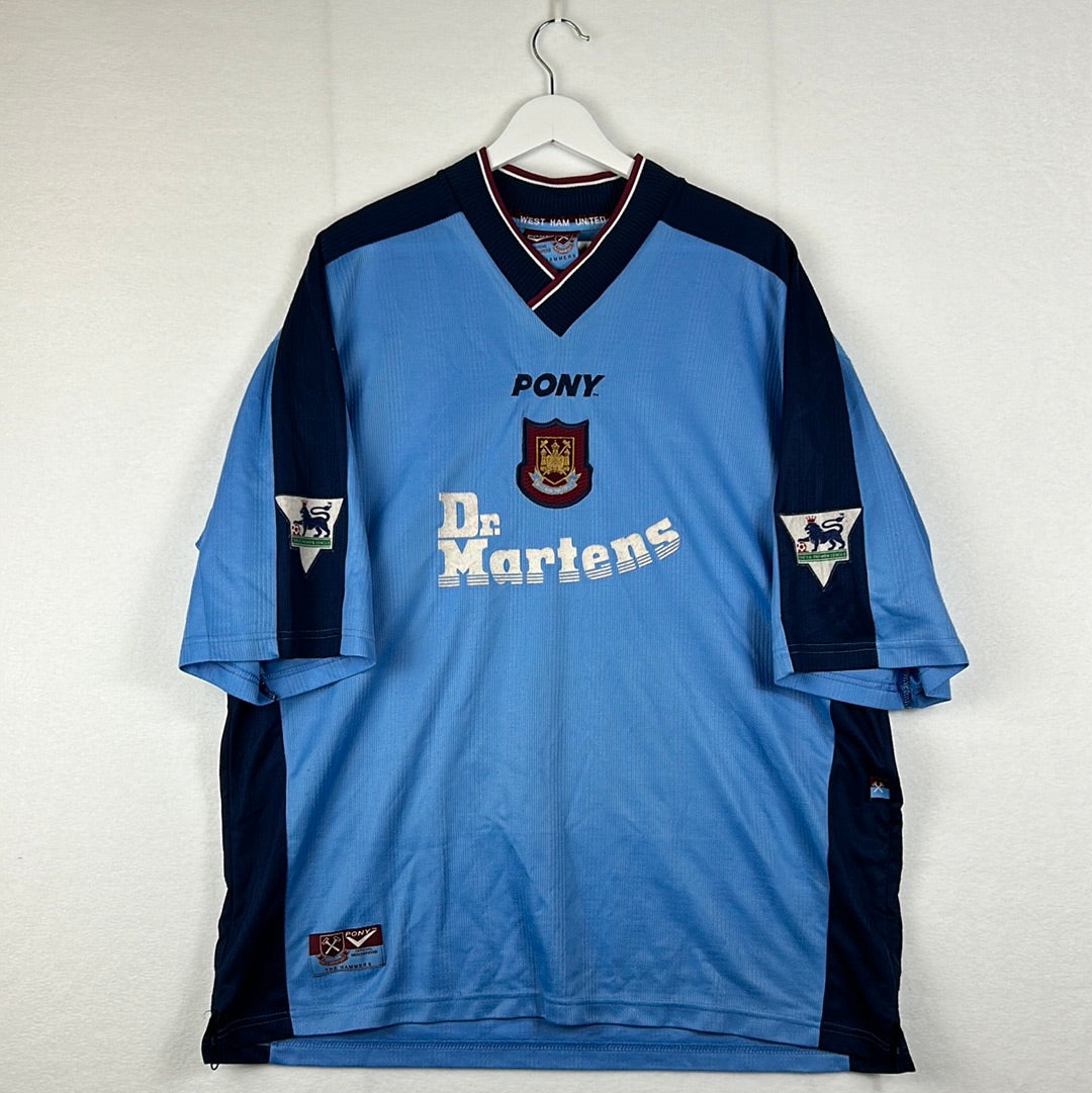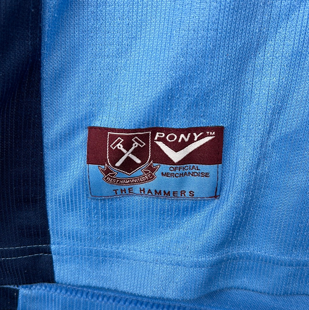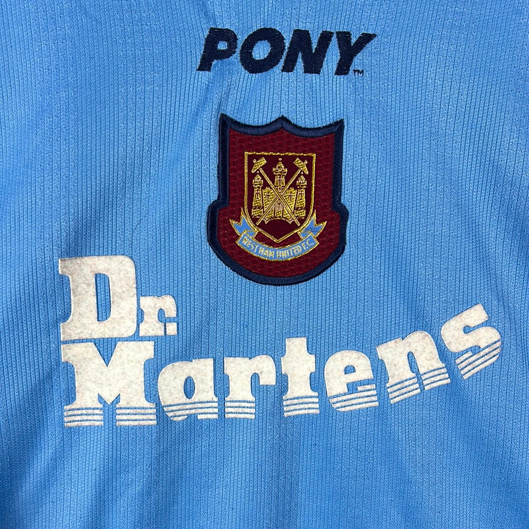 Shirt info: The West Ham United sky blue third shirt worn during the 1998-1999 Premier League season. The same shirt was worn as the away shirt in the season prior, however West Ham announced a sponsorship deal with boot maker Dr. Martens in 1998. The shirt features; a West Ham badge which is a patch, an embroidered Pony logo and a felt 'Dr. Martens' sponsor. The back has 'Hartson 10' printed in Lextra felt.
