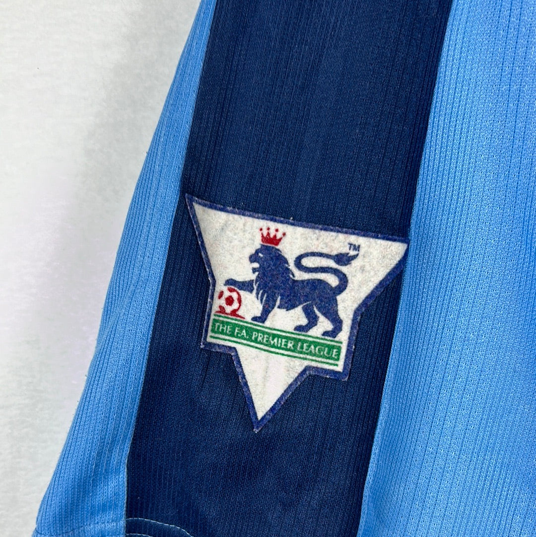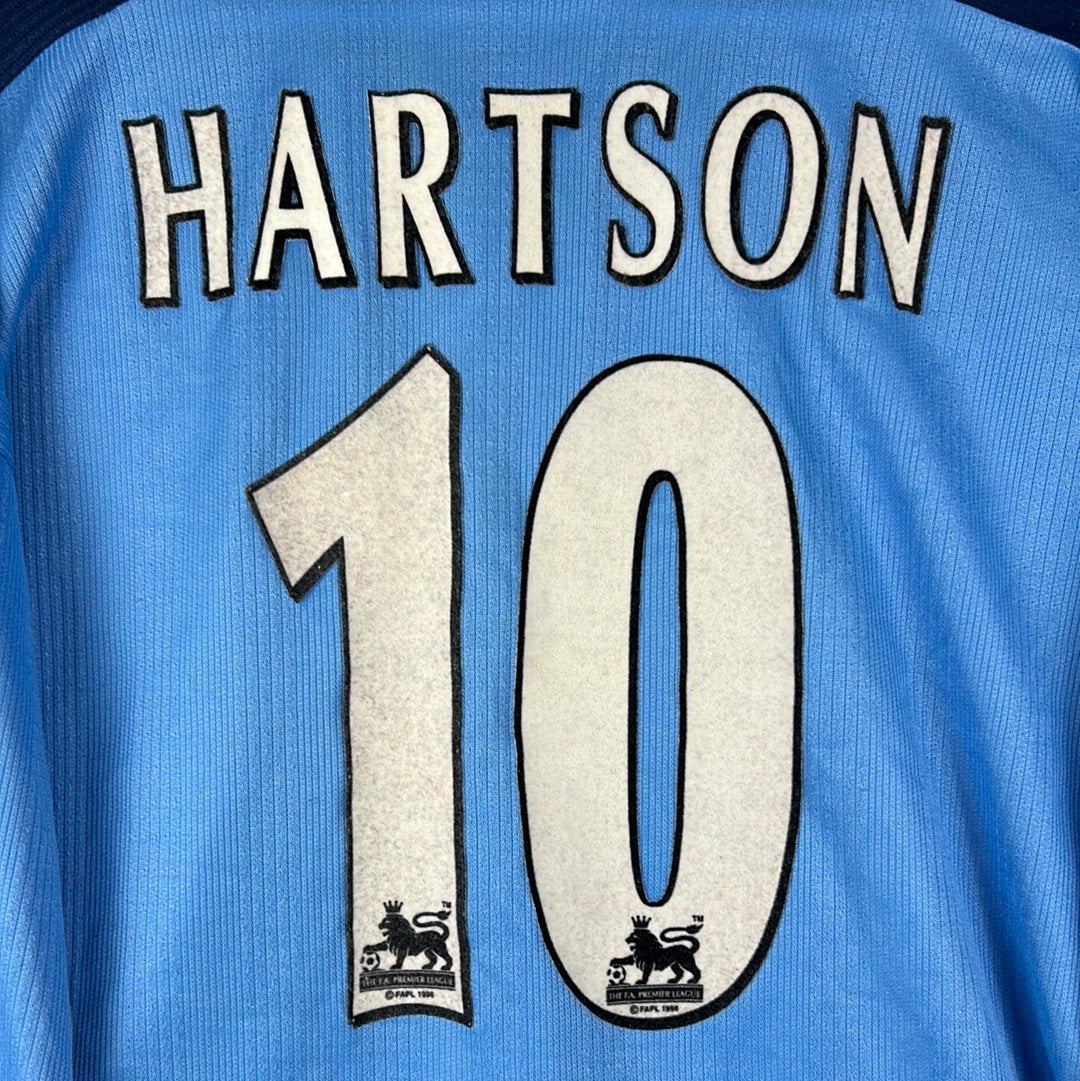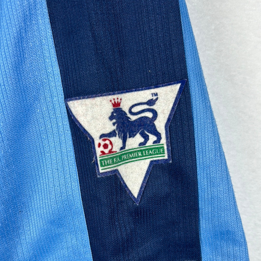 Shirt info: The West Ham United sky blue third shirt worn during the 1998-1999 Premier League season. The same shirt was worn as the away shirt in the season prior, however West Ham announced a sponsorship deal with boot maker Dr. Martens in 1998. The shirt features; a West Ham badge which is a patch, an embroidered Pony logo and a felt 'Dr. Martens' sponsor. The back has 'Hartson 10' printed in Lextra felt.