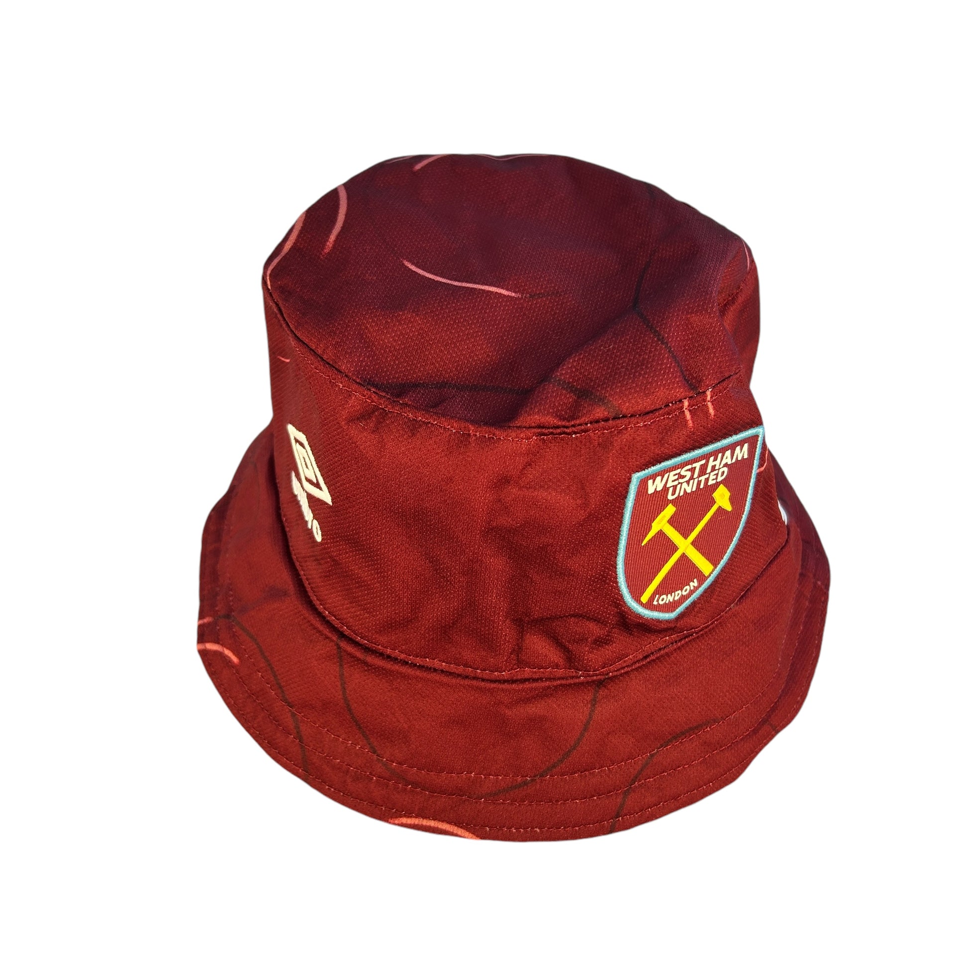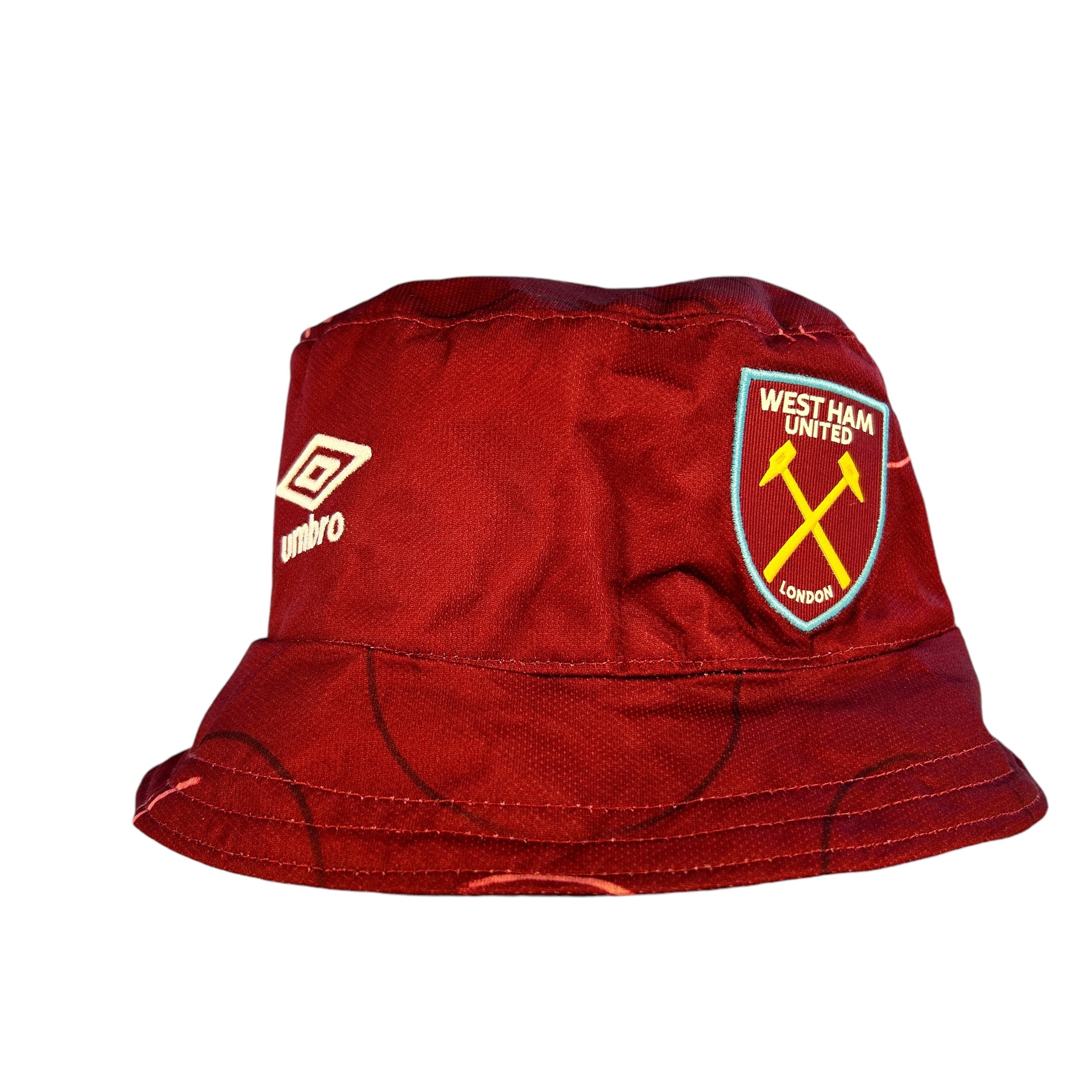 Bucket Hat Info: This is a custom bucket hat from a West Ham Umbro home shirt. It has the West Ham badge on the side as well as the Umbro logo. The hat is Burgundy with light blue touches.