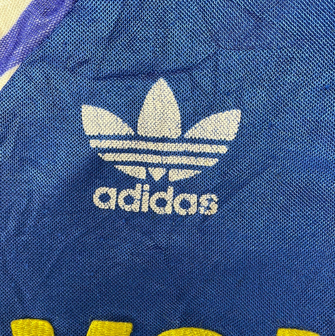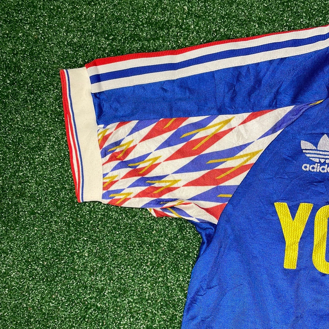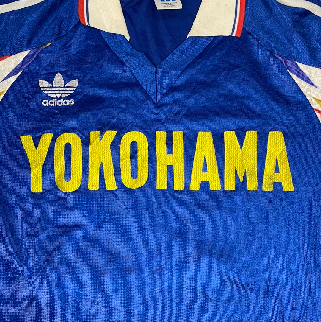 Shirt info: This is the shirt design used in 1992 by the Yokohama Marinos. It does not have the badge but has YOKOHAMA in fabric letters and the classic 1990s Adidas badge on the front. This is a fantastic design.