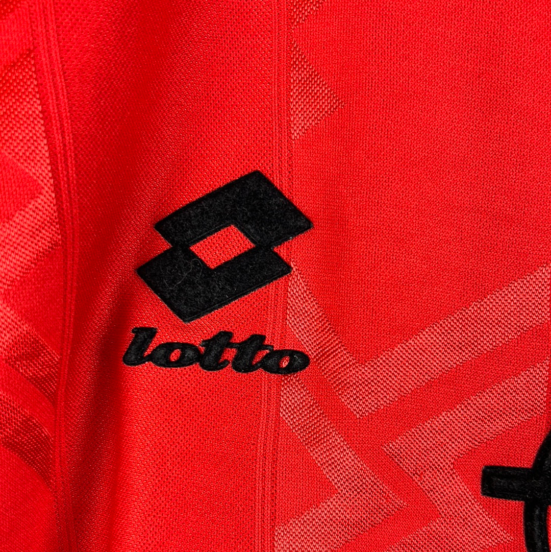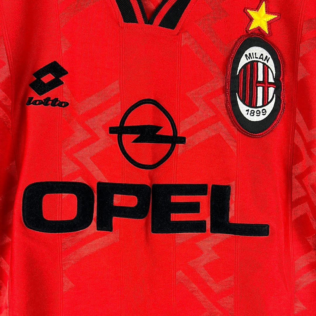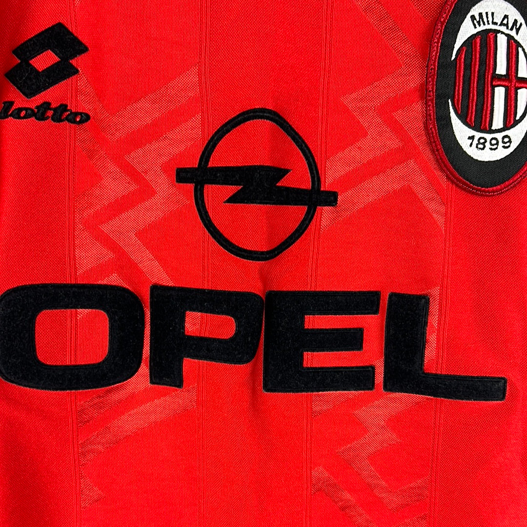 Shirt info: An AC Milan fourth shirt from the 1996/1997 season with the classic Opel sponsorship. This is a plain red shirt with black detailing. The shirt has patterning sublimated into the material, this is a fantastic shirt.