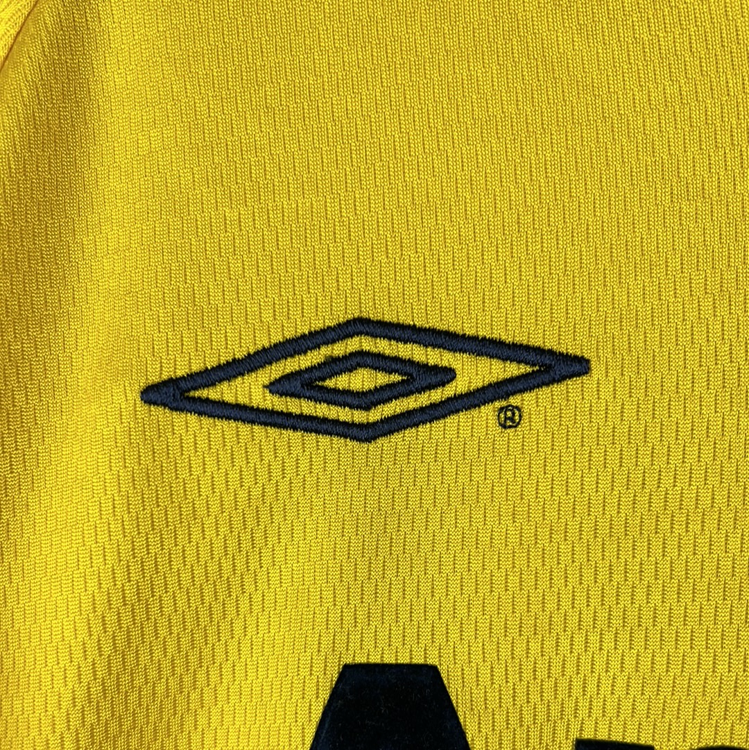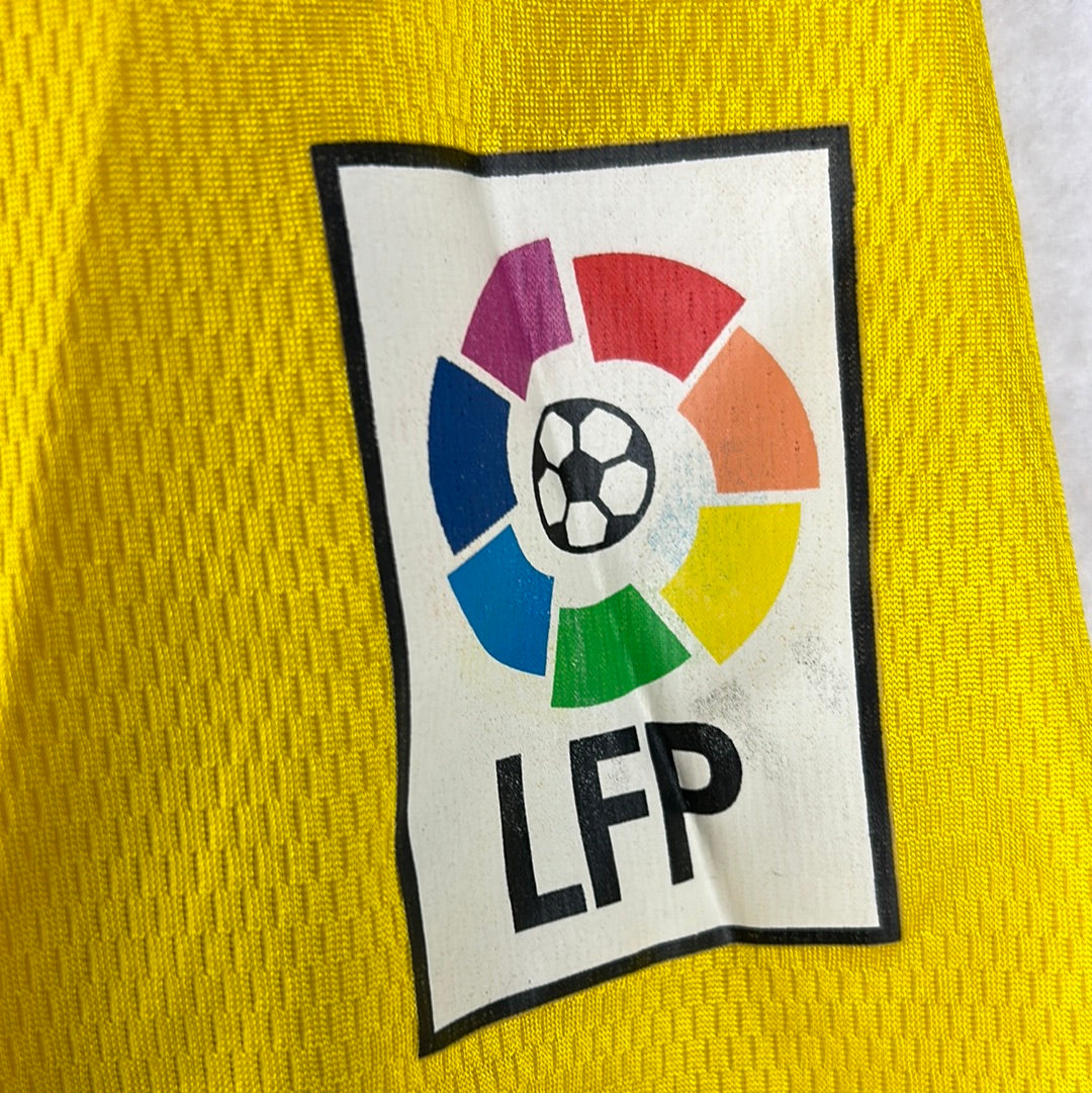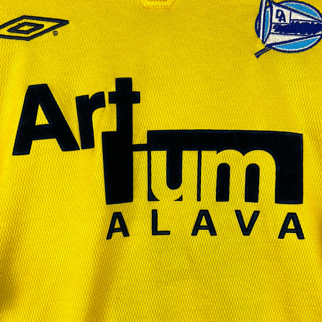 Shirt info: The yellow away shirt Alaves wore during the 2002-2003 La Liga season. This particular shirt was issued to Tellez during the away La Liga match on 6/10/2002 vs Real Madrid, in which they lost 5-2. The Alaves badge and Umbro logo are embroidered and the 'Artium Alava' sponsor is raised felt. The 'Alava.net' and La Liga sleeve patches are printed. 'Tellez 6' is printed on the back in black flock.