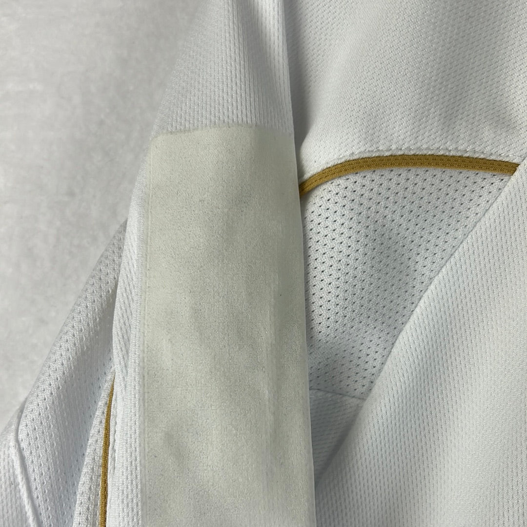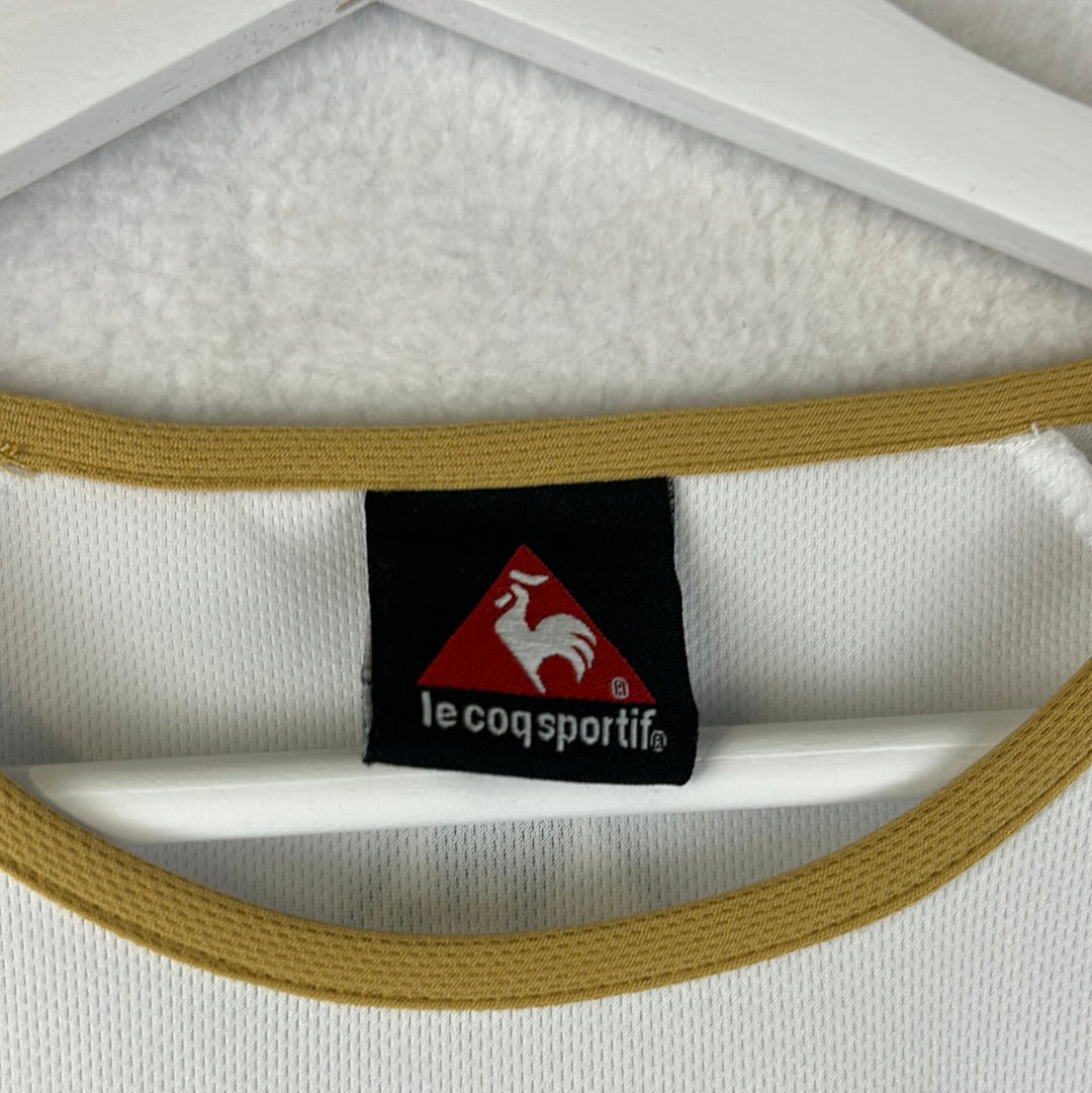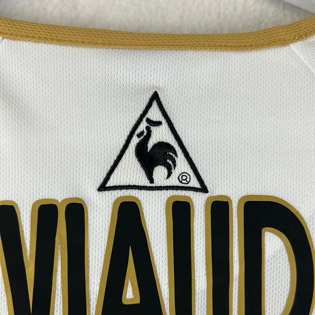 Shirt info: The 2004-2005 home shirt worn by Albacete in La Liga. The shirt is match worn by Viaud against Real Madrid during the home match on 3/4/2005 which they lost 1-2. Please note this shirt has been laundered since the match. The La Liga 'LFP' badge on the sleeve has come off the shirt, most likely when it was washed. It has a printed sponsor and embroidered Albacete badge and Le Coq Sportif patches on the sleeves. 'Viaud 4' is printed on the back in black and gold.