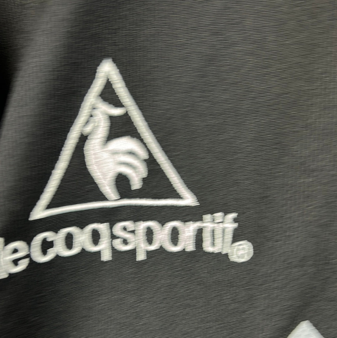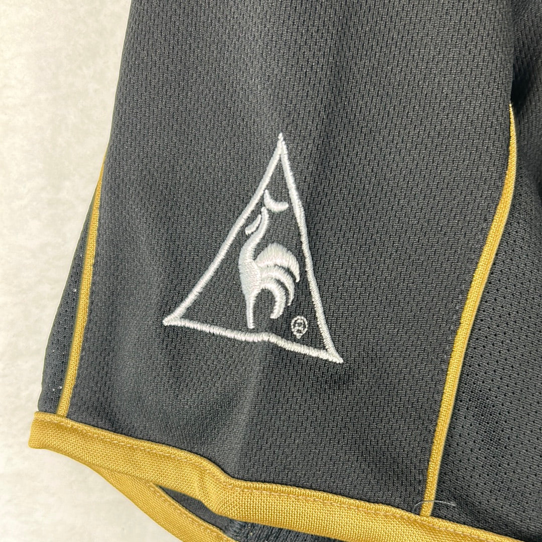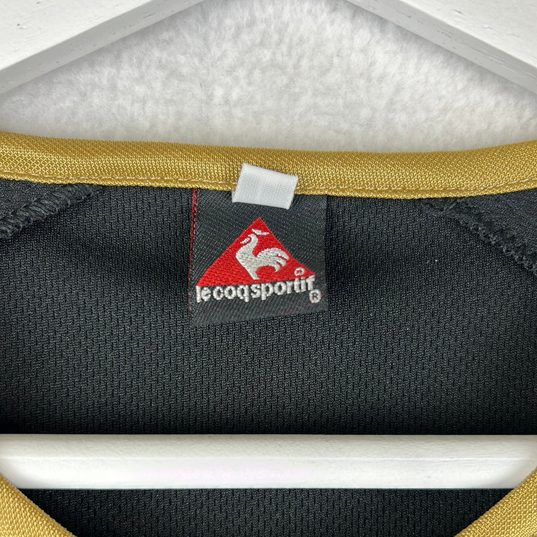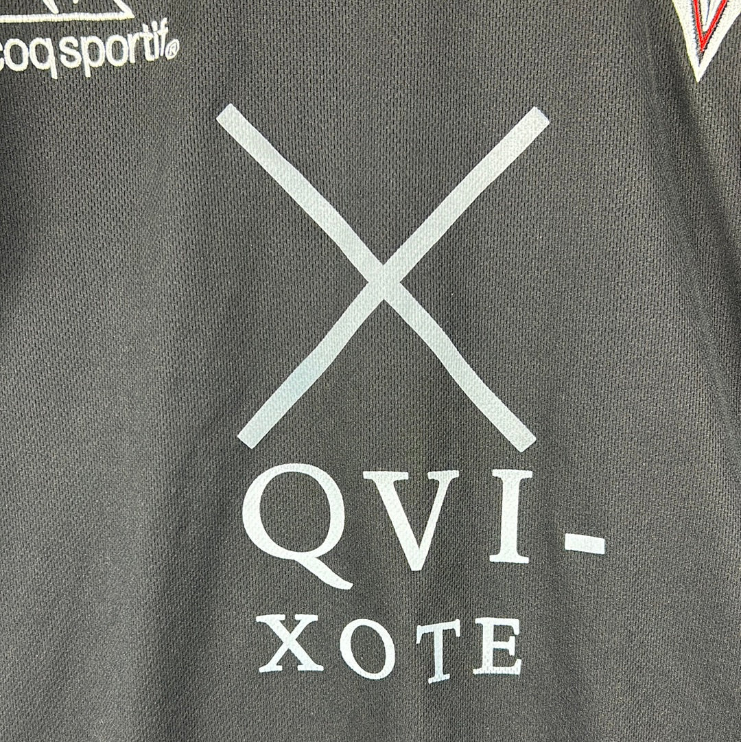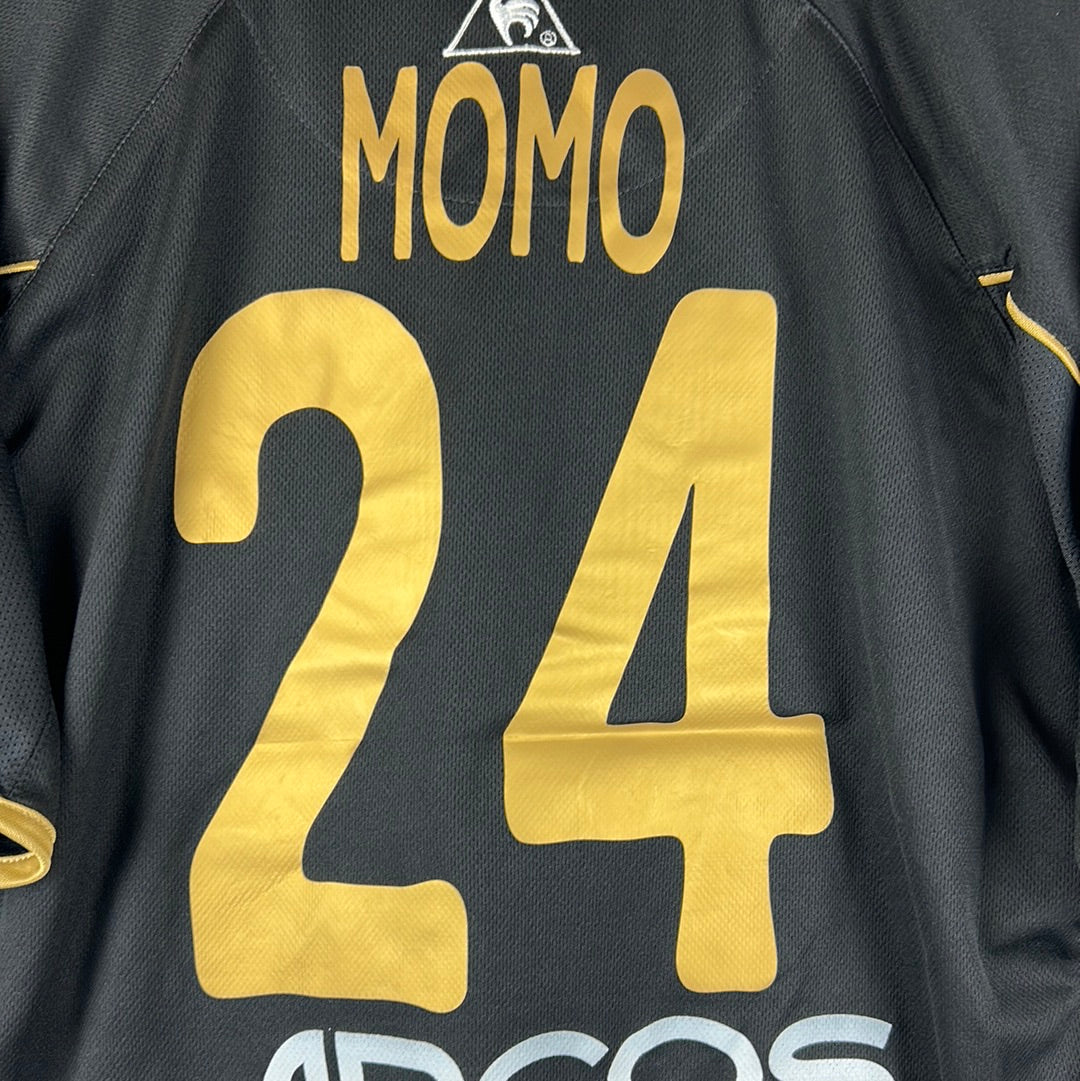 Shirt info: The 2004-2005 away shirt worn by Albacete in La Liga. This specific shirt was match issued to Momo vs Real Madrid. The Albacete badge and Le Coq Sportif logo are embroidered. The La Liga 'LFP' badge on the sleeve is a patch. It has a printed 'QVI-XOTE' sponsor. The 'Momo 24' name set on the back is printed in gold.