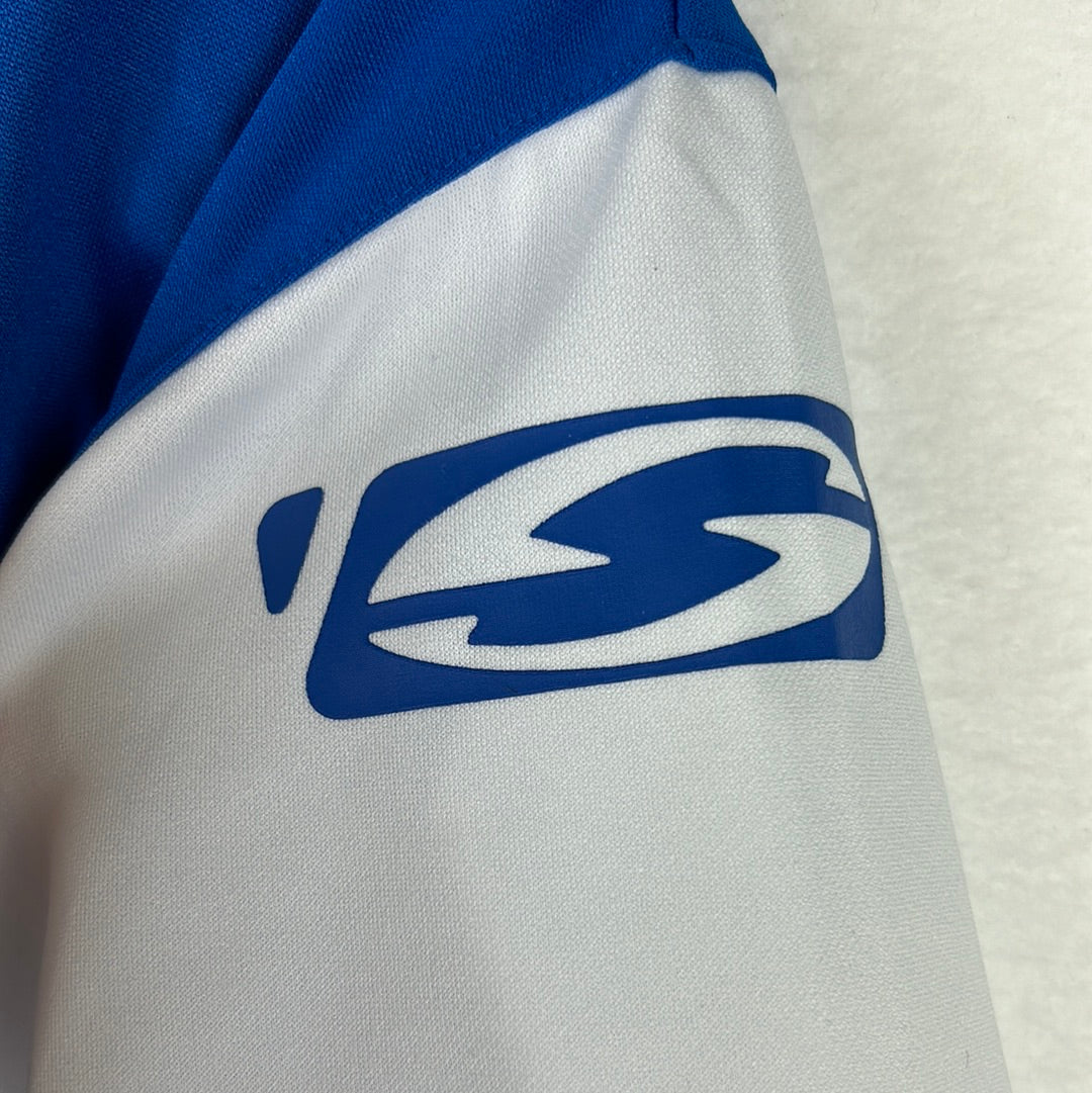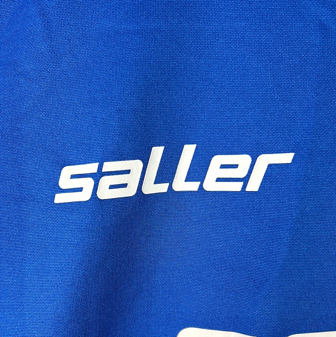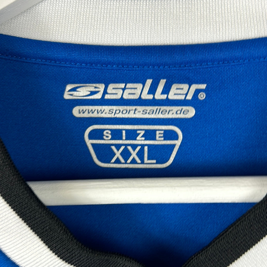 Shirt info: The home shirt for Arminia Bielefeld in the 2017/2018 season. A blue shirt with white and black trim. The SALLER logo is printed as is the Schuco sponsor. The badge is in a felt material.
