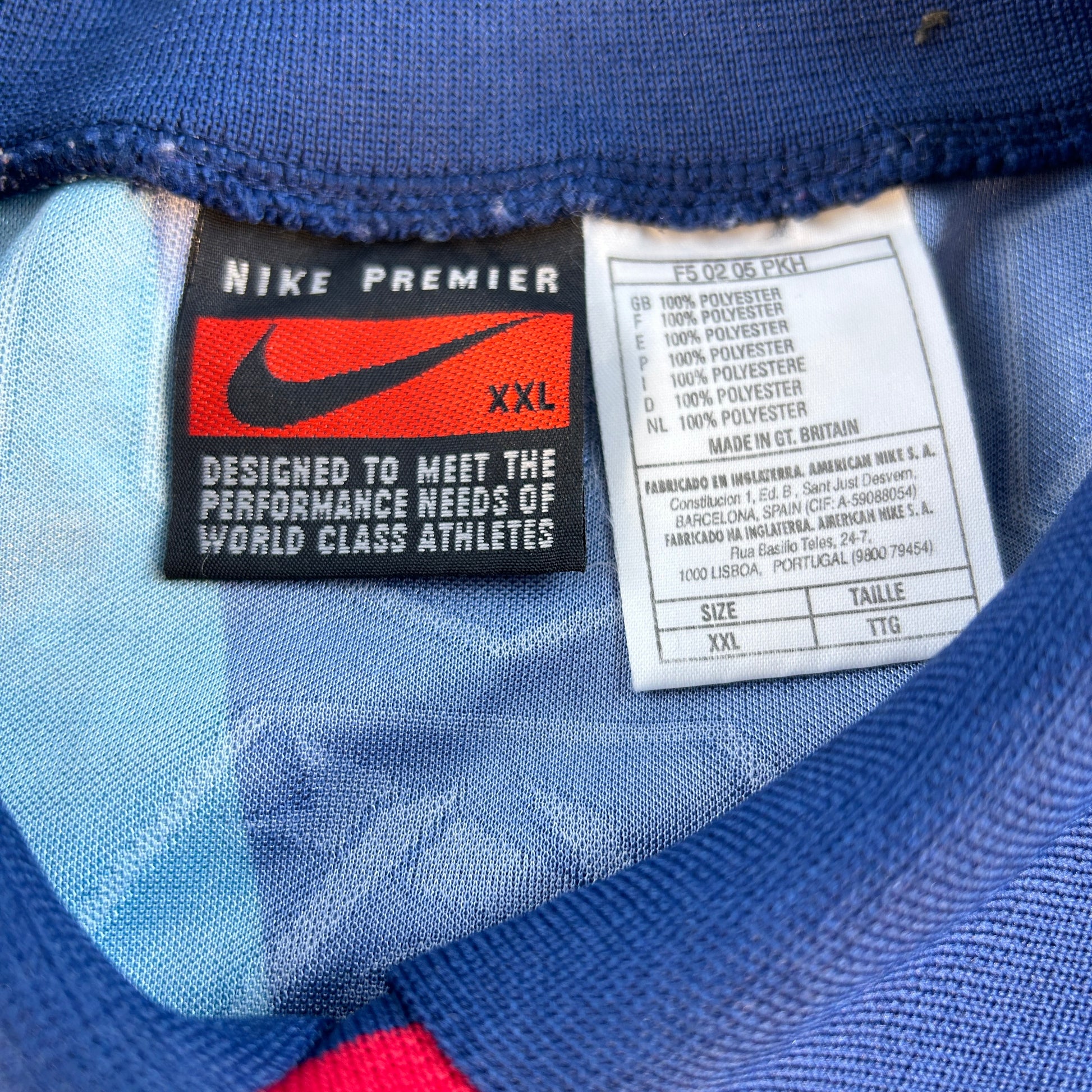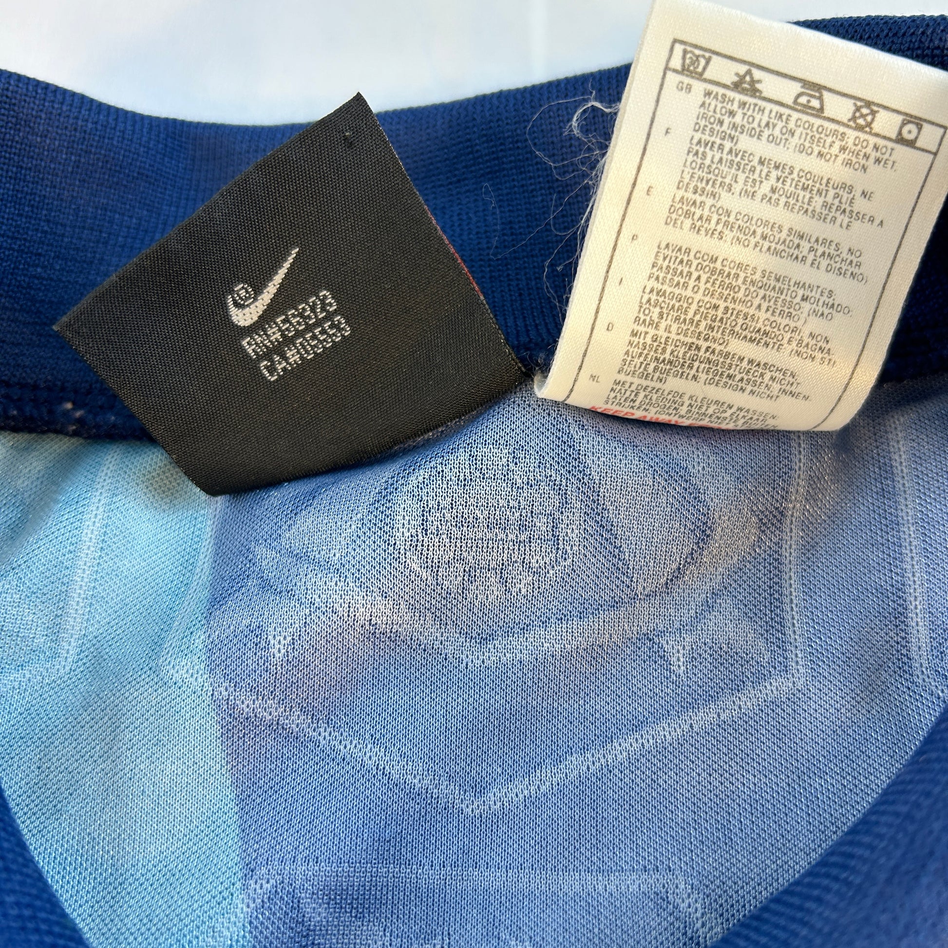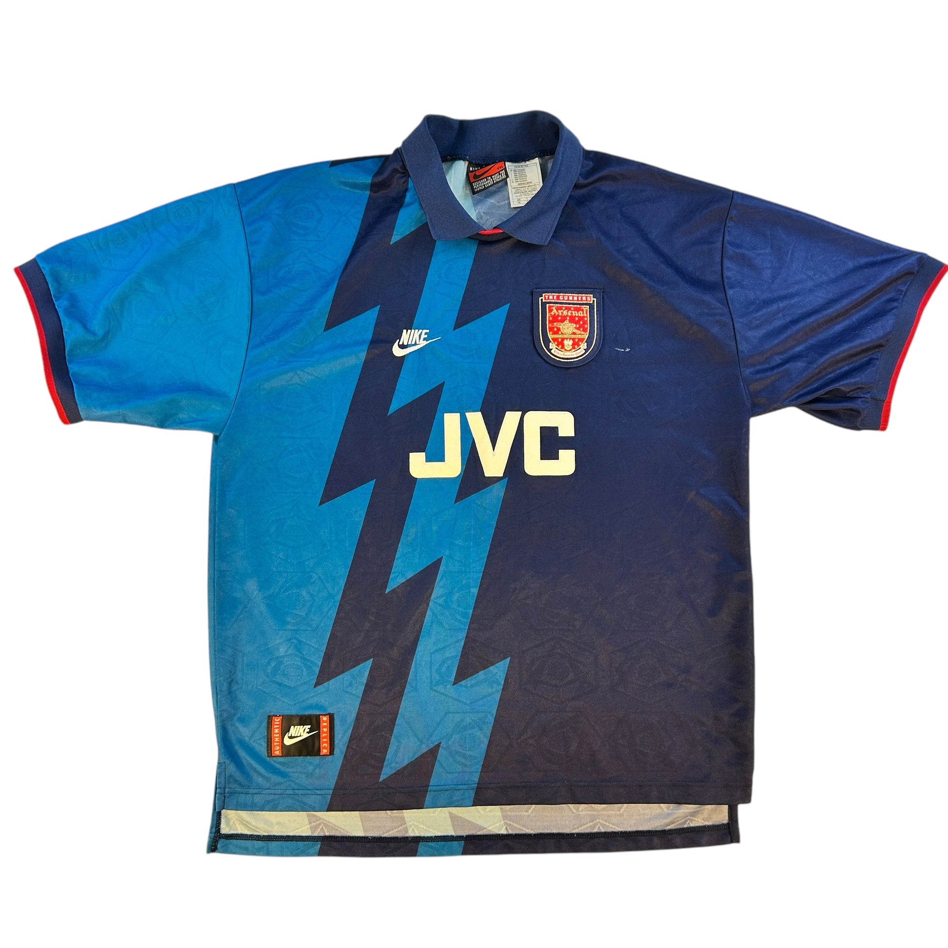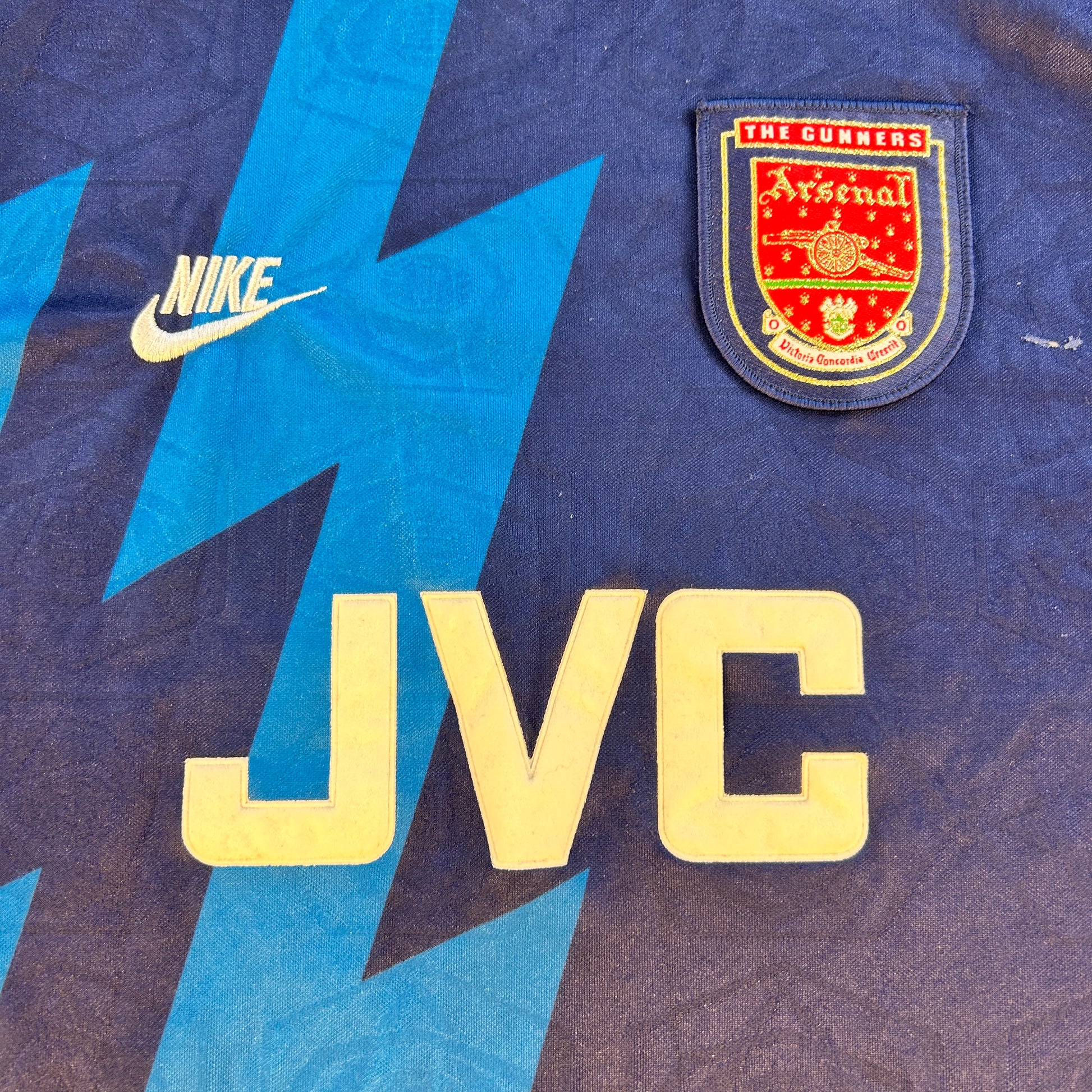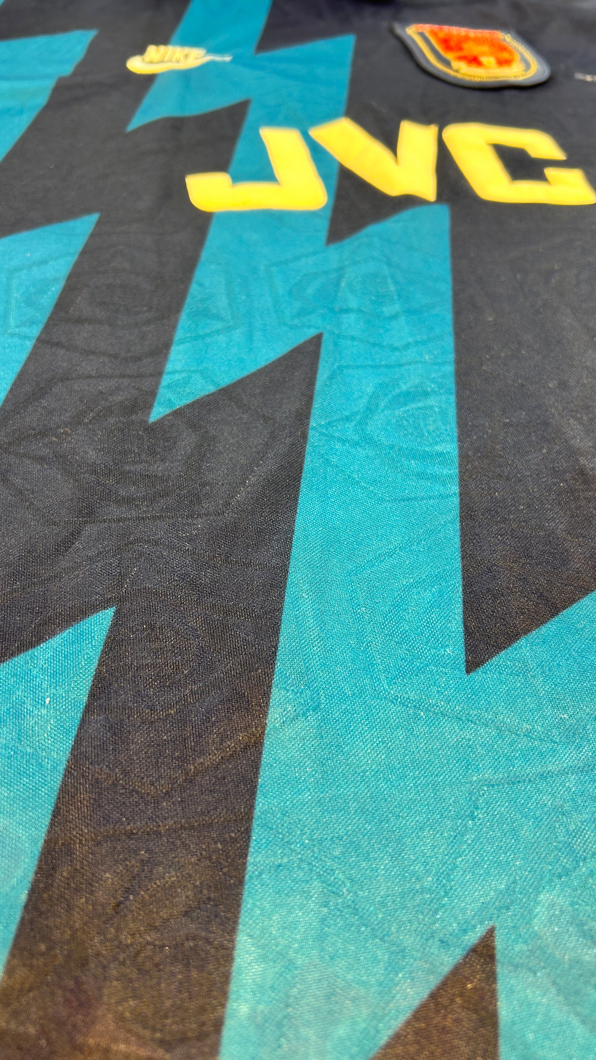 Shirt info: A funky lightning bolt strike shirt. This has contrasting light blue collar and sleeve patches. As well as the lightning strikes it has Gunners in the material stripes also. This is one of the most iconic vintage Arsenal shirts from the 1990s.