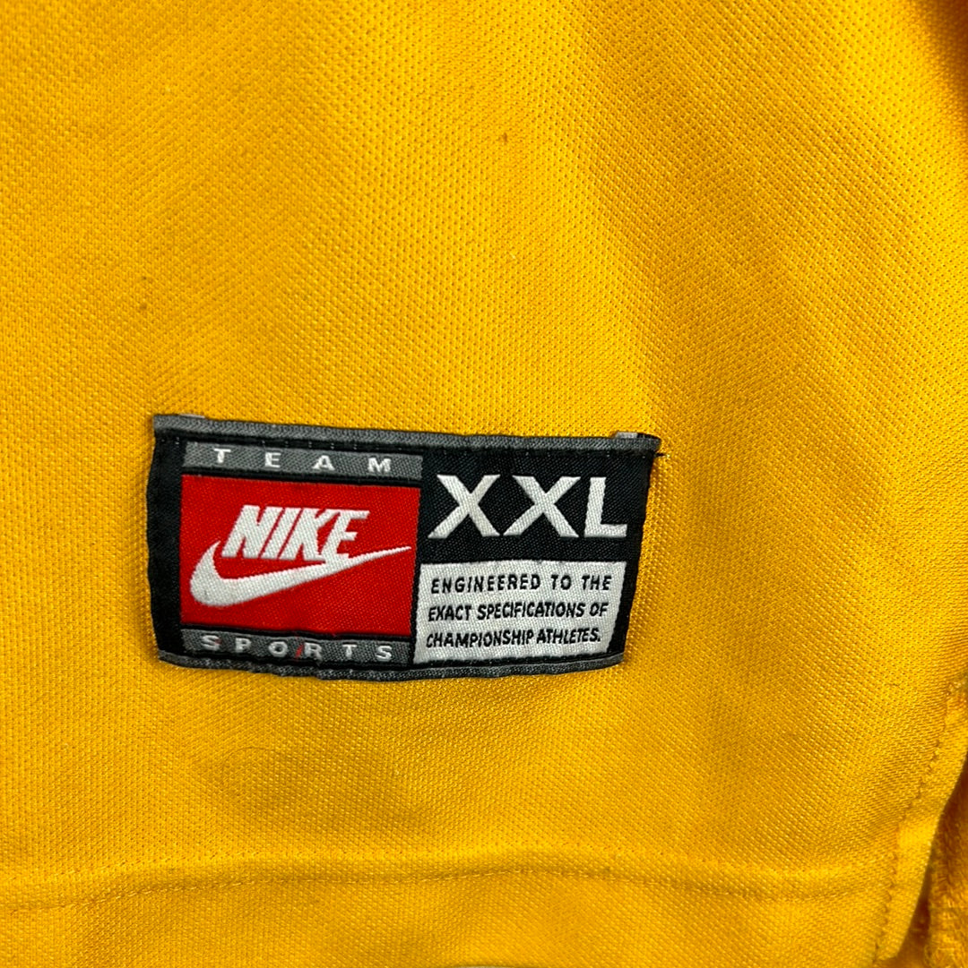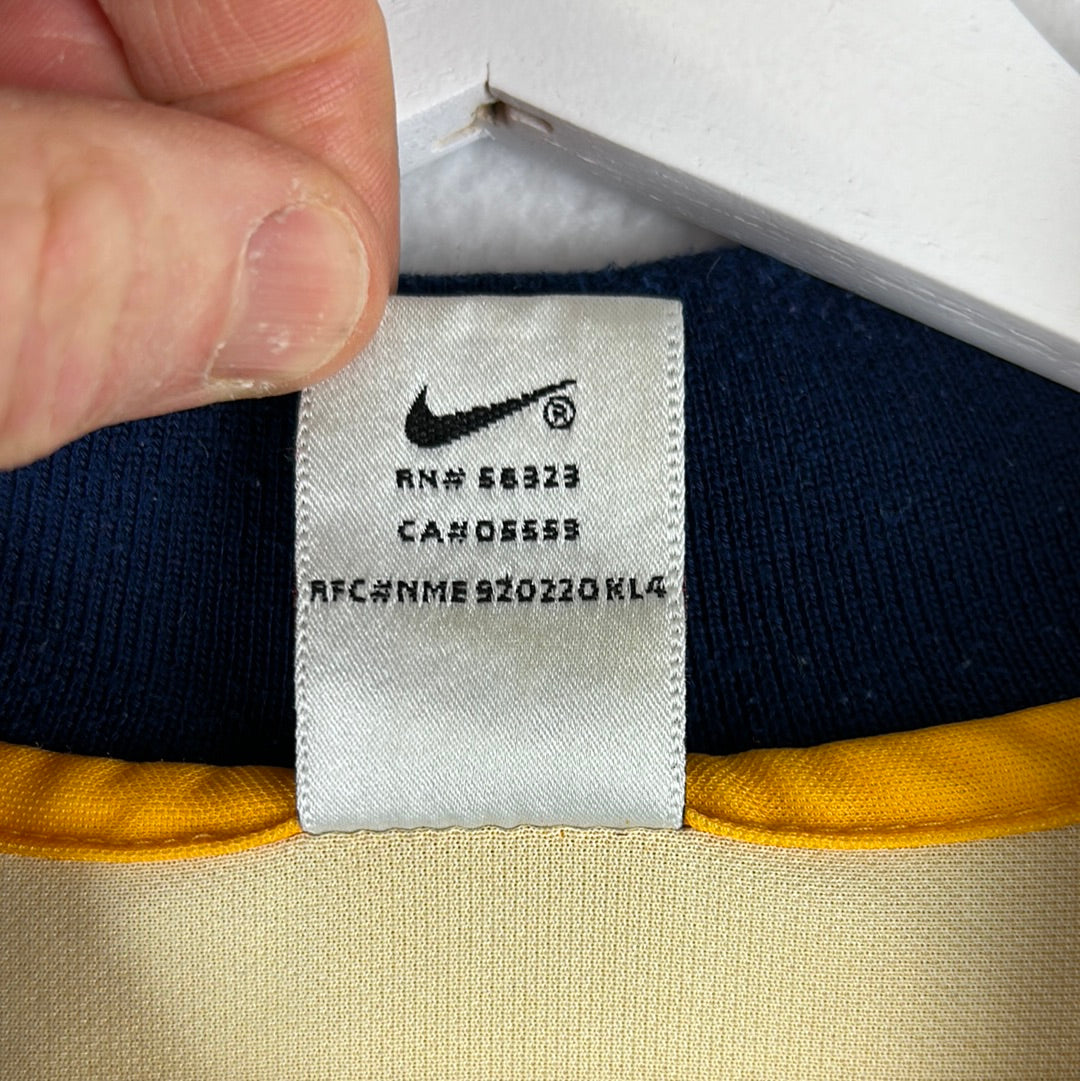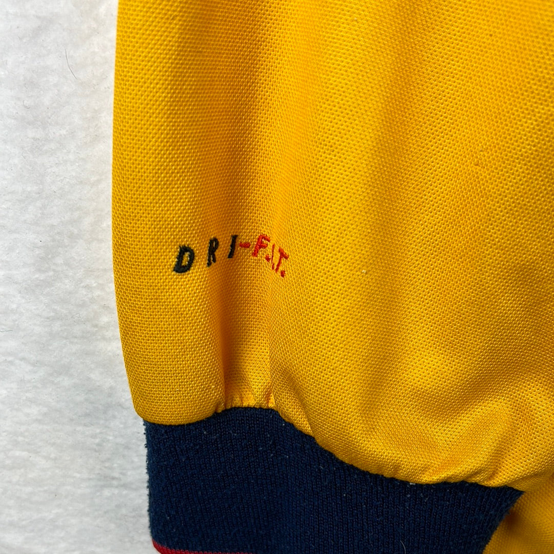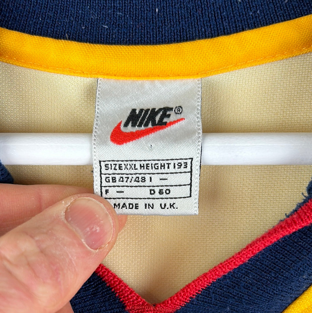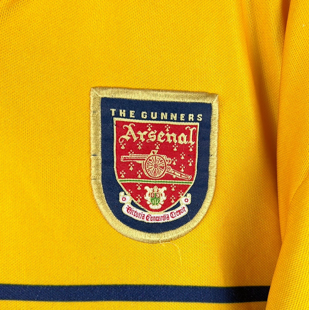 Shirt info: The amber and navy Arsenal away shirt was worn during the 1998-1999 season and then again in the 1999-2000 Premier League seasons. An absolute classic Arsenal shirt from their late 1990s peak. This is a well-looked-after shirt in a very popular design. The Arsenal badge is a patch, the Nike logo is embroidered and the white 'JVC' sponsor is raised. DRI-FIT is embroidered on the lower sleeves.