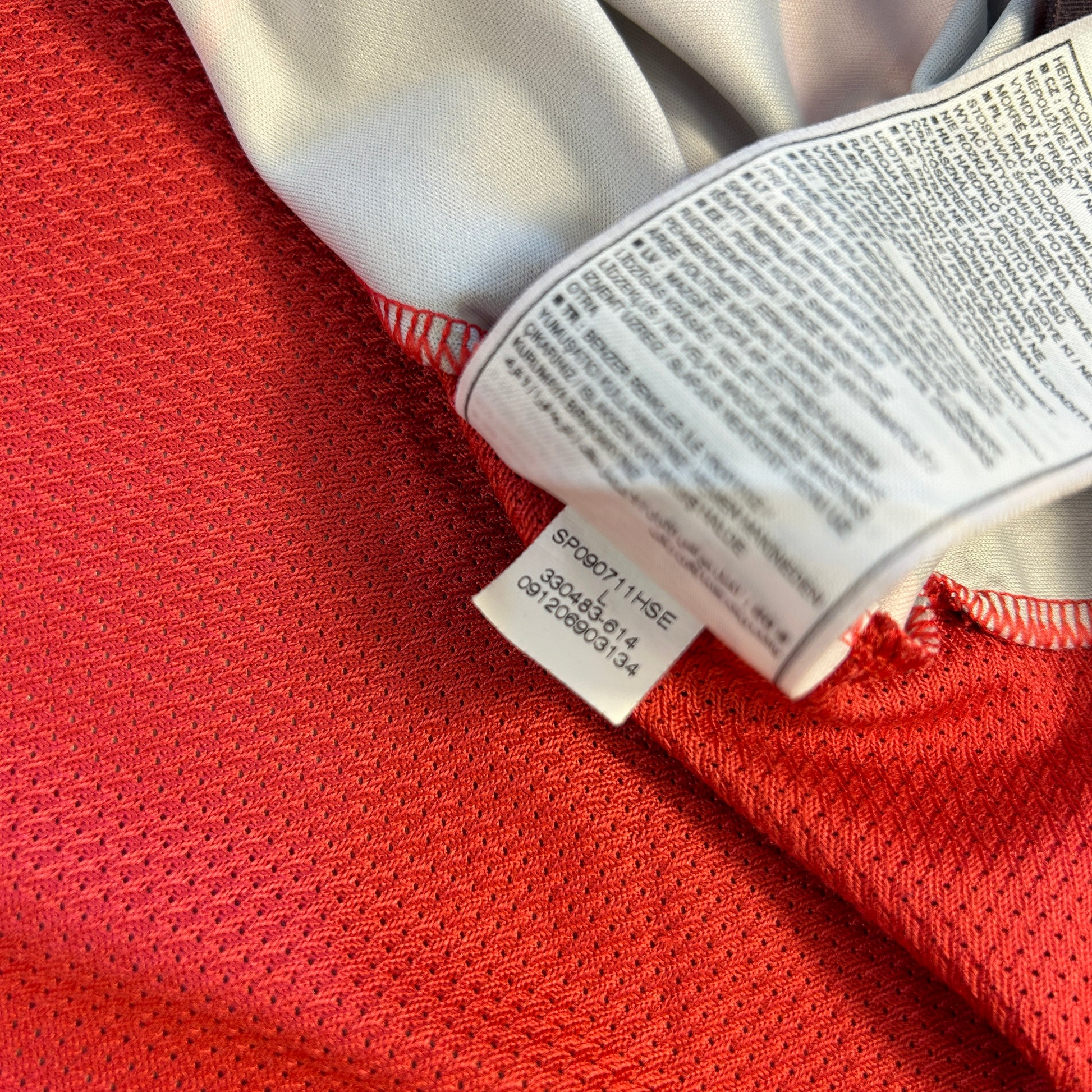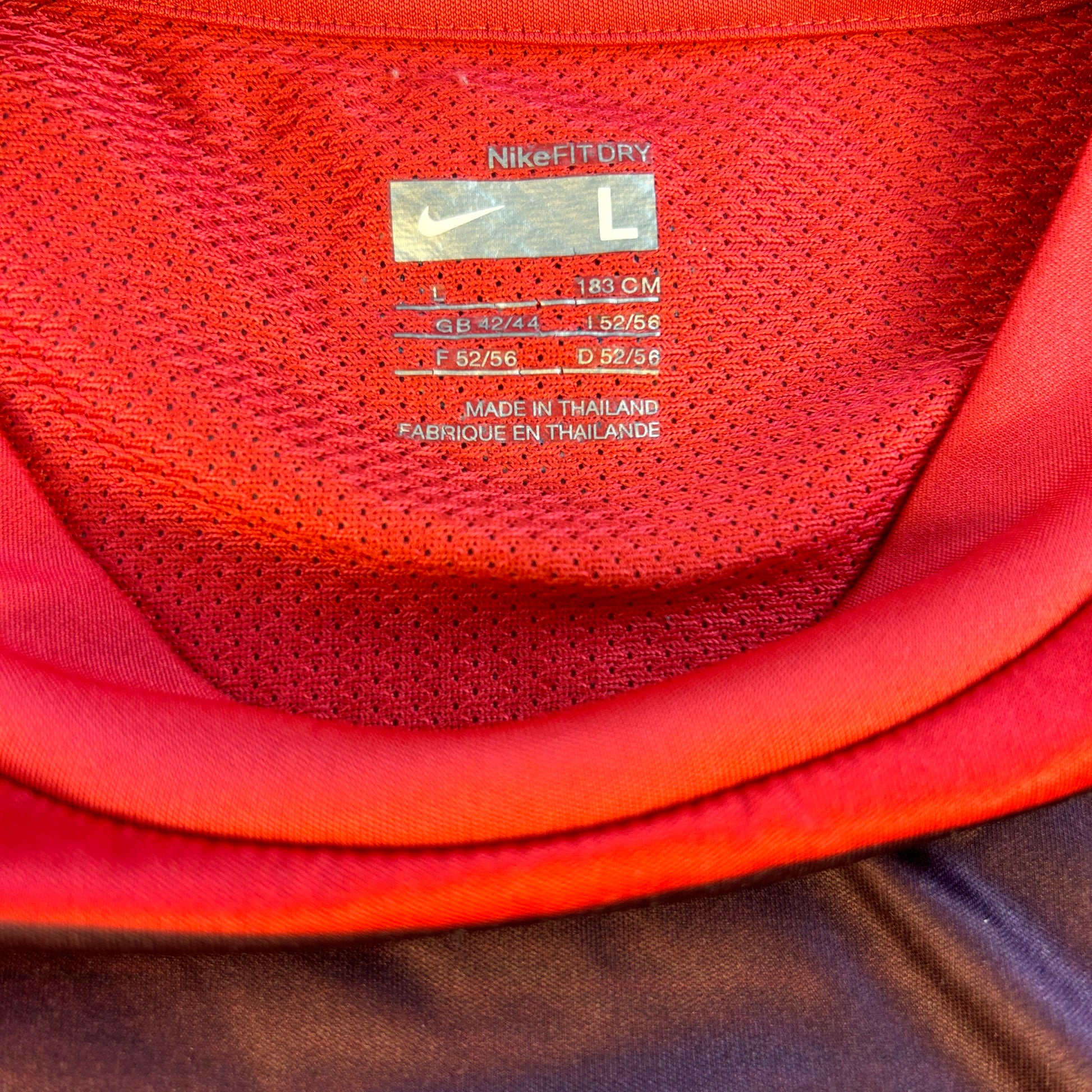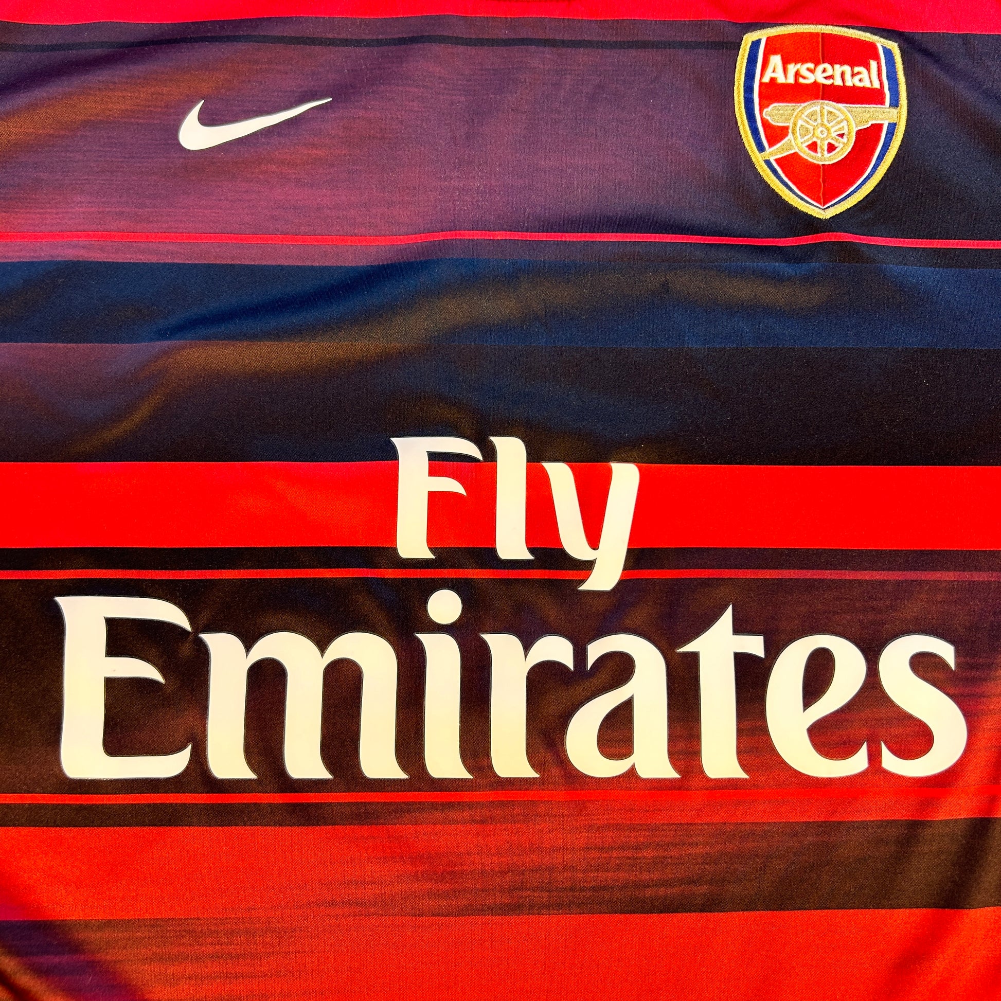 Shirt info: This shirt is an Arsenal Nike training shirt/ pre-match shirt from 08/09. This is a striped shirt with varying degrees of red and darker reds.