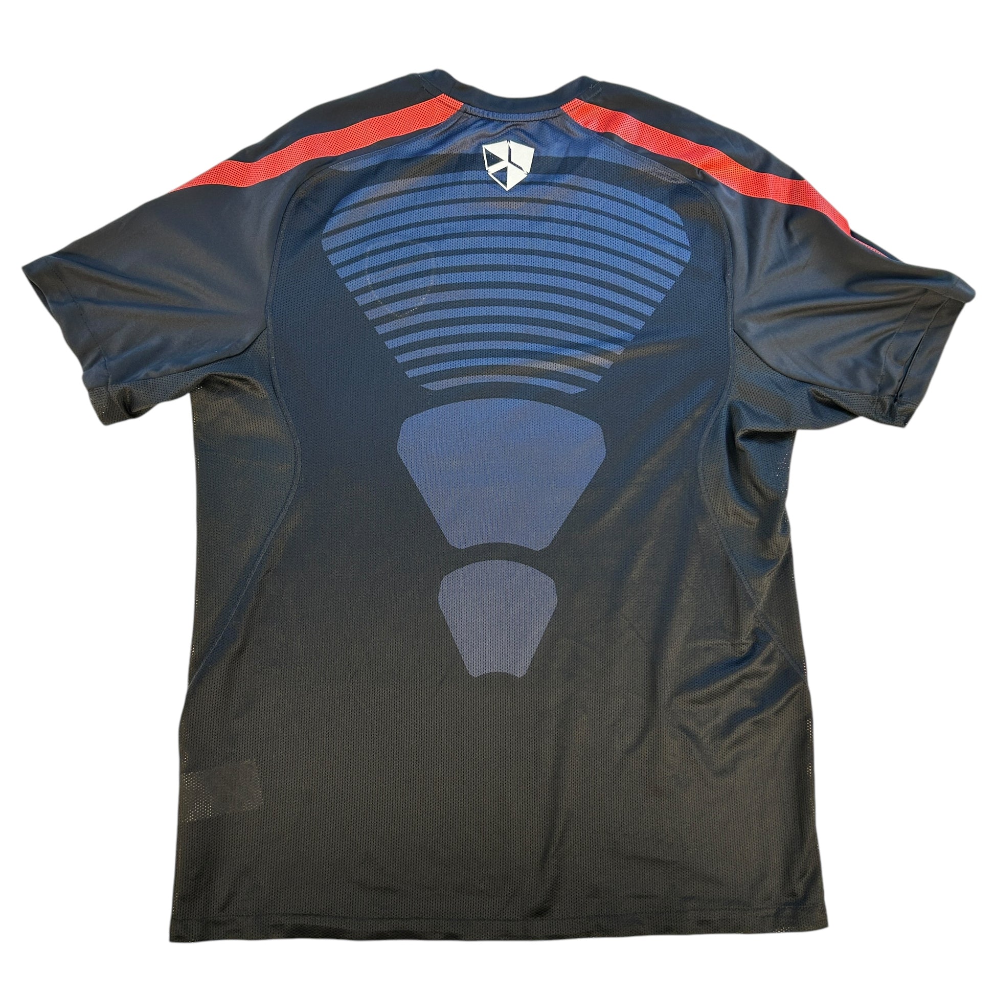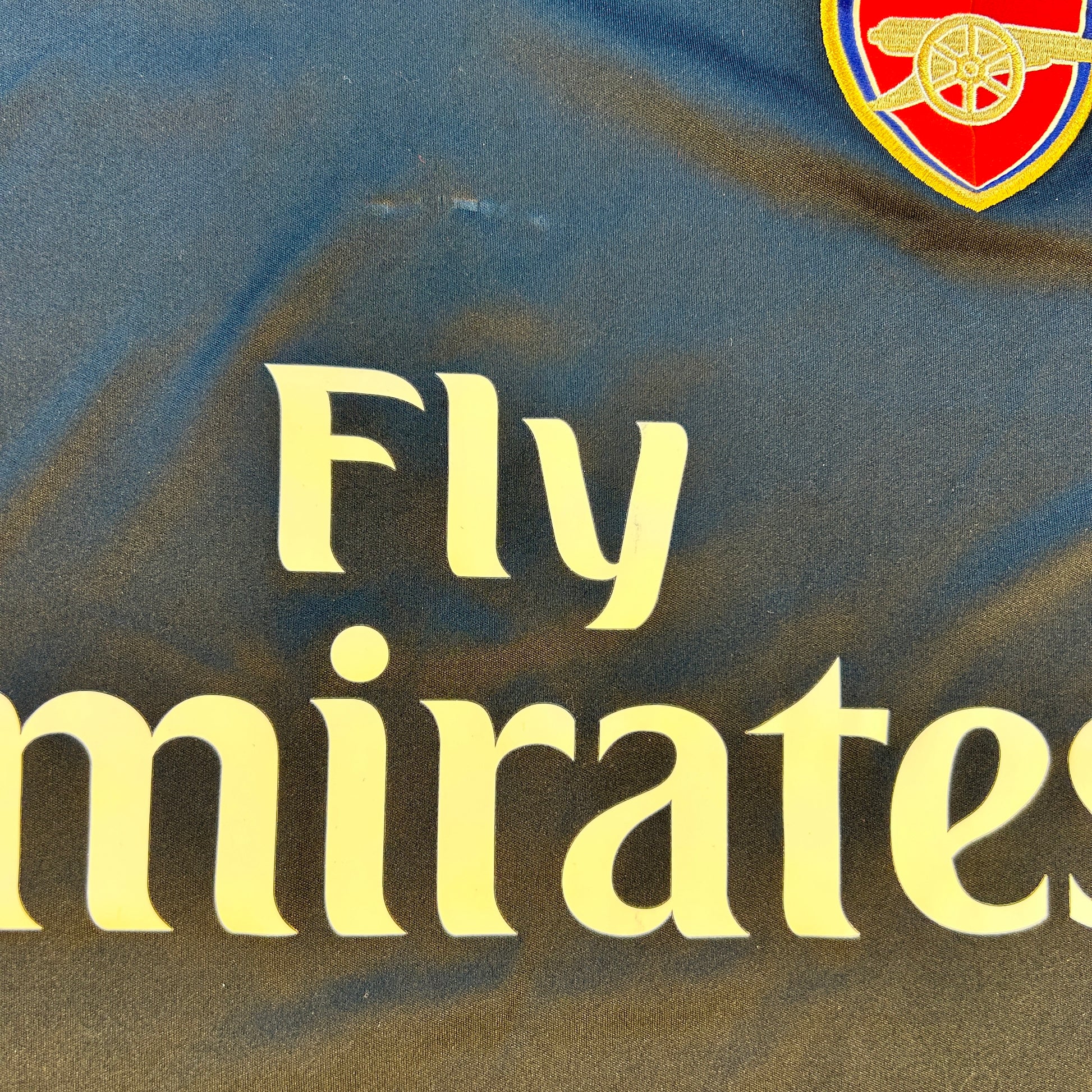 Shirt info: This shirt is an Arsenal Nike training shirt/ pre-match shirt from the 10/11 season. The shirt is dark with red details. The red details are printed on the shirt with a waffle-type design.