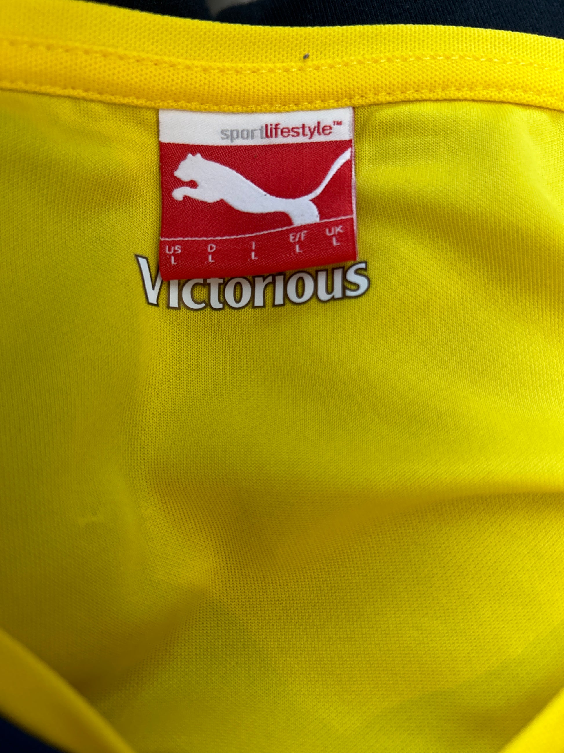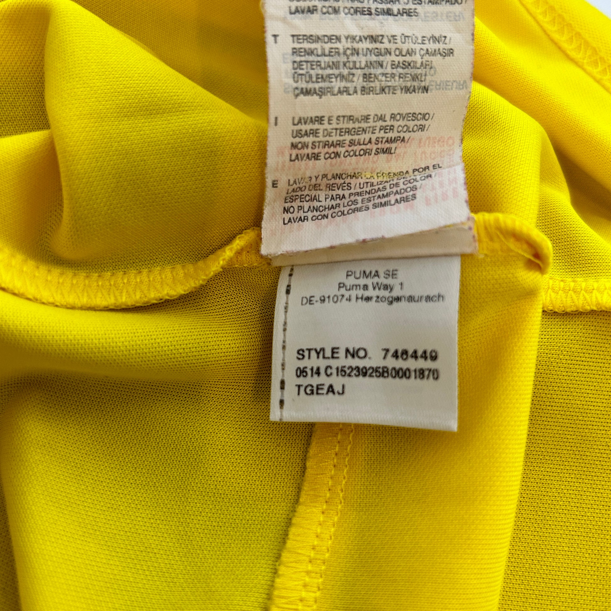 Shirt info: The yellow away shirt for the 2014/2015 season for Arsenal by Puma. The design matches the home shirt from the same season and has the light stripes printed on either side. The yellow top cuff on the sleeves is a nice touch to this design. The period of Arsenal and Puma will not be remembered fondly in Arsenal's shirt history as they never really nailed any of the designs like Nike did before them or Adidas did after them.