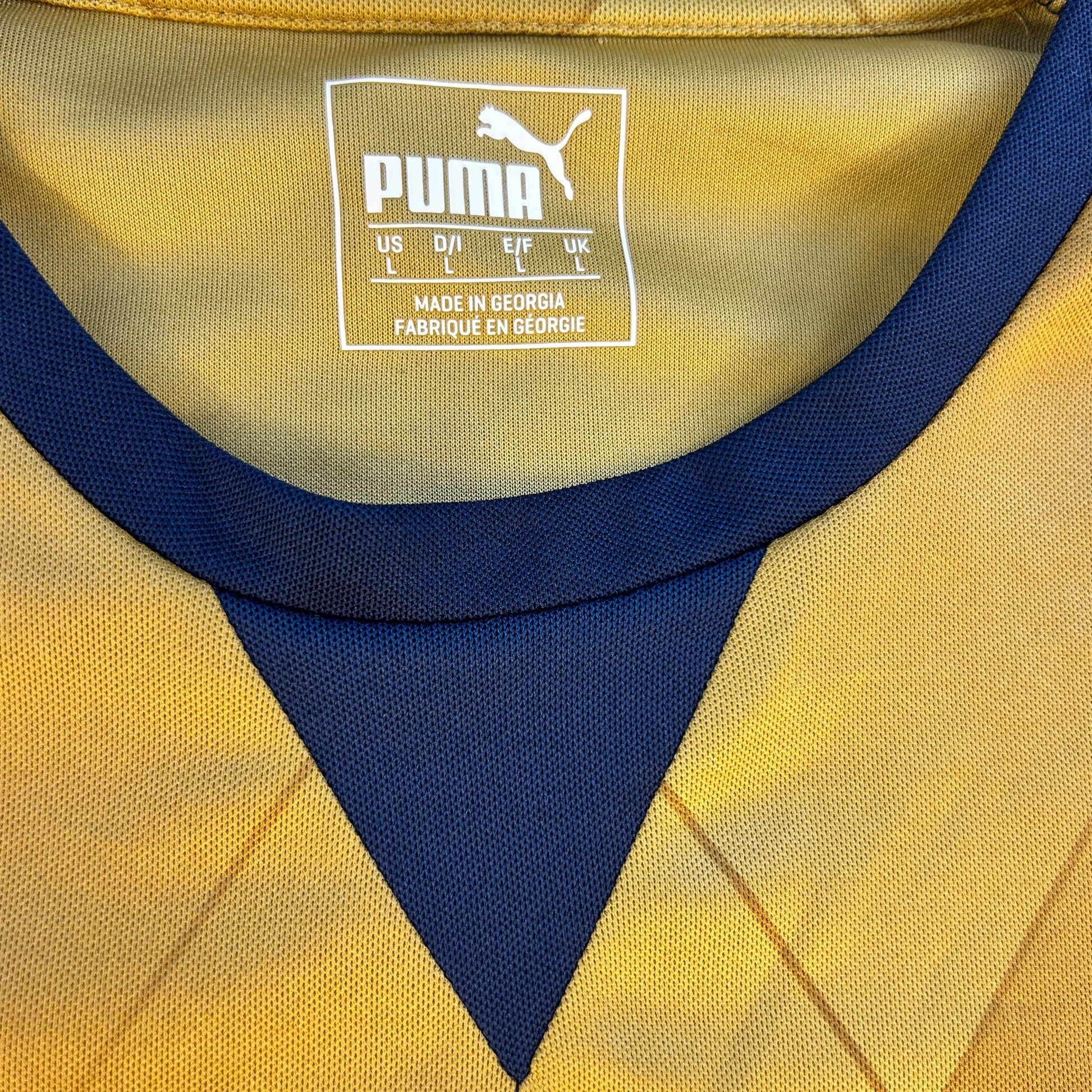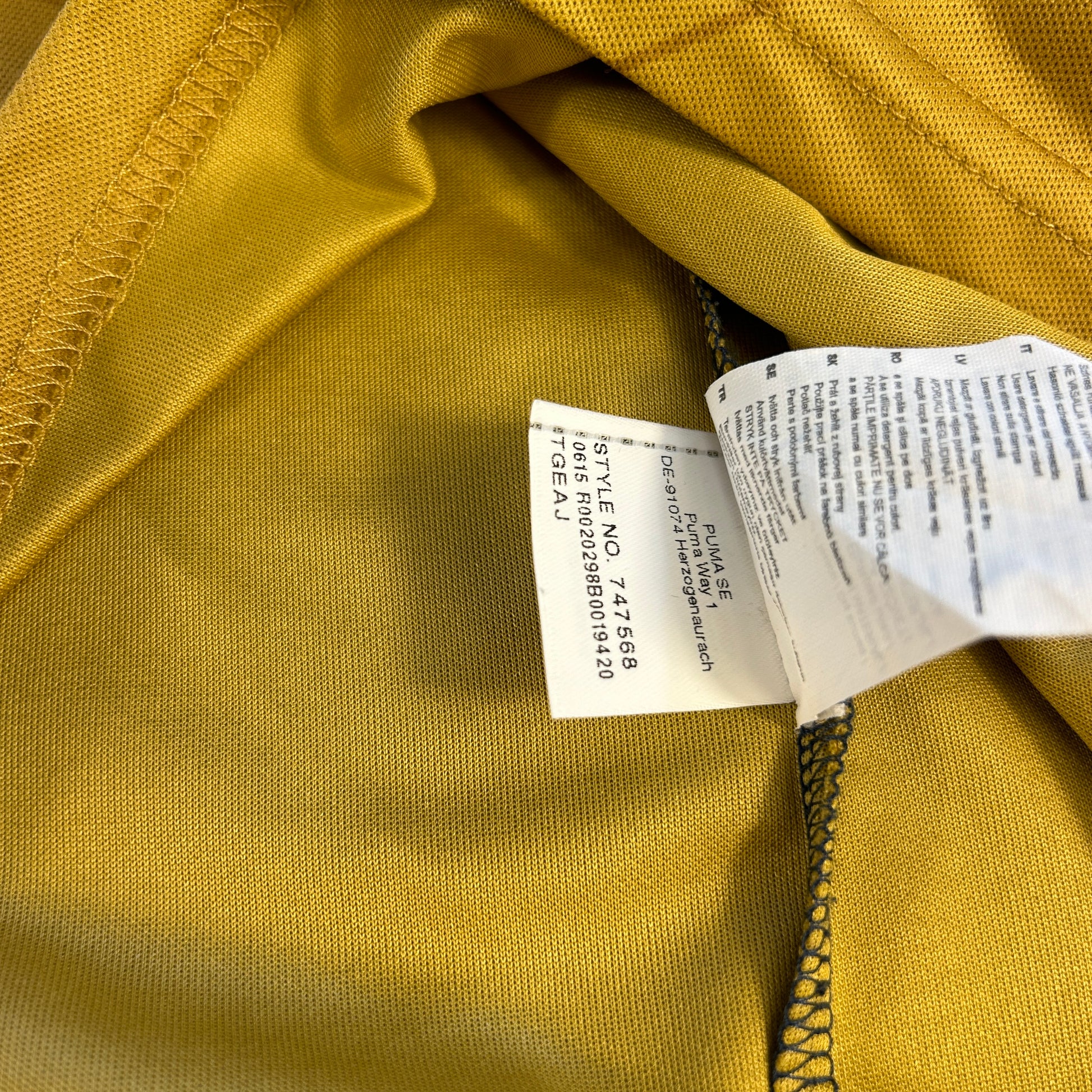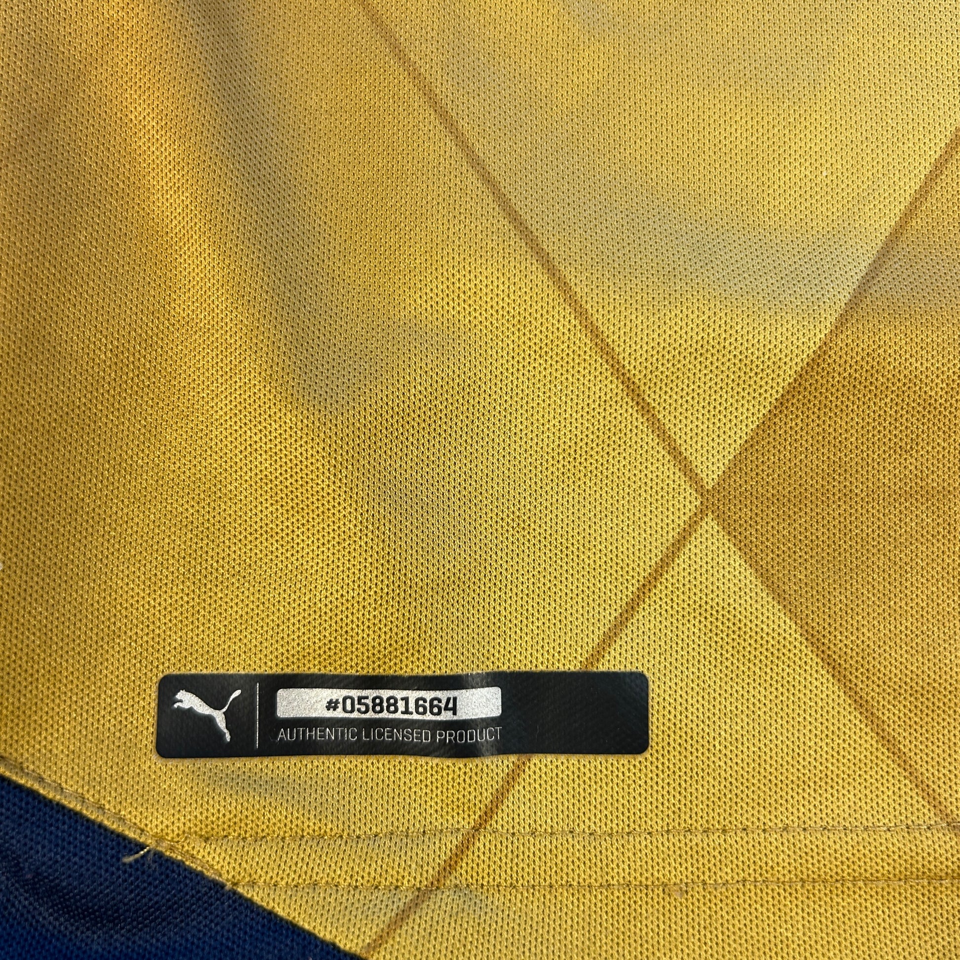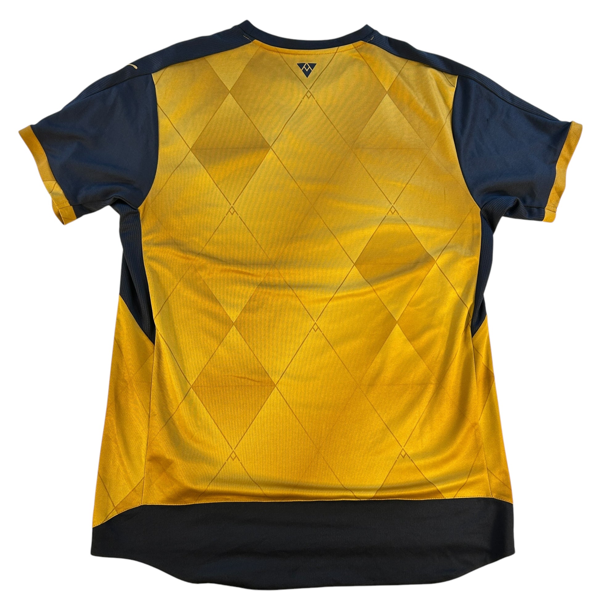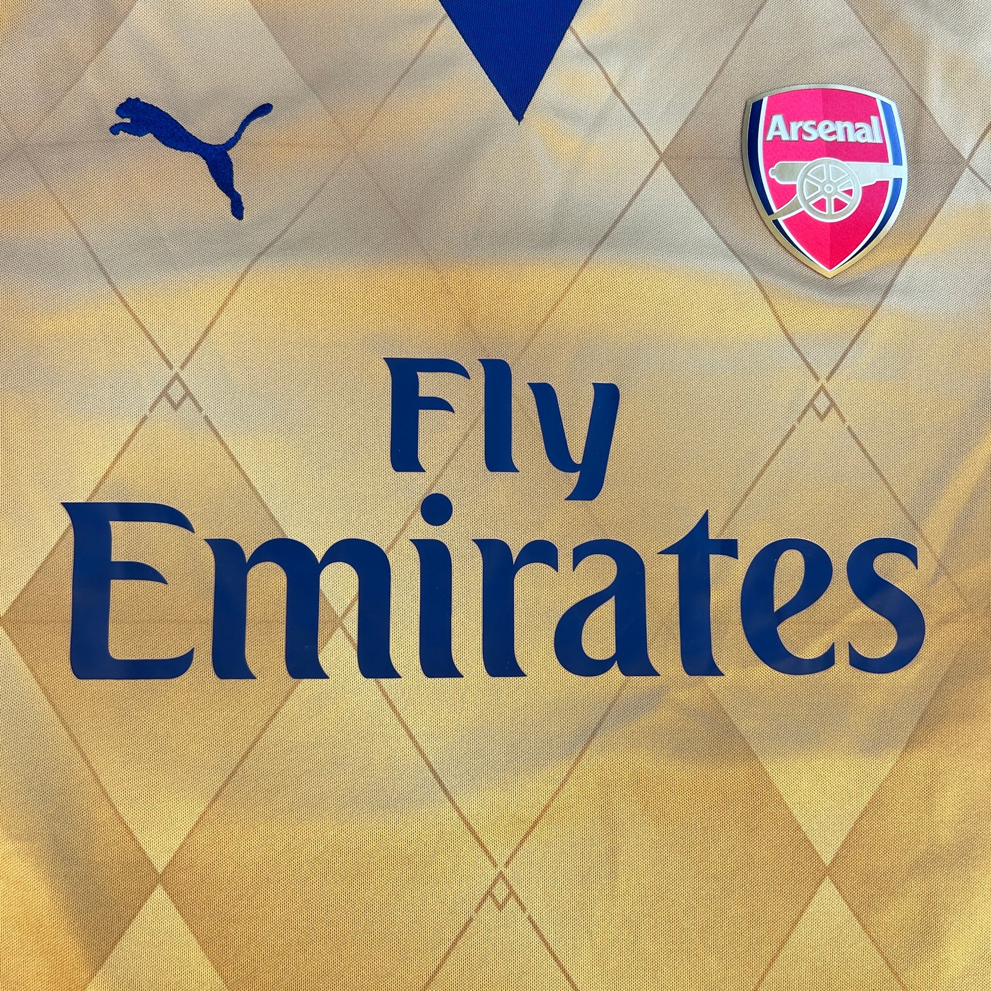 Shirt info: A gold Arsenal shirt with a cross pattern on the material.