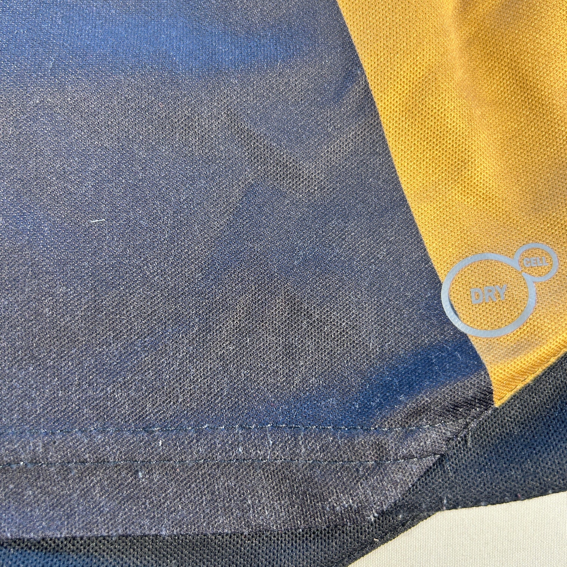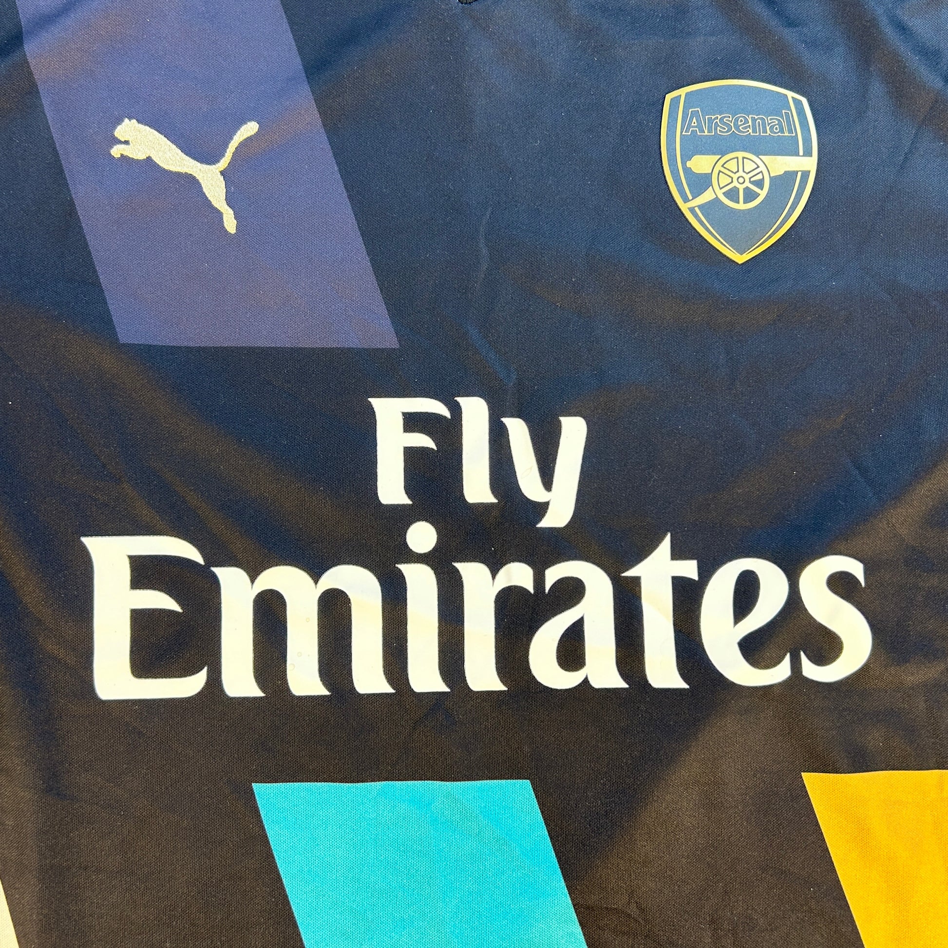 Shirt info: A strange dark blue shirt for Arsenal with lighter blue and gold sections coming up from the bottom of the shirt.