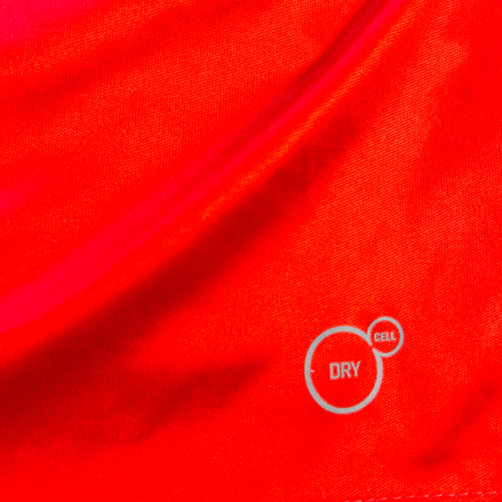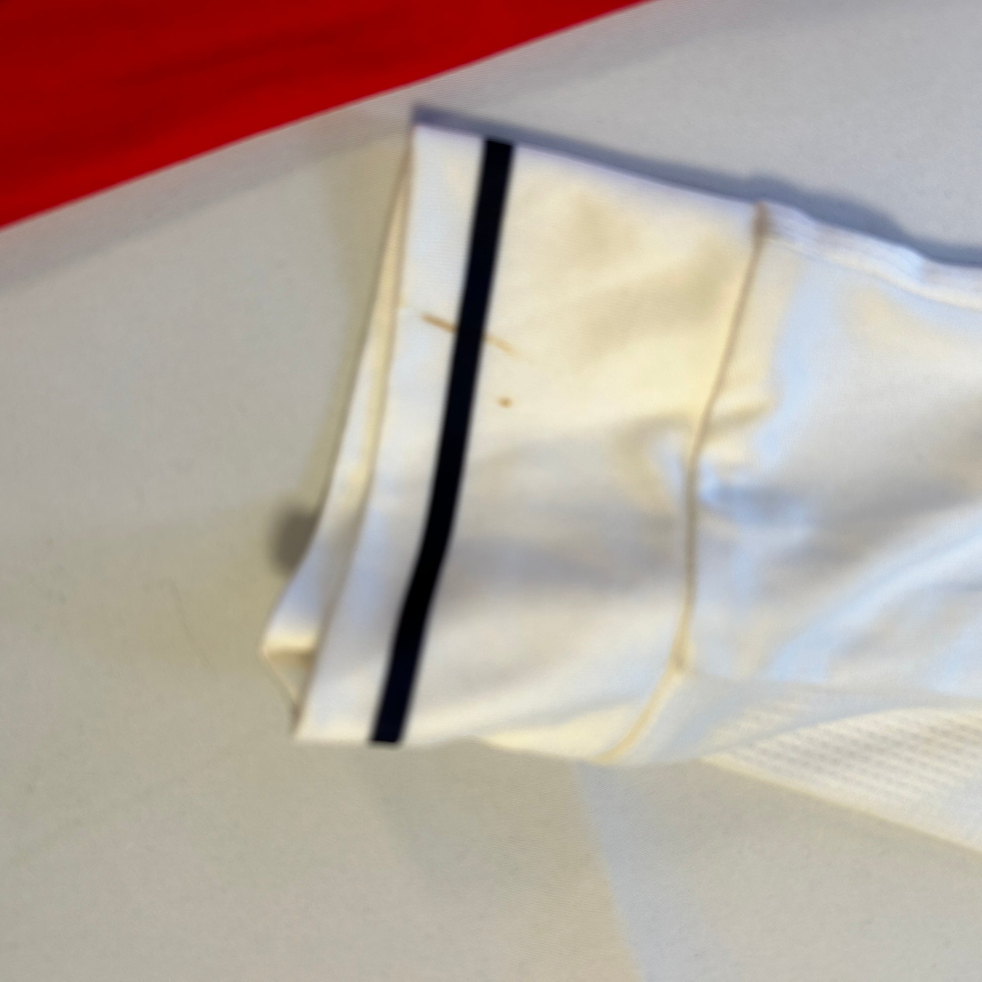 Shirt info: A red shirt with contrasting white collar and sleeves. The shirt has a prominent darker red stripe down the front. The long sleeve has a cuff with a black line around it.