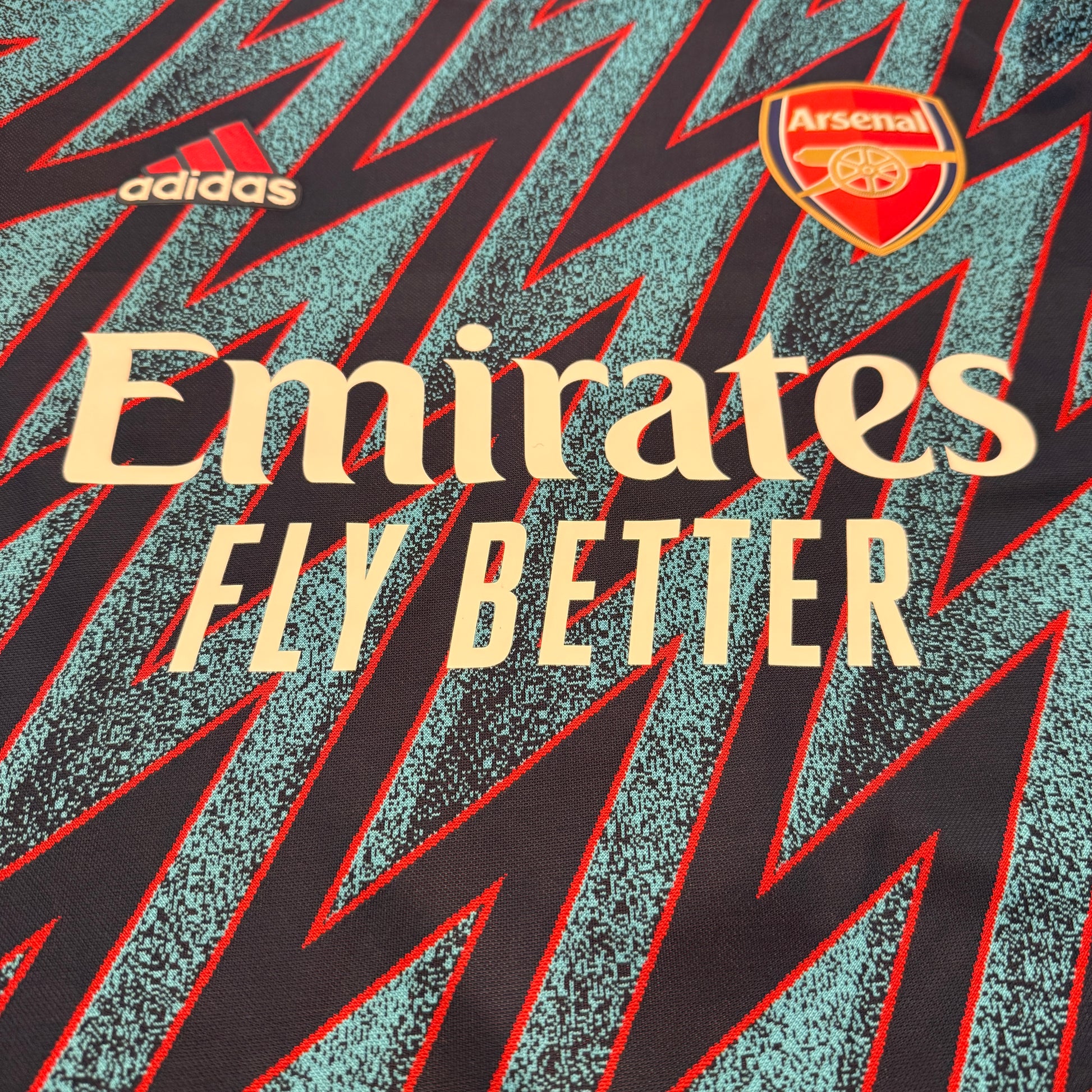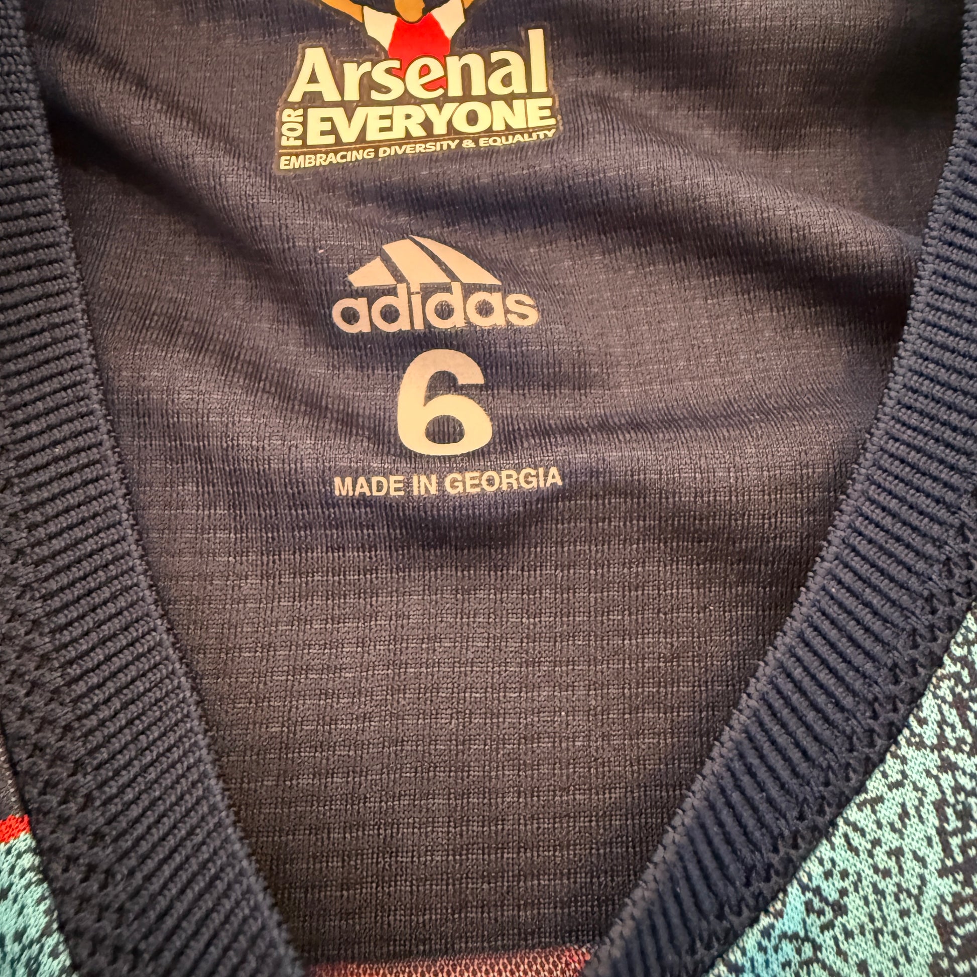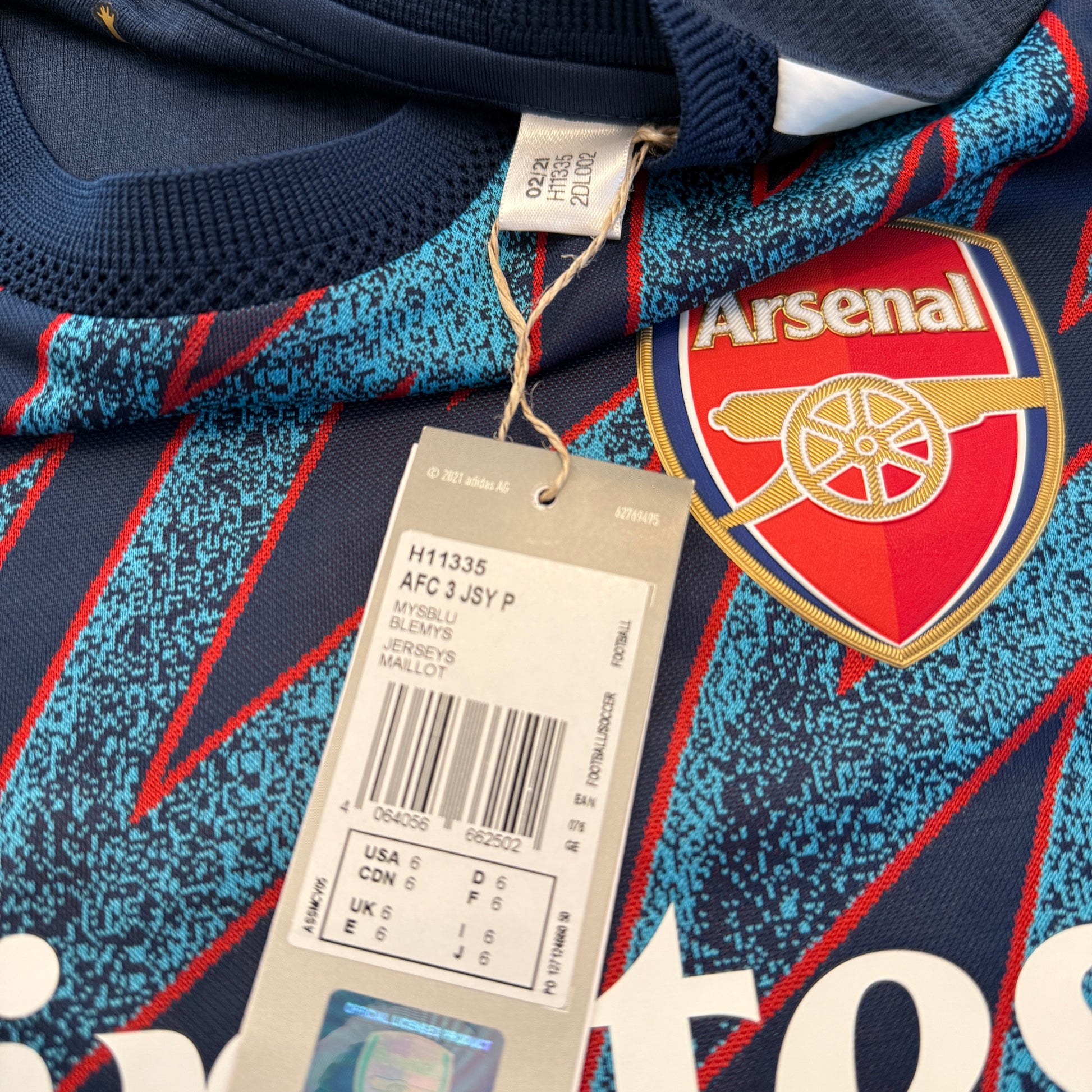 The Arsenal third shirt in the 2021/2022 season. This is a sample shirt for the European shirt. Arsenal did not qualify for Europe this season so the shirt was never used. It has been printed with the Europa League badges and a SAKA 7 cup font print.