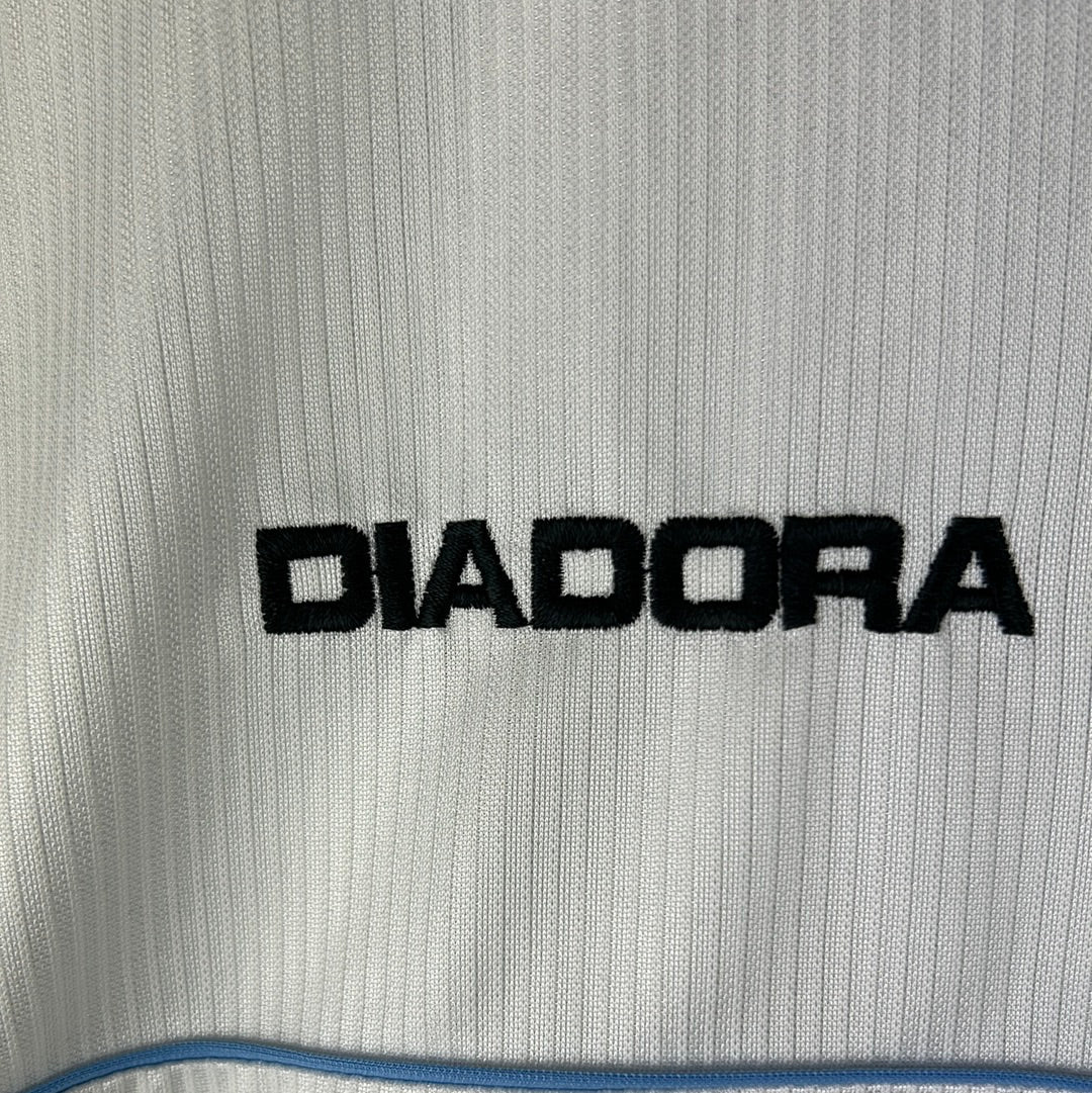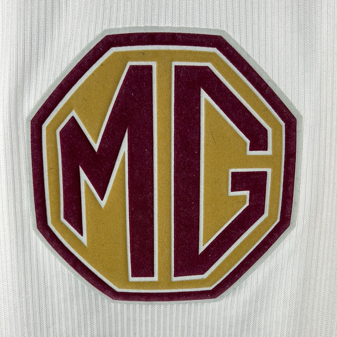 Player Issue Details: The shirt is a Diadora player-issue shirt with player issue sized names and sleeve patches. The Diadora is fully embroidered and the MG sponsor is felt & embossed.