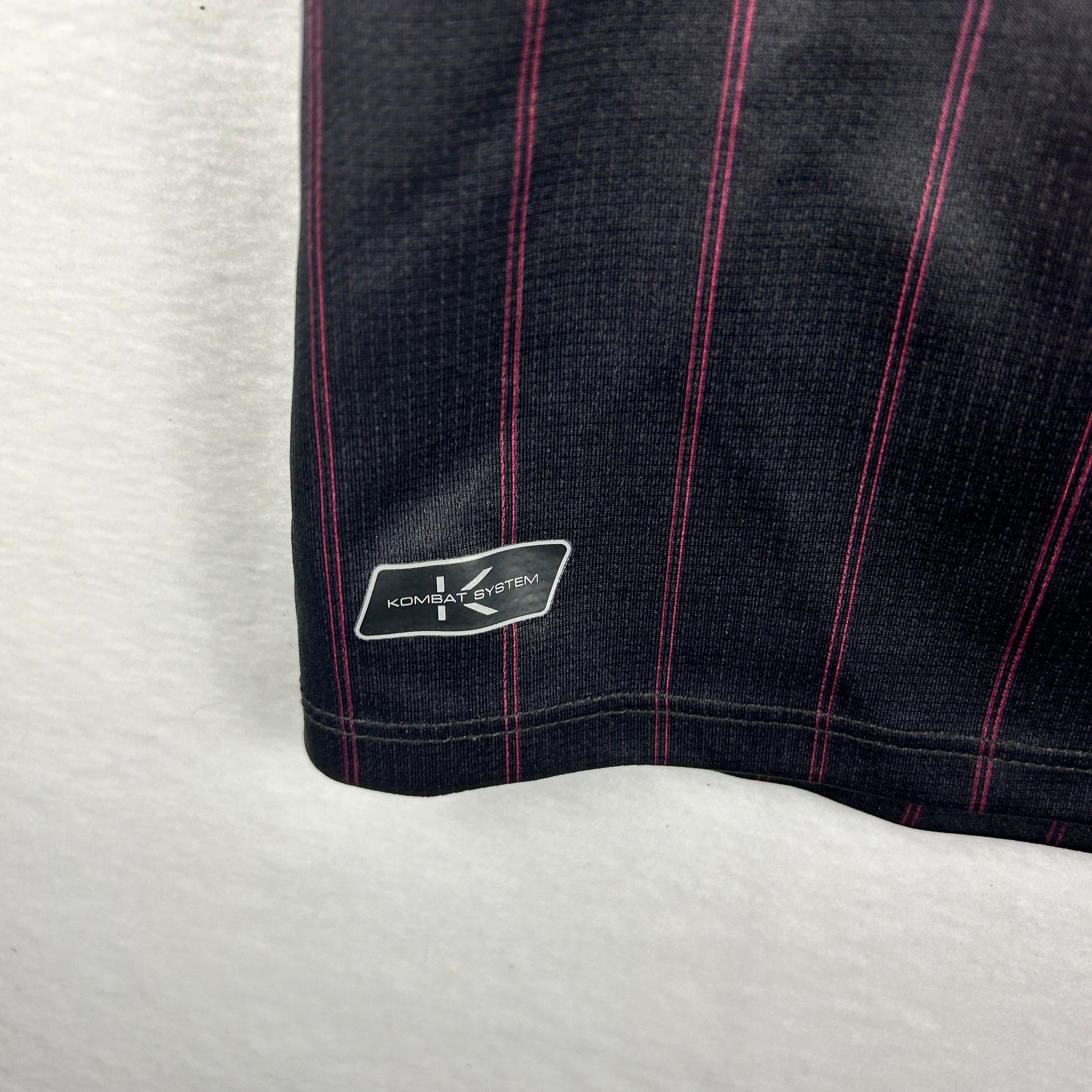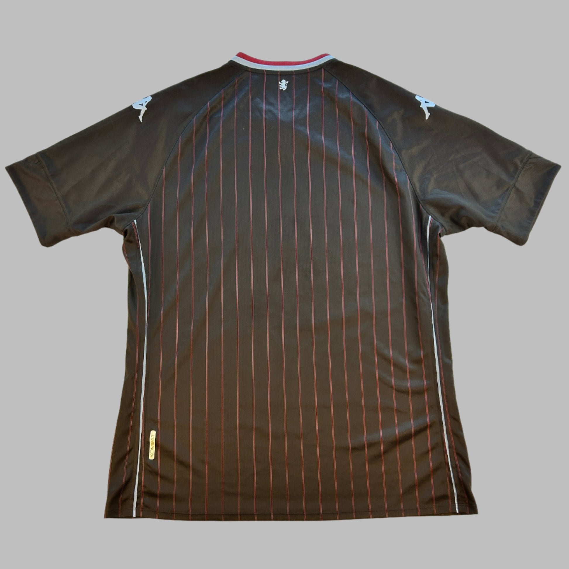 Shirt info: The Aston Villa away shirt for the 2020/2021 season. This is a black shirt with a thin burgundy pin stripe. The detailing is light blue and printed on the shirt.