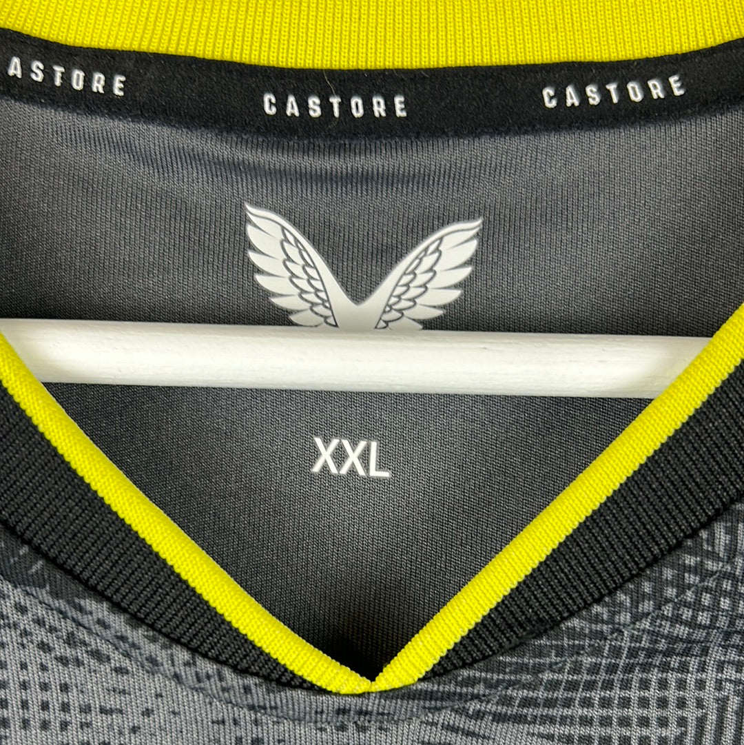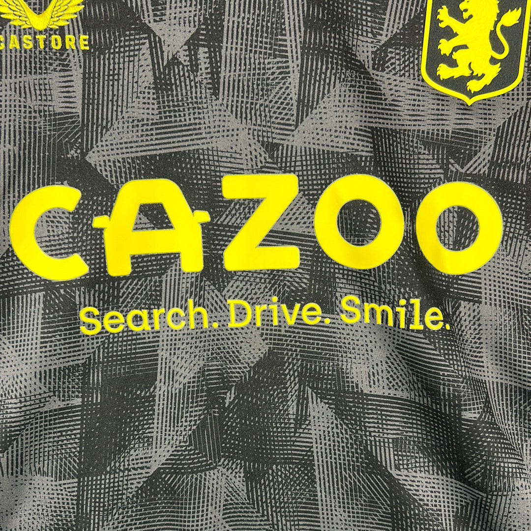 Shirt info: The Aston Villa third shirt for the 2022/2023 season. This is a great shirt from Castore that is well-designed with a nice pattern to the material and contrasting plain side patterns. The yellow of the sponsor and detailing pops against the black of the shirt. This was a step up from some of the Kappa shirts that Aston Villa had previously.