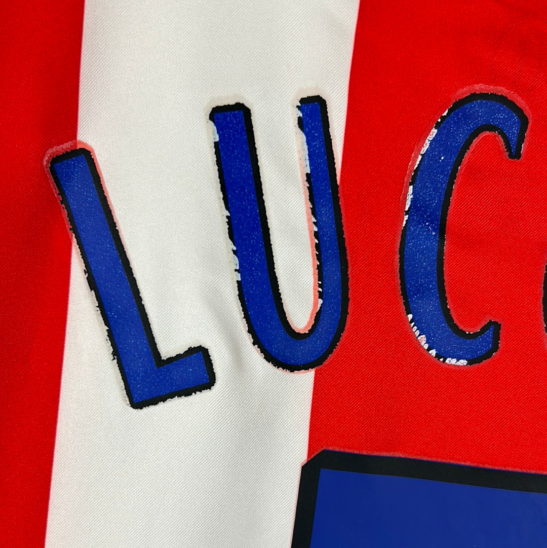 Condition Details: The shirt is in good condition. There is some colour run from the red to the white and slight cracking around the LUCCIN on the back of the shirt.