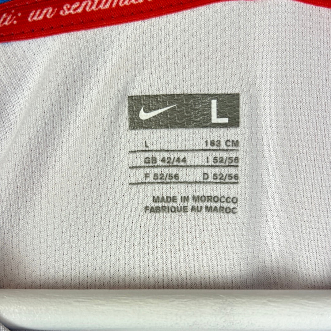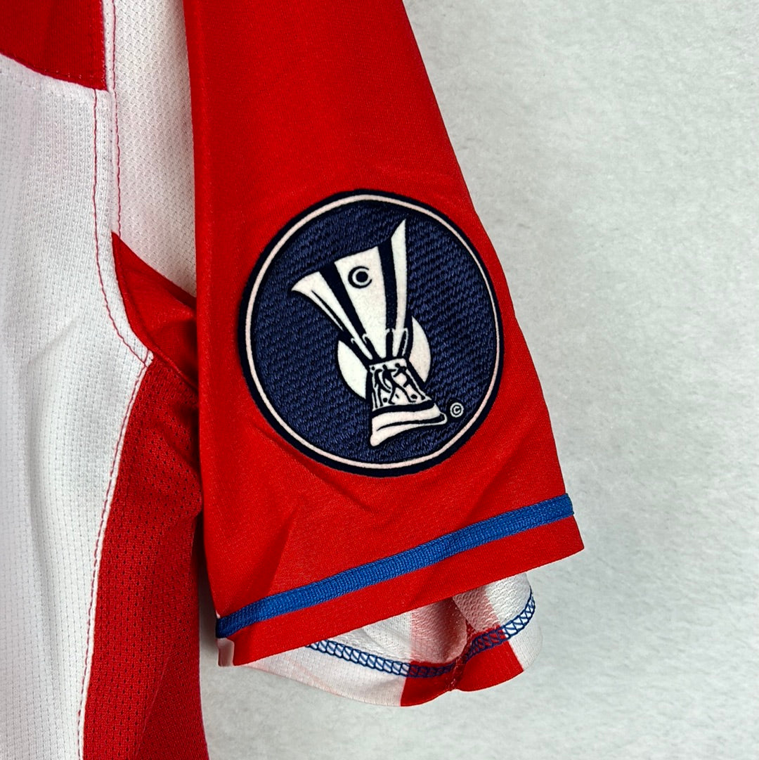 Player Issue Details: Original player issue shirt. The shirt has no product code label and printed wash instructions, correct for a player's shirt. The shirt has the Europa League patch on one sleeve. It has a plain white panel on the back of the shirt to keep in line with the UEFA rulings on shirts at the time.