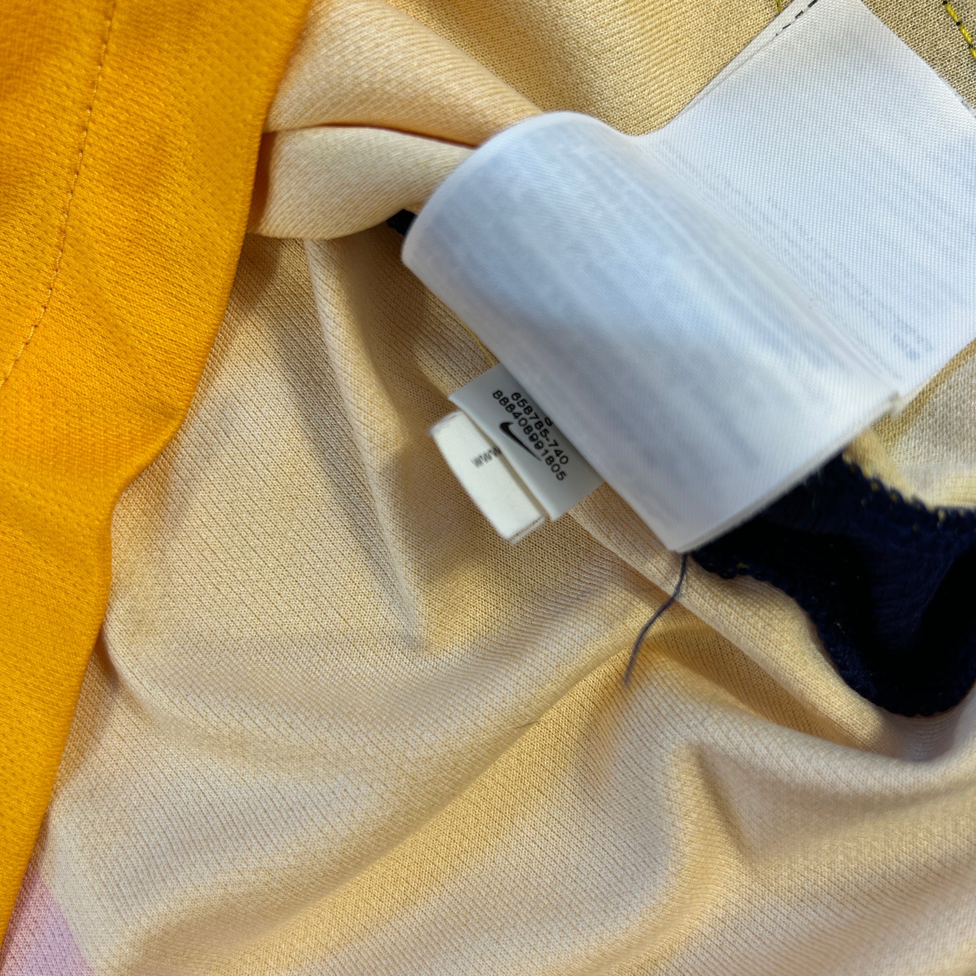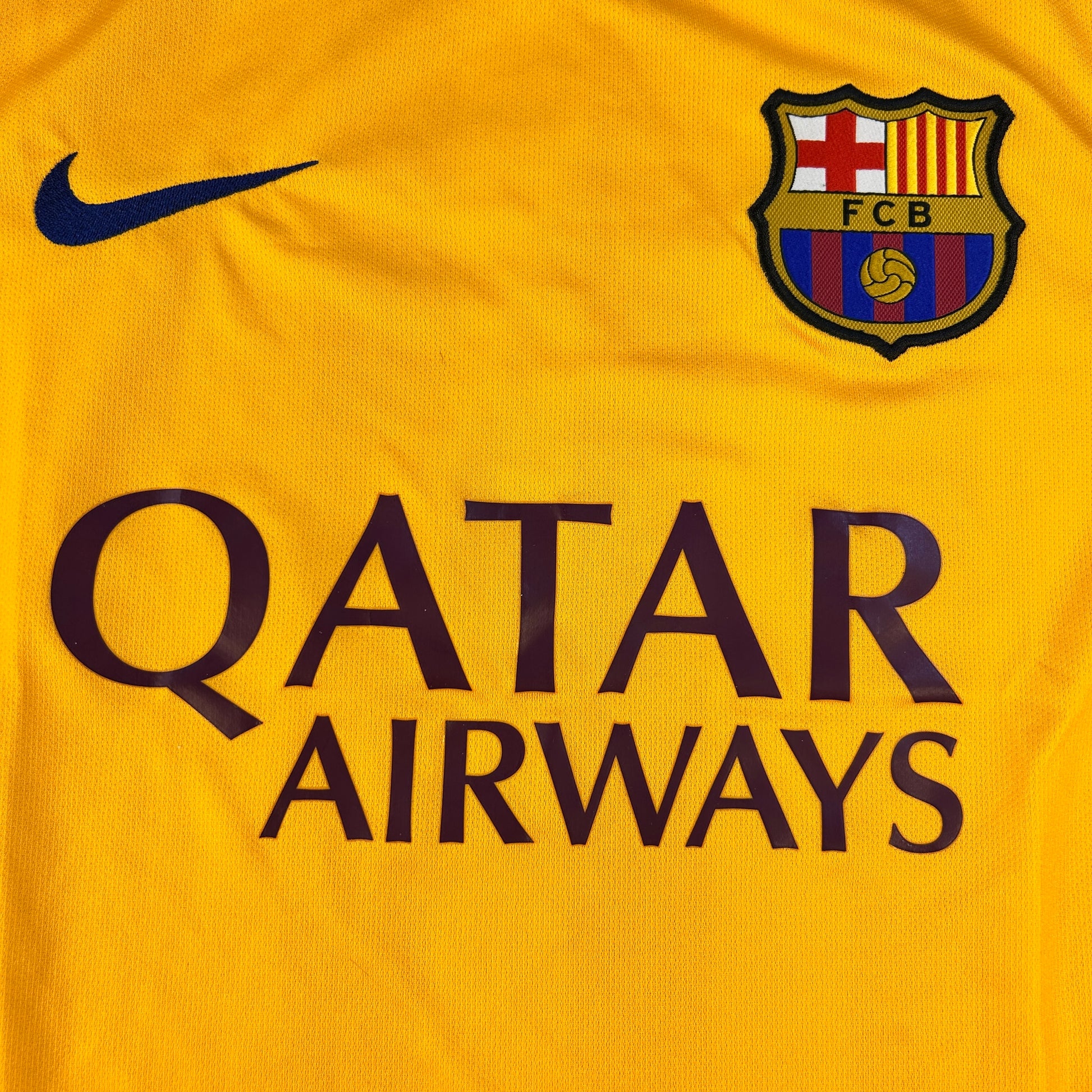 Shirt info: This is the Barcelona away shirt for the 2015/2016 season. The front has the Qatar Airways sponsor, and the lower back has the Unicef sponsor. The shirt is plain on the front and has red stripes on the back. This was an interesting choice of shirts from Barcelona and screams Messi and Iniesta.