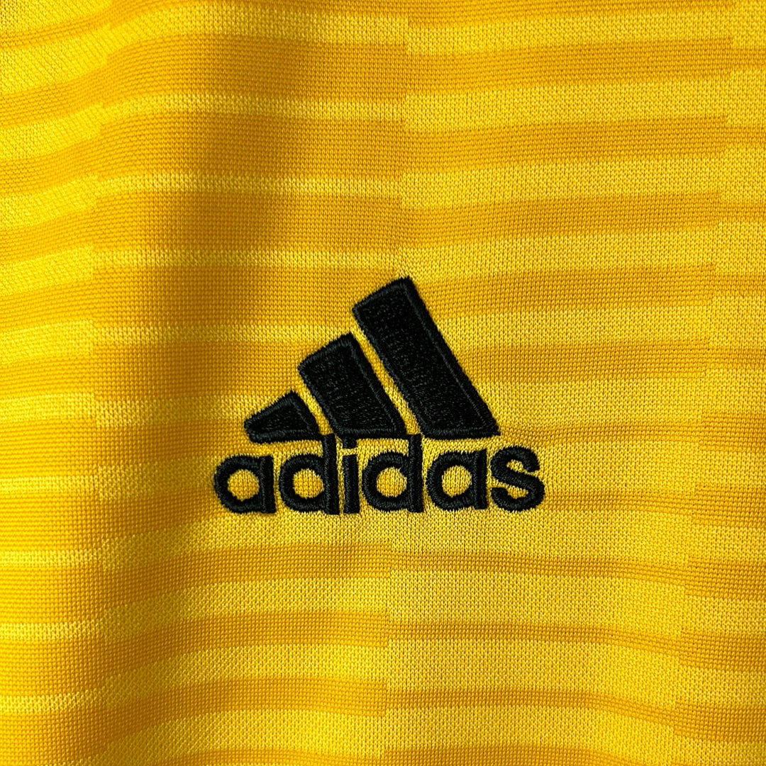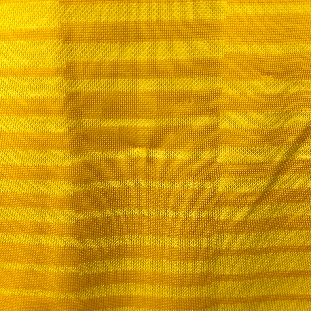 Shirt info: A yellow-away shirt for Belgium in the 2018 World Cup year. This is a yellow striped shirt with different darknesses of yellow making the pattern.