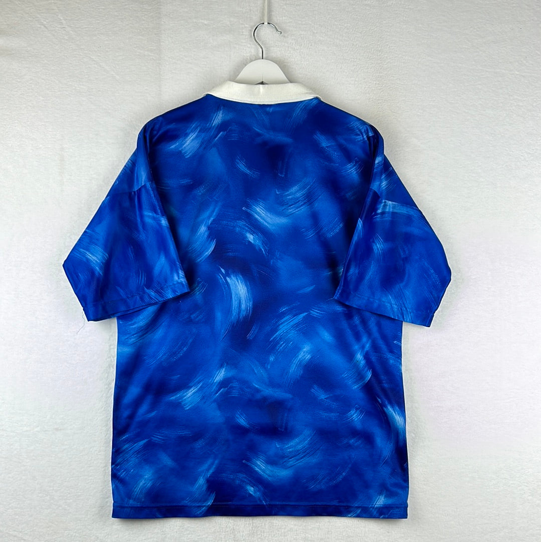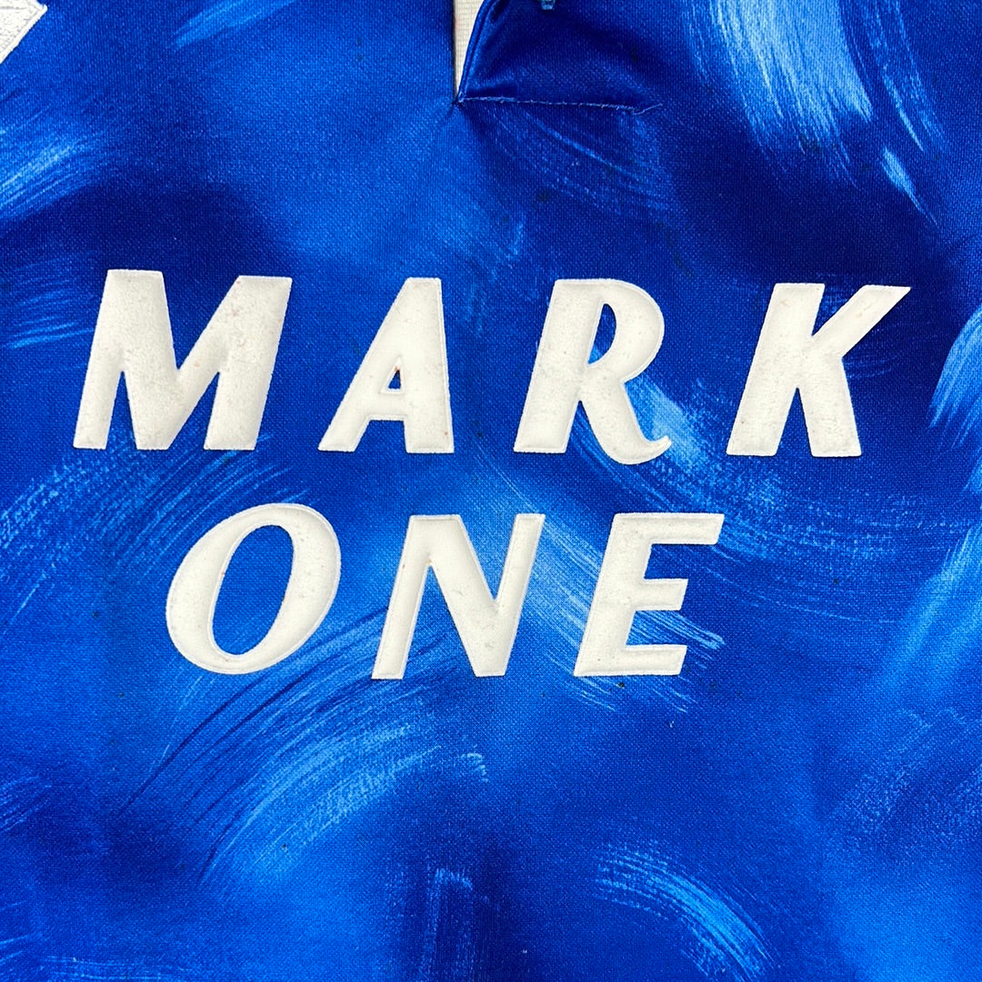 Shirt info: The blue collared home shirt worn by Birmingham City during the 1990-1991 season in the old Division 3. The shirt features; a material design which has a paint brush stroke design, a raised white 'Mark One' sponsor, and a fully embroidered Birmingham City badge and Matchwinner logo.