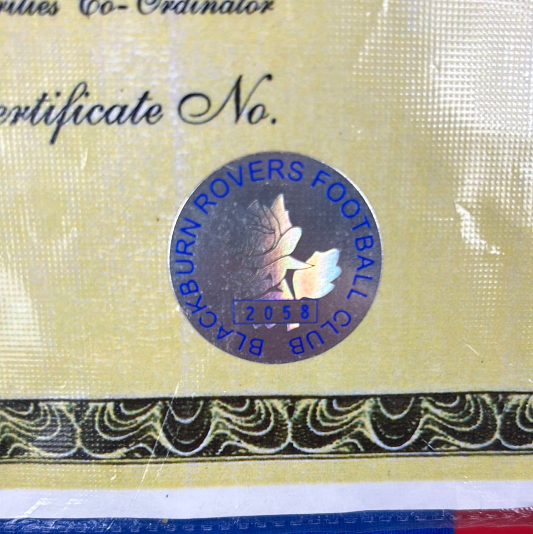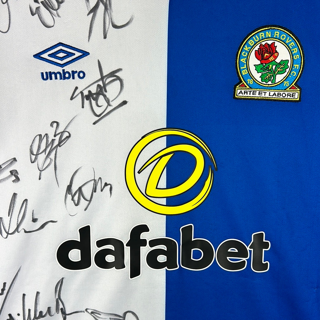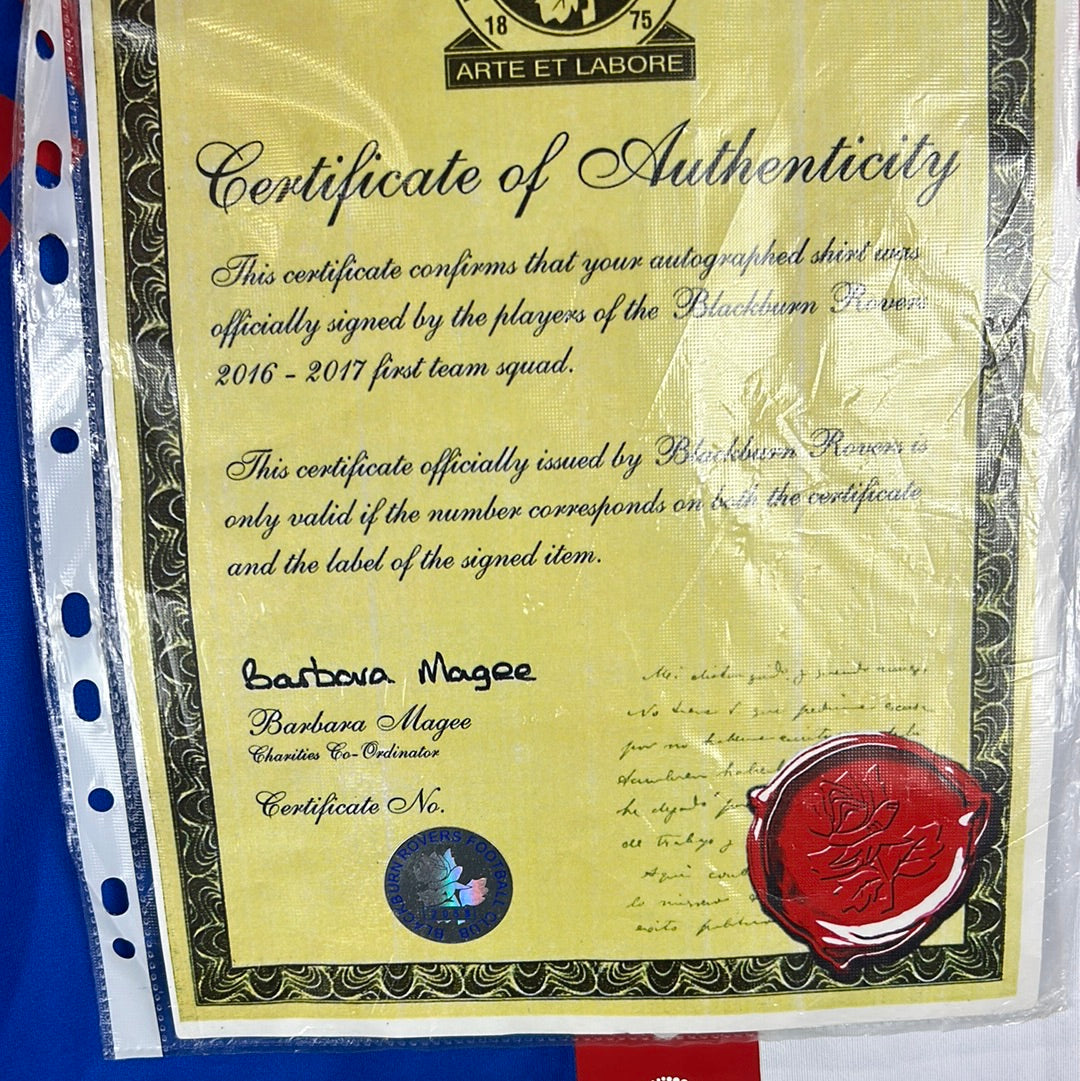 Signed: The shirt has been signed by the squad in that season. It comes with over 15 signatures from the squad that season. The shirt is supplied with a COA from Blackburn Rovers football club. The COA is signed by the head of charities. There is a numbered hologram on the sticker that corresponds with the one on the neck of the shirt.