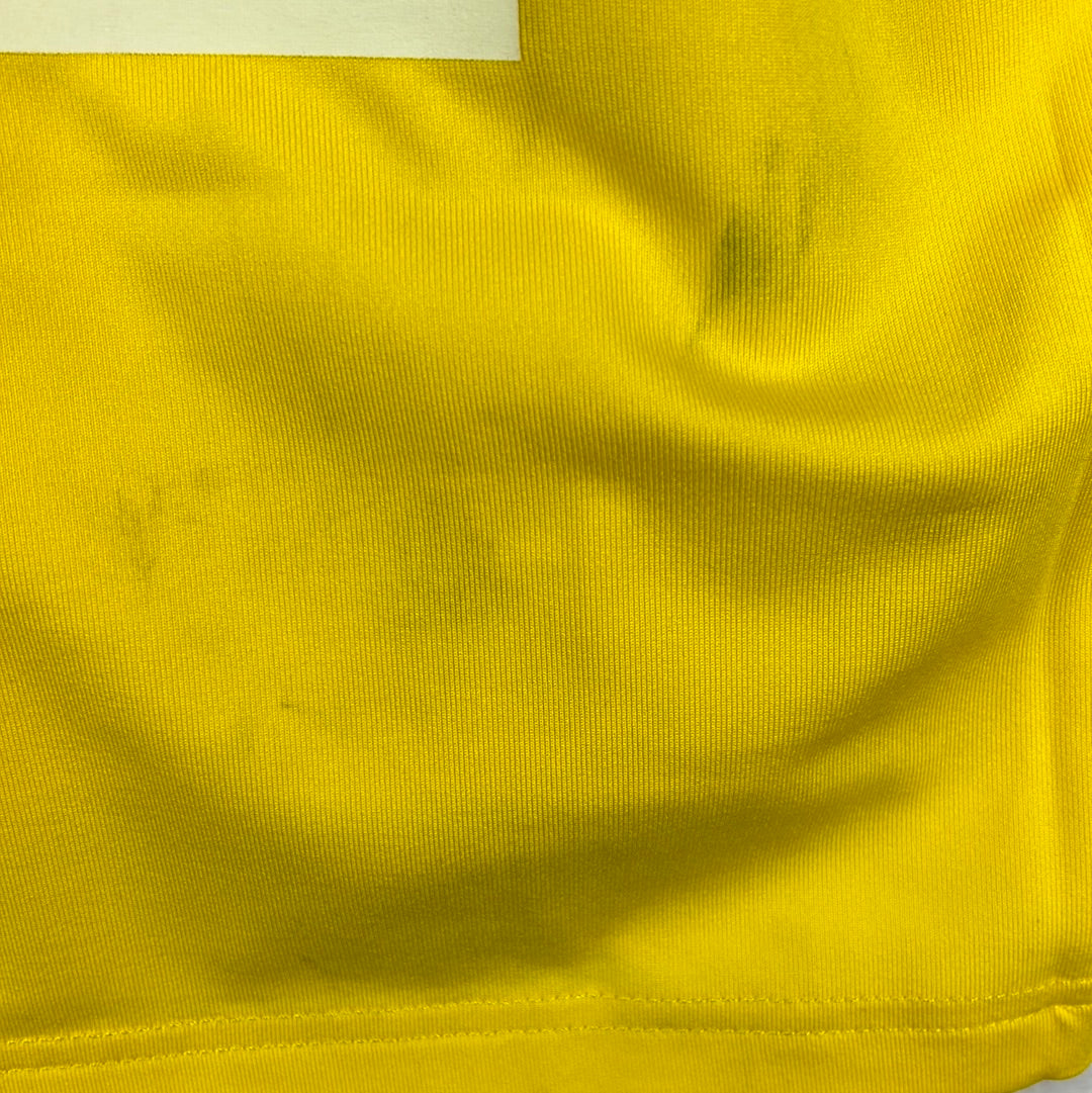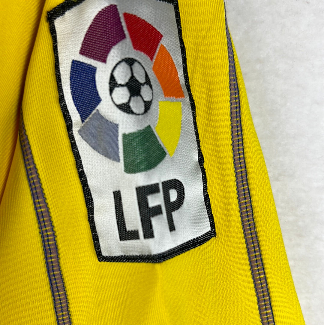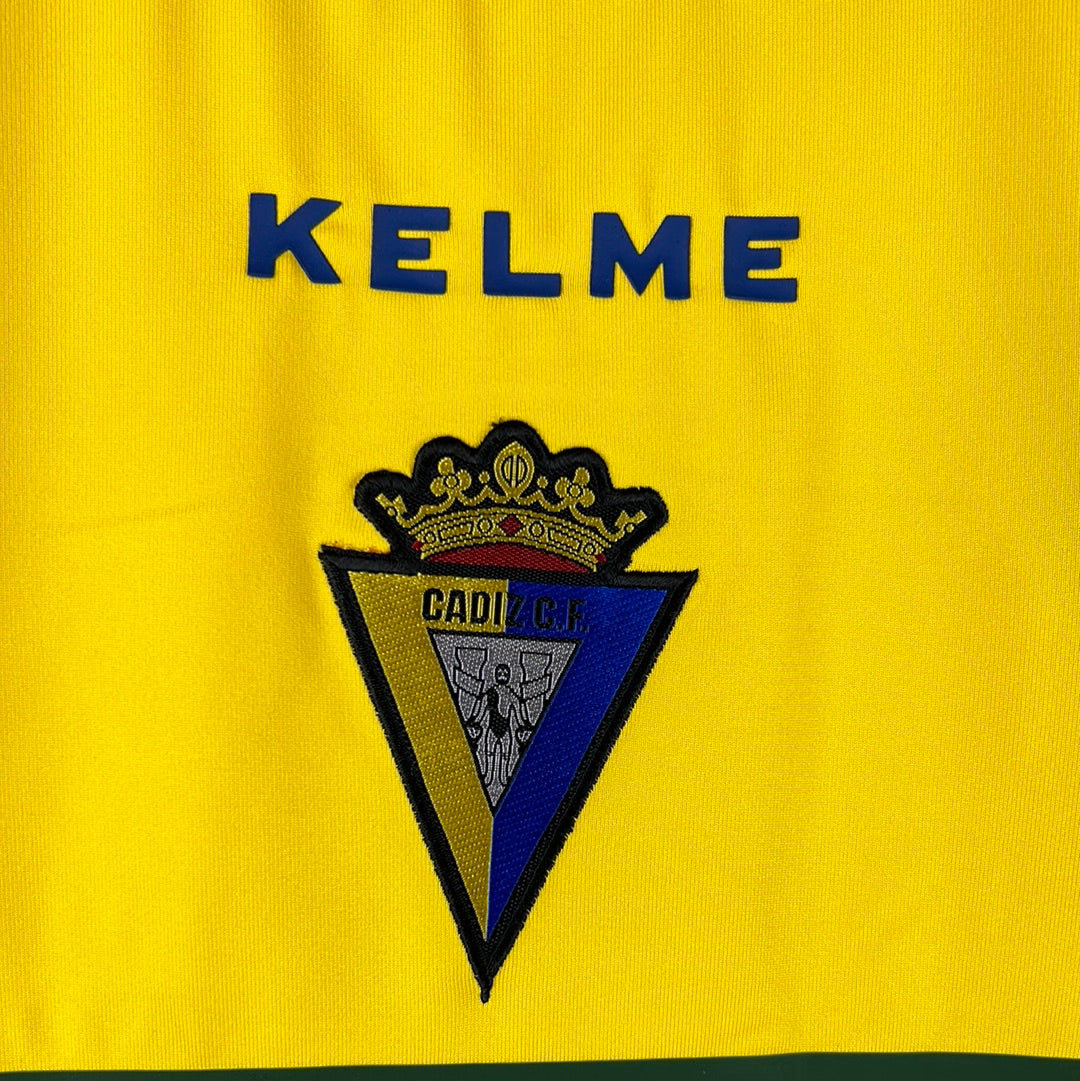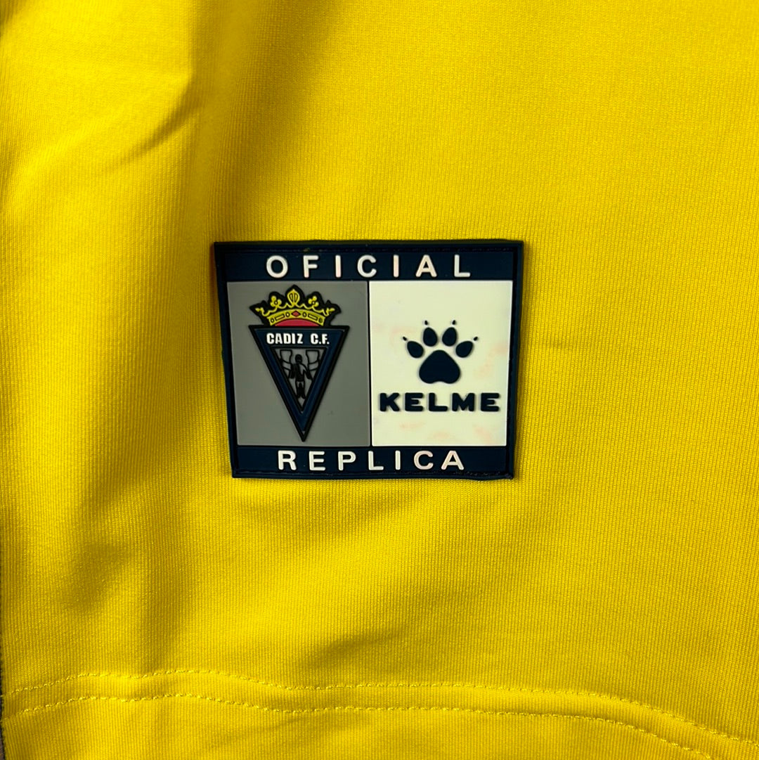 Shirt info: The 2005-2006 home shirt worn by Cadiz during the La Liga season. This specific shirt was player issued to De La Cuesta for the match vs Barcelona on 17/12/2005. The yellow shirt features; the official Kelme patch on the lower front, the printed 'Caja San Fernando' sponsor, and an embroidered Cadiz badge and Kelme logo in the centre. The La Liga 'LFP' patch is sewn into the sleeve and the Kelme paws are printed along both sleeves. 'De La Cuesta 2' is printed in dark blue and silver plastic flock.