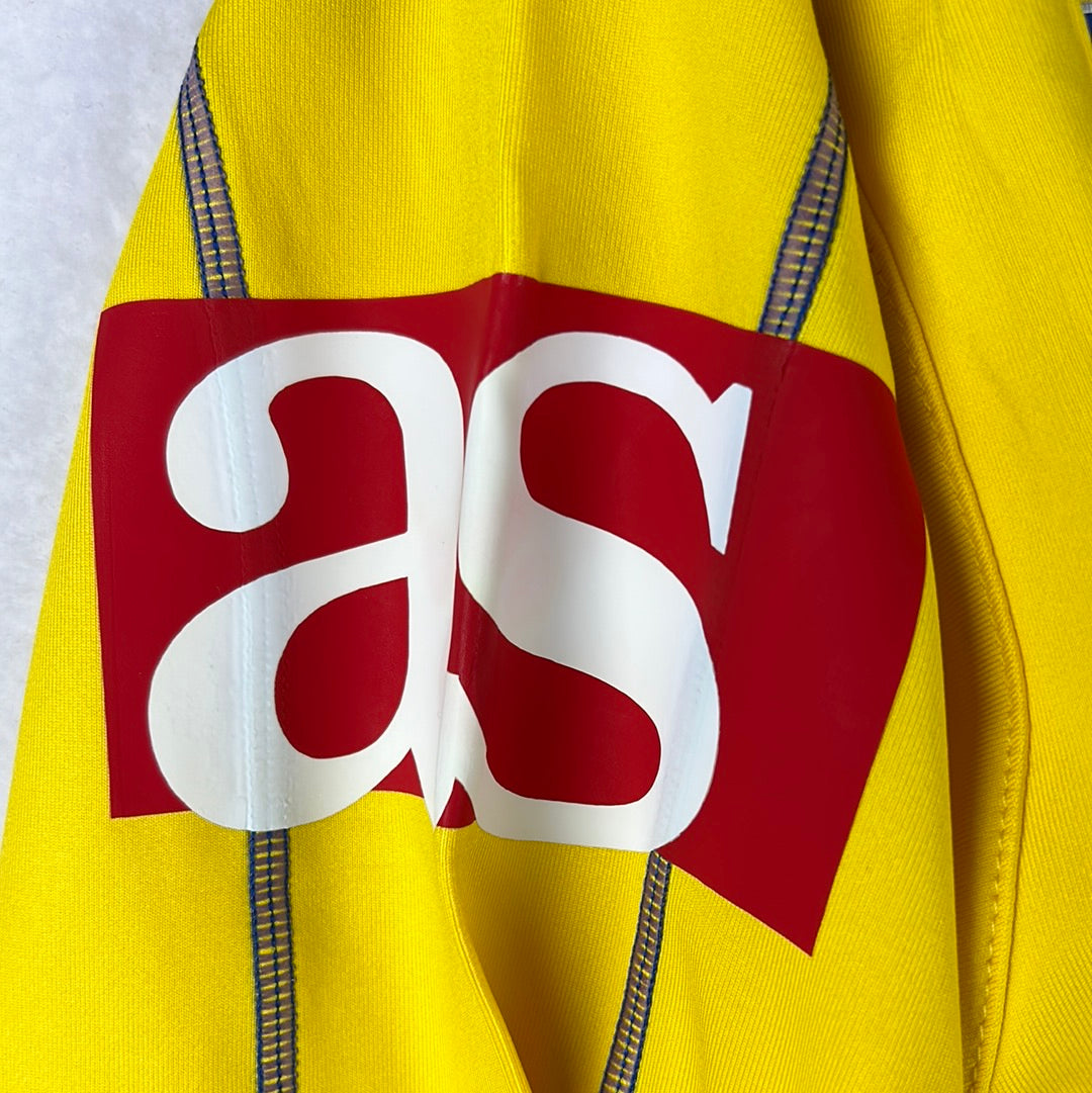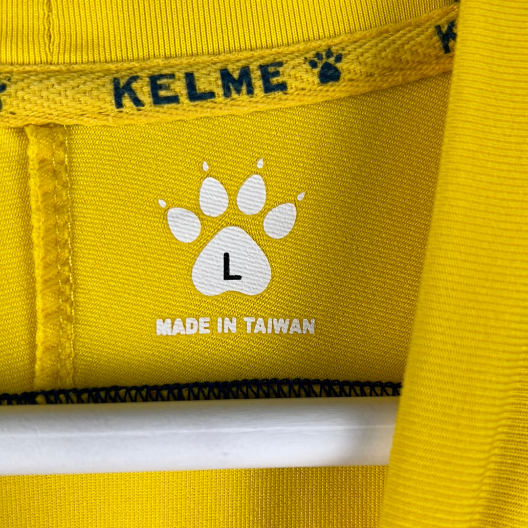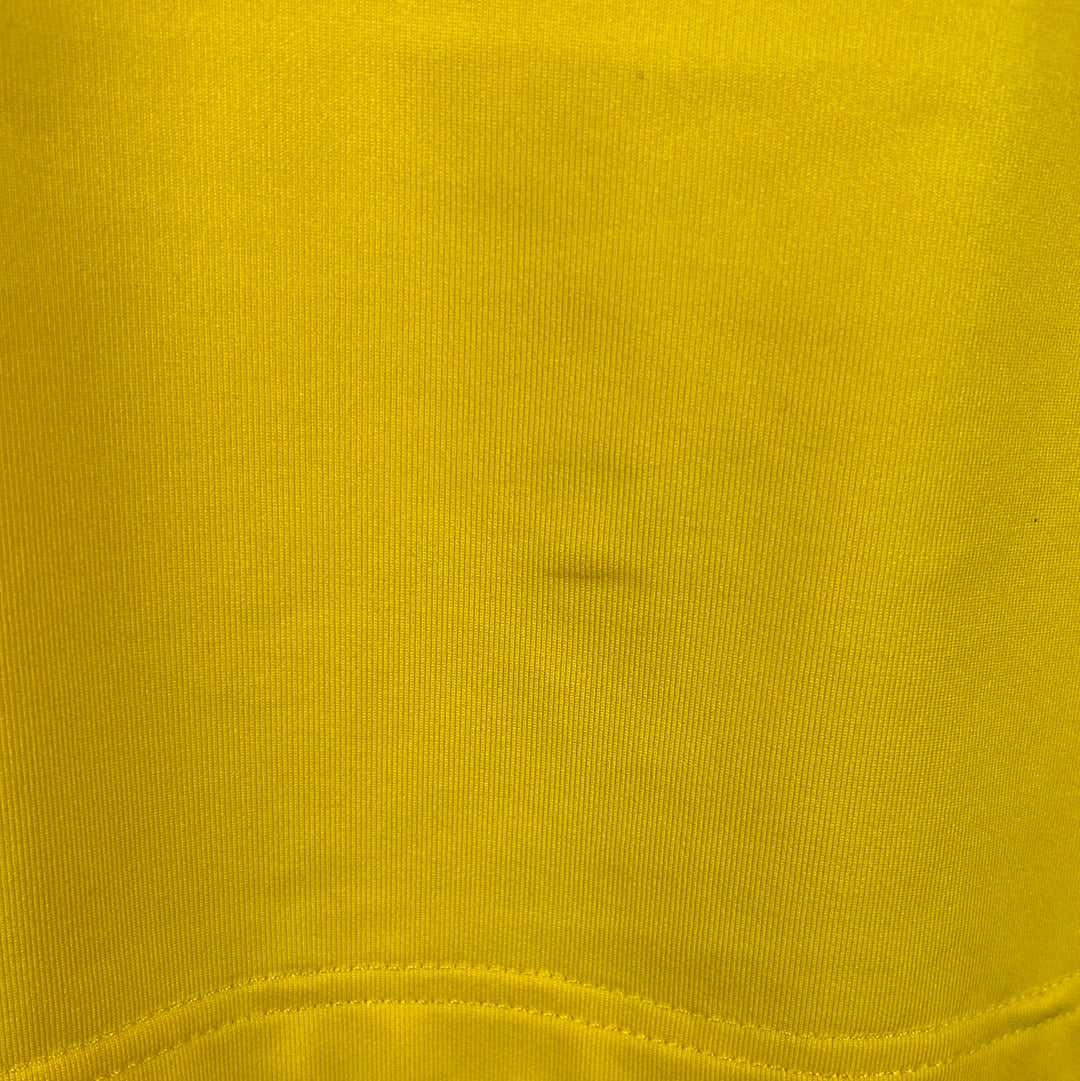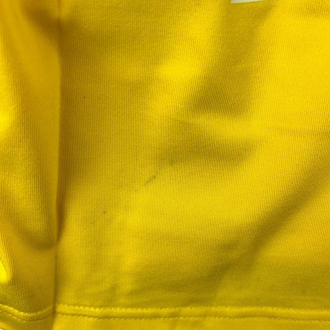Shirt info: The 2005-2006 home shirt worn by Cadiz during the La Liga season. This specific shirt was player issued to De La Cuesta for the match vs Barcelona on 17/12/2005. The yellow shirt features; the official Kelme patch on the lower front, the printed 'Caja San Fernando' sponsor, and an embroidered Cadiz badge and Kelme logo in the centre. The La Liga 'LFP' patch is sewn into the sleeve and the Kelme paws are printed along both sleeves. 'De La Cuesta 2' is printed in dark blue and silver plastic flock.