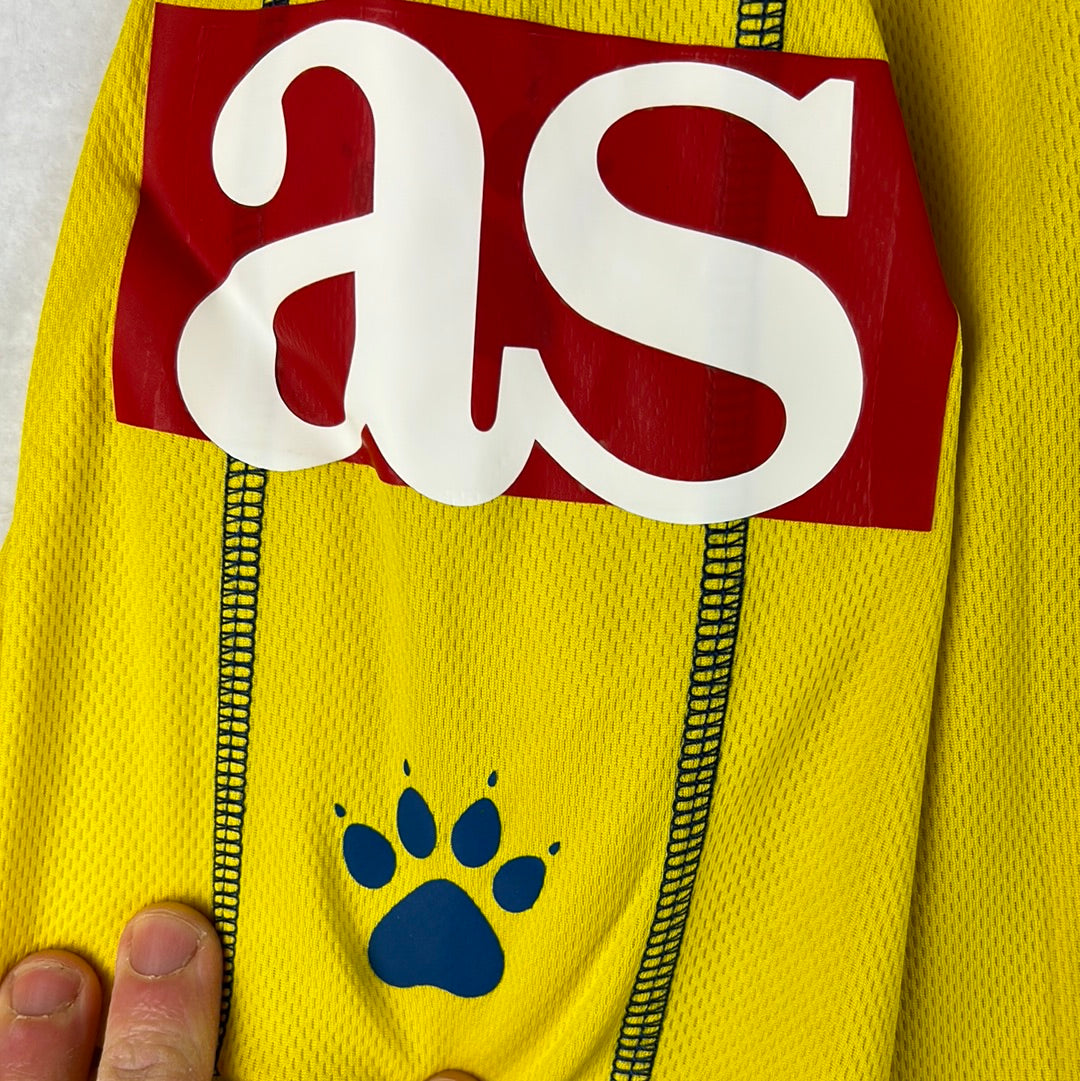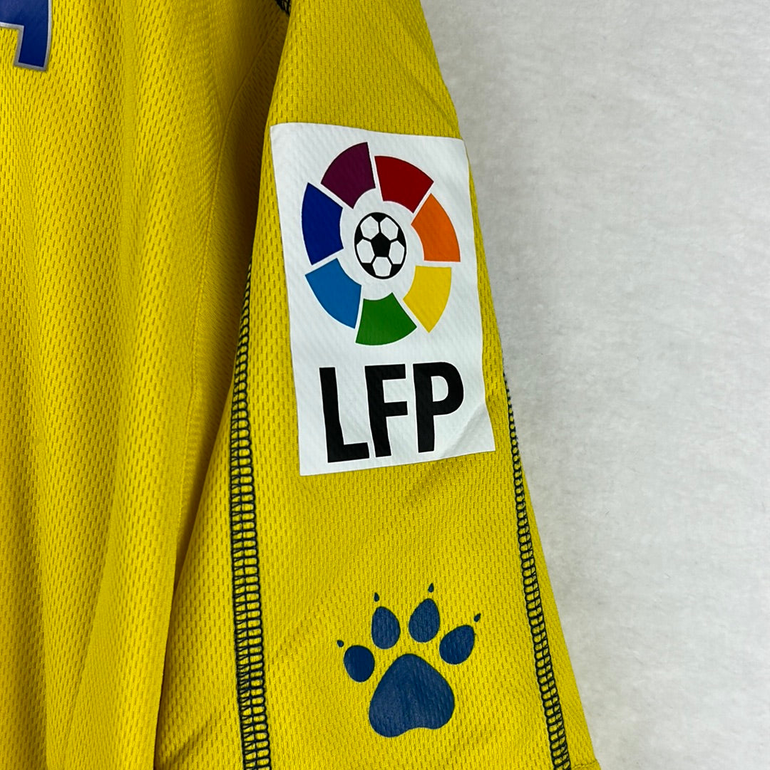 Shirt info: The 2005-2006 home shirt worn by Cadiz during the La Liga season. This specific shirt was player issued to De La Cuesta for the away match vs Barcelona on 29/4/2006. The yellow shirt features; the official Kelme patch on the lower front, the printed 'Caja San Fernando' sponsor, and an embroidered Cadiz badge and Kelme logo in the centre. The La Liga 'LFP' patch is sewn into the sleeve and the Kelme paws are printed along both sleeves. 'De La Cuesta 2' is printed in dark blue and silver plastic flock.