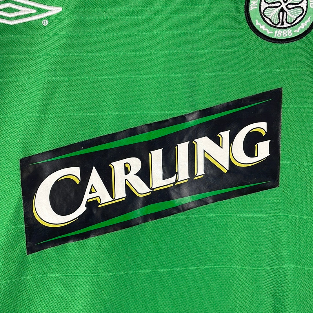 The Celtic training shirt in the 2003/2004 season. This is the estimated age of the shirt based on it being Umbro with a Carling sponsor.