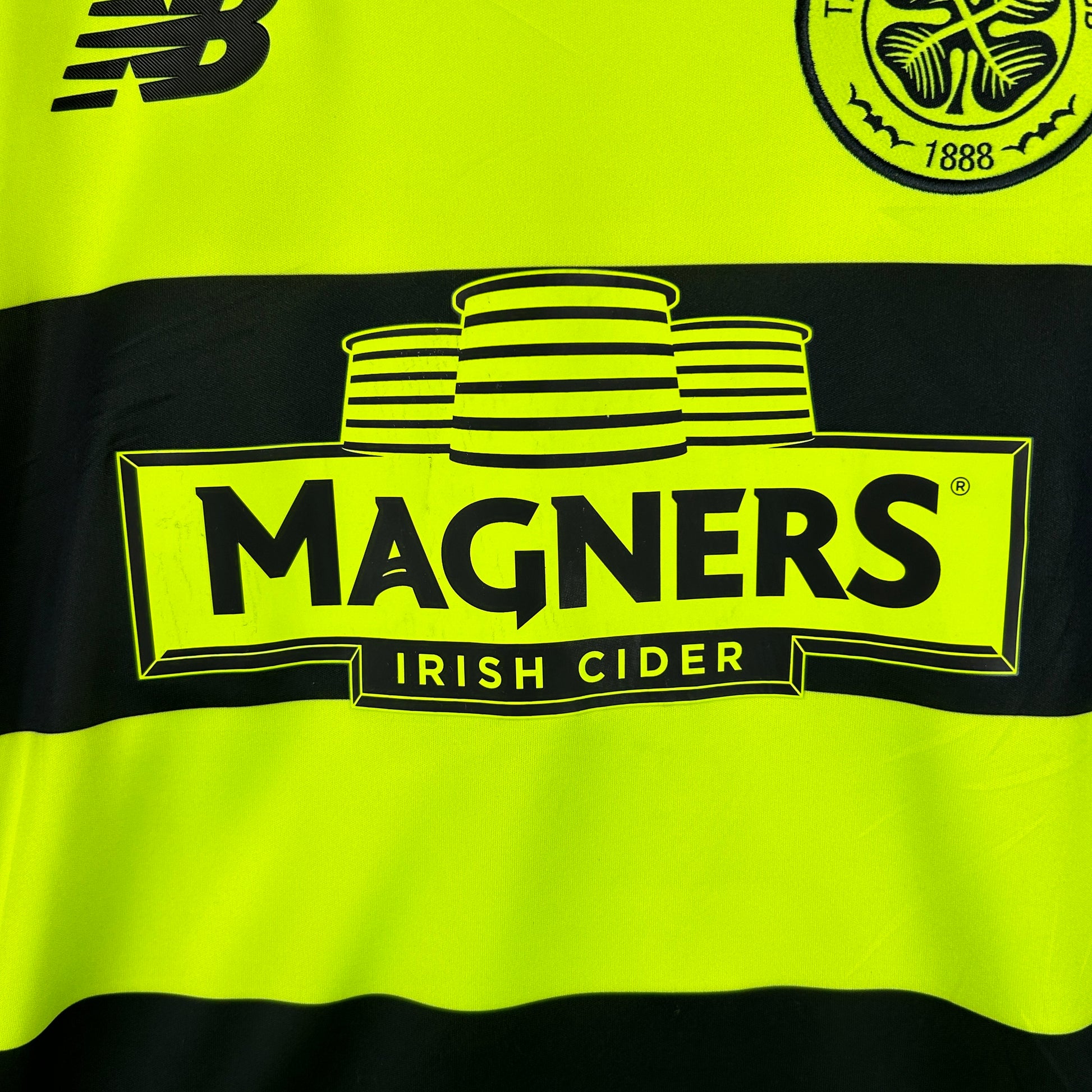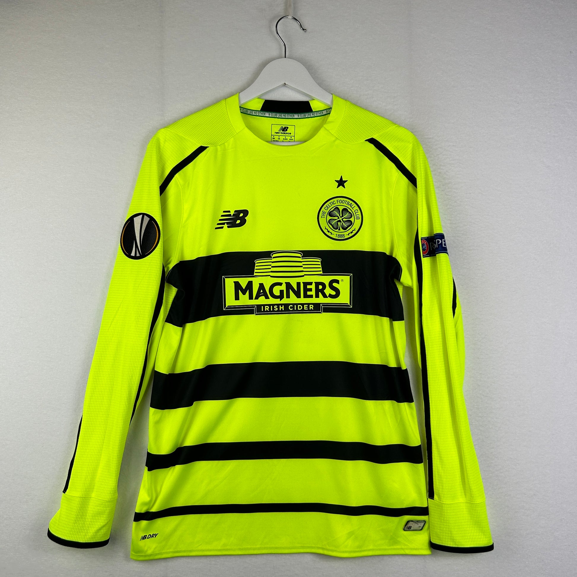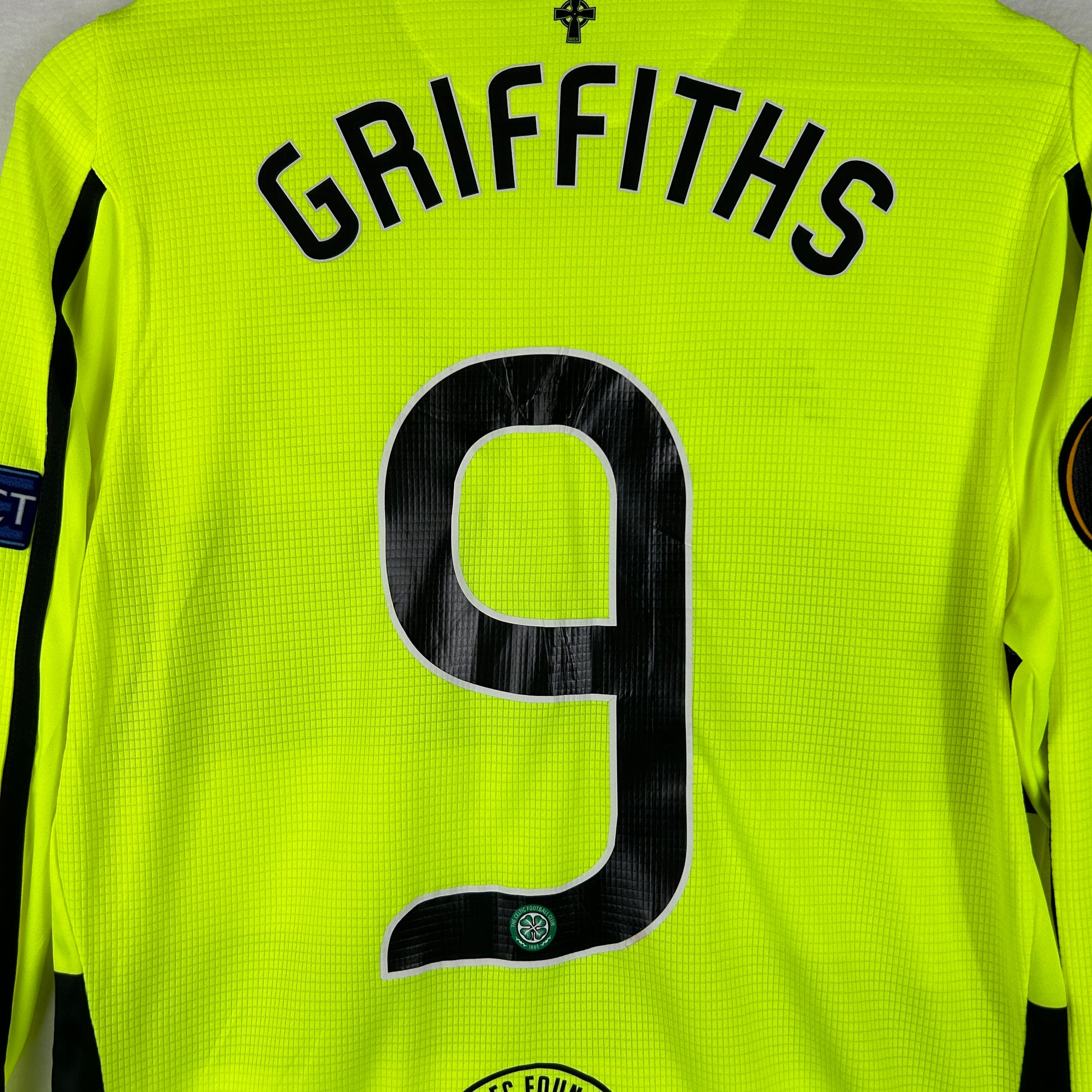 Shirt info: The Celtic third shirt in 2015/2016 with Griffiths 9 cup print and Europa League and UEFA Respect sleeve patches. The print and badge sizes are correct for a player-issued shirt.