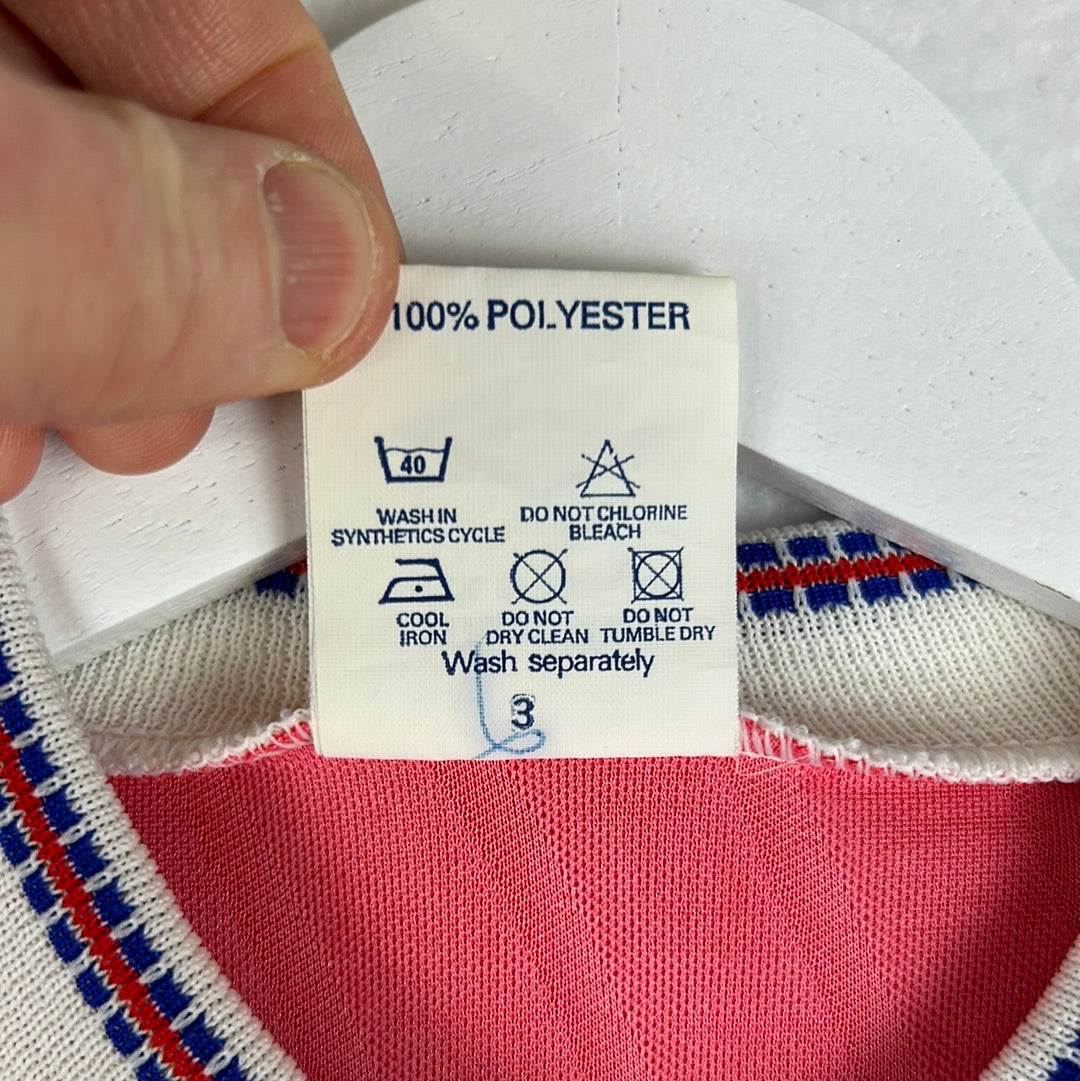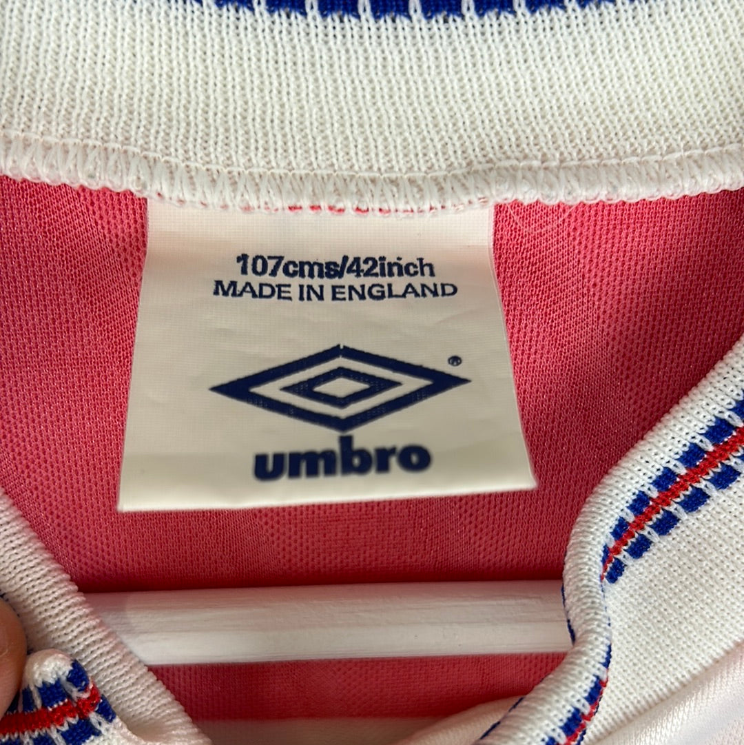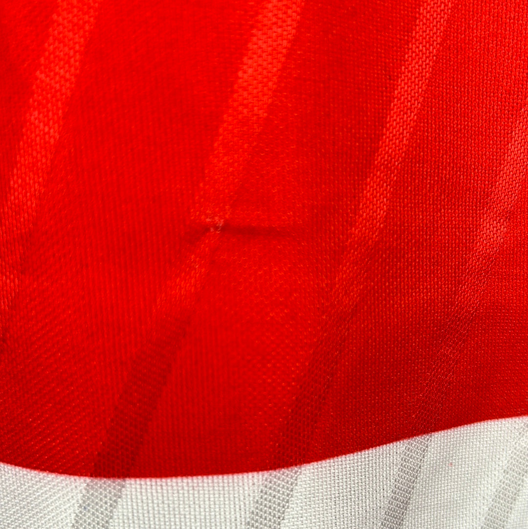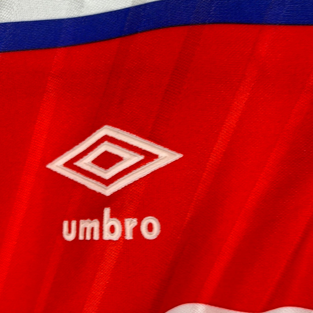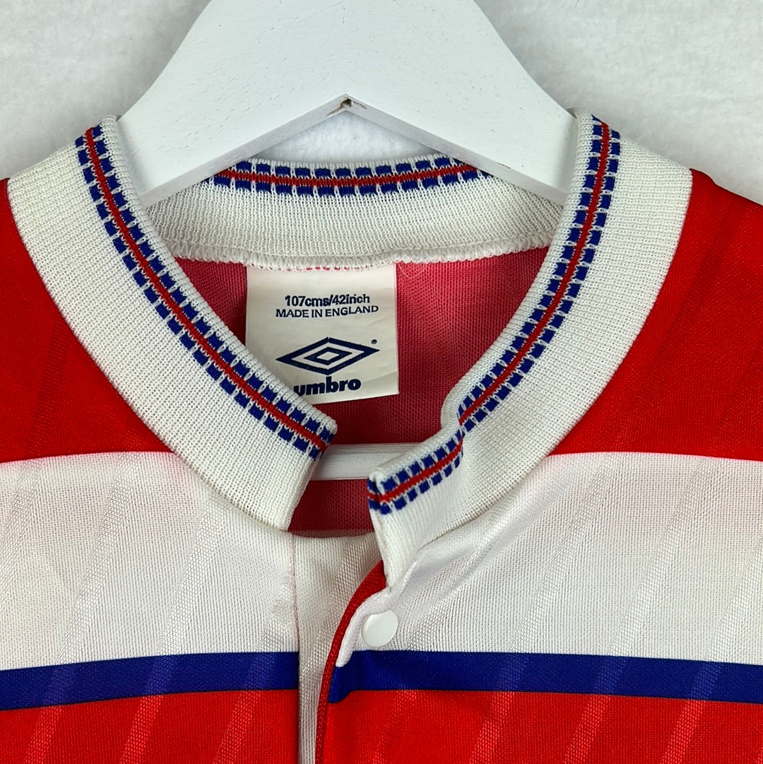 Info: The Chelsea third shirt in the 1998/1989 season and the away shirt in the 1989/1990 season. It is not common for a shirt to go from being a third season to an away the season after. This red and white striped Chelsea shirt has the Umbro logo and Chelsea badge embossed. This is a sponsorless shirt.