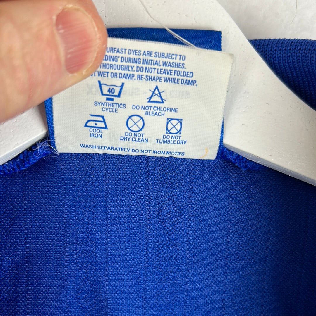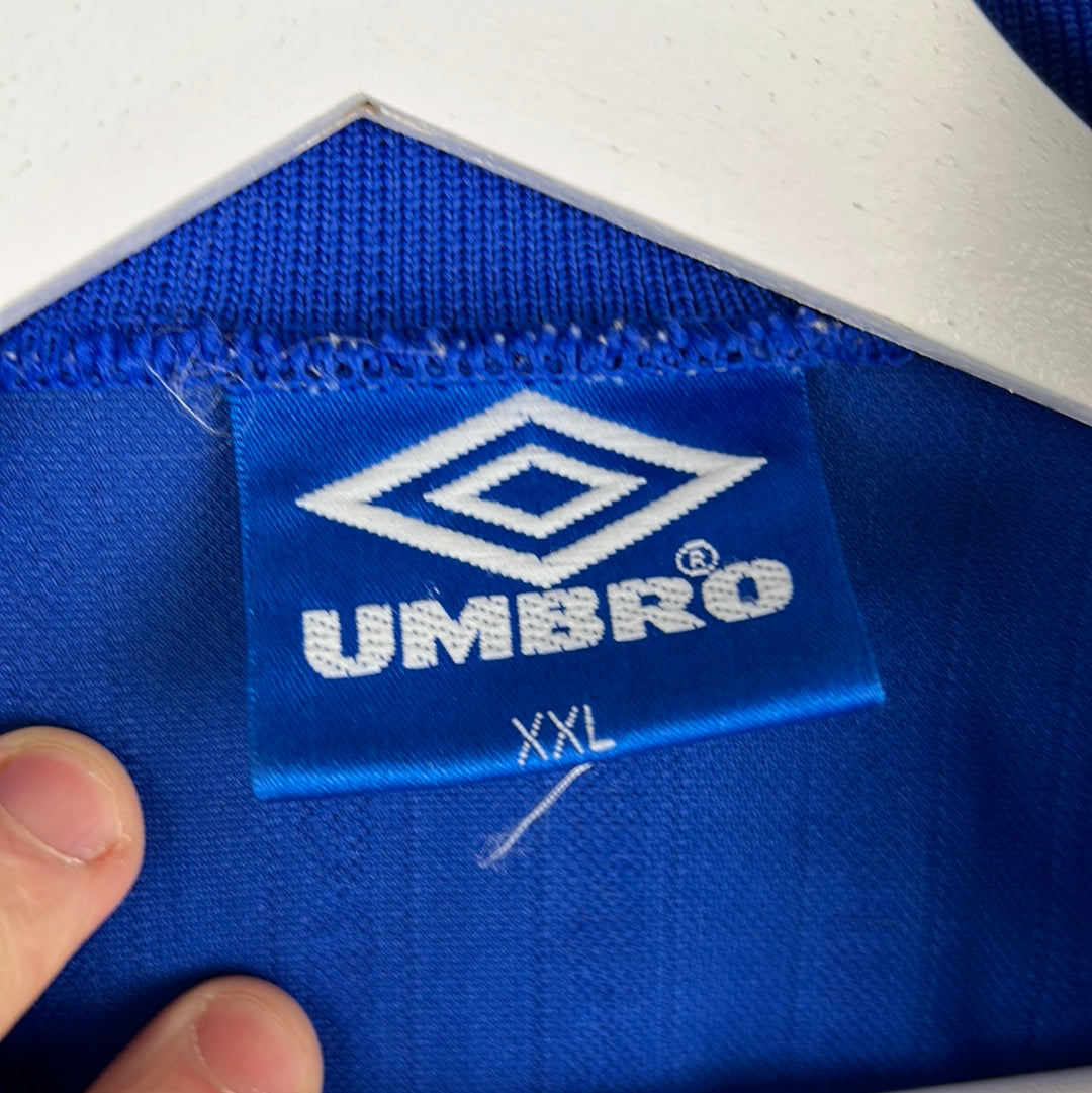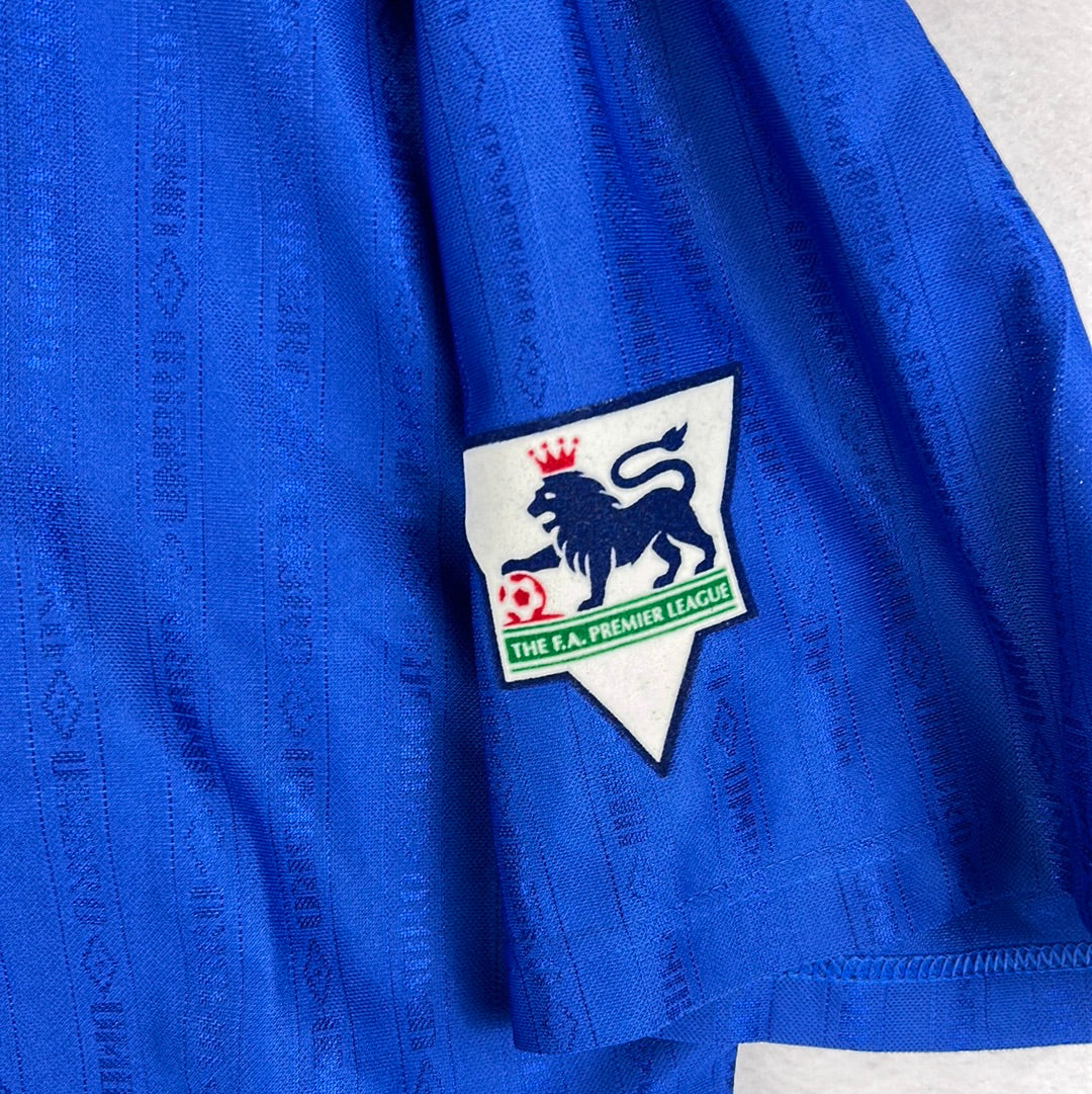 Info: The Chelsea home shirt in the 1996/1997 and 1997/1998 seasons. This blue Chsleas shirt has UMBRO in stripes in the material across the shirt. The collar is blue with yellow trim. The shirt has a white button collar on the front. The Coors sponsorship is printed in vinyl on the front. The Umbro badge is embroidered in yellow and the Chelsea badge is a patch. Gullit 4 print.