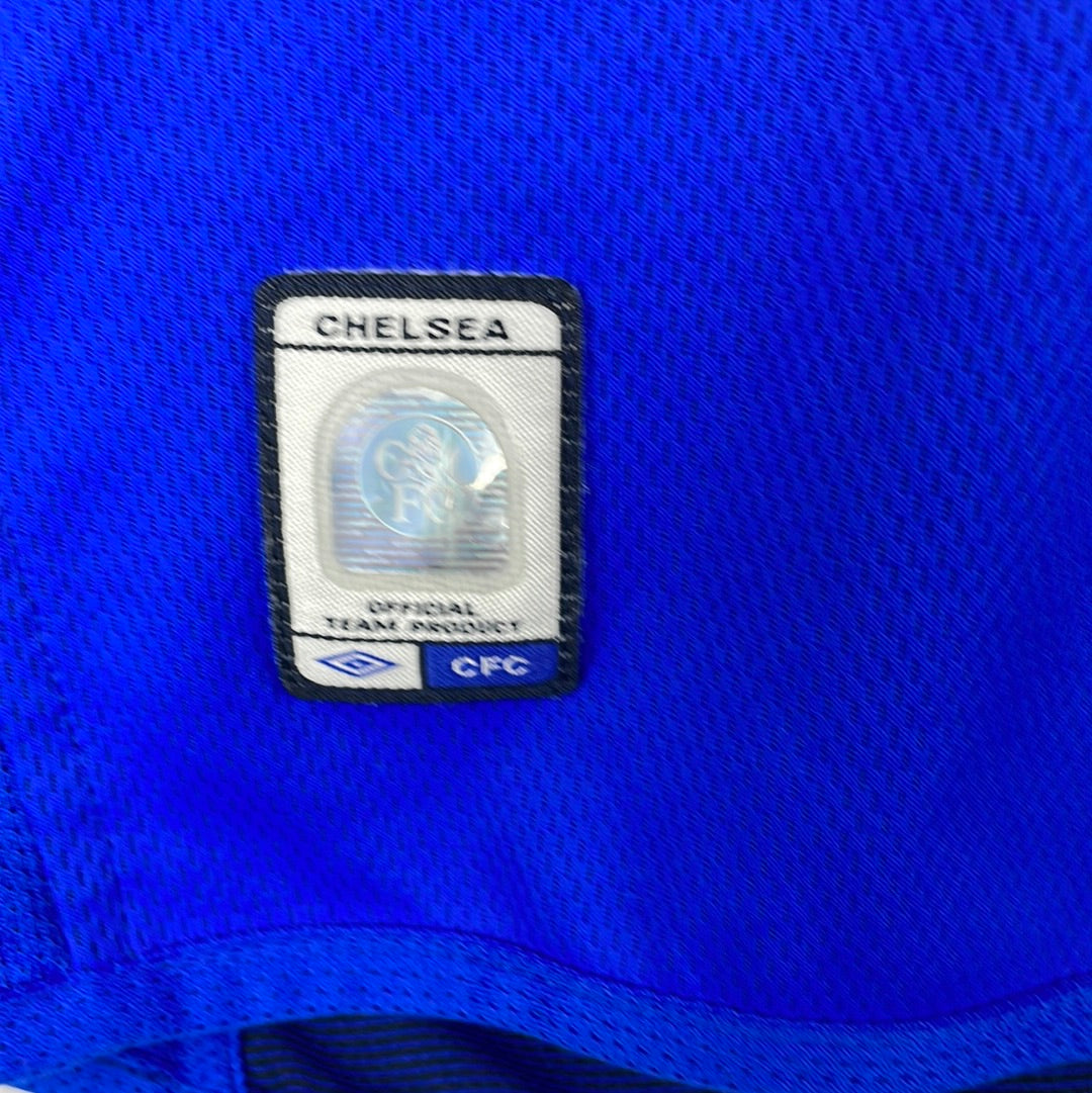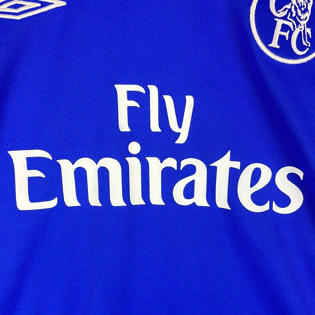 Shirt info: Chelsea's home shirt in the 2003/2004 and 2004/2005 seasons was blue with a white V-neck and white Umbro logo.