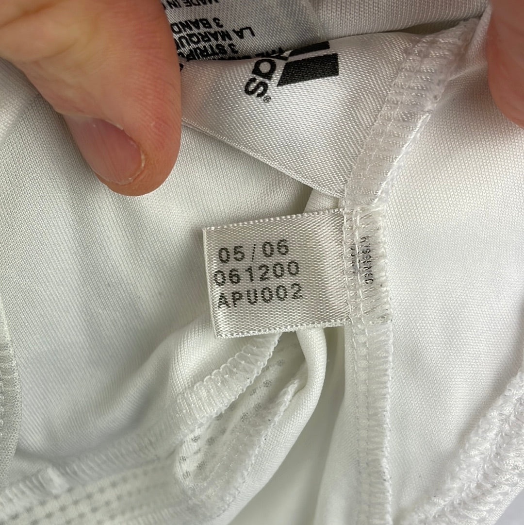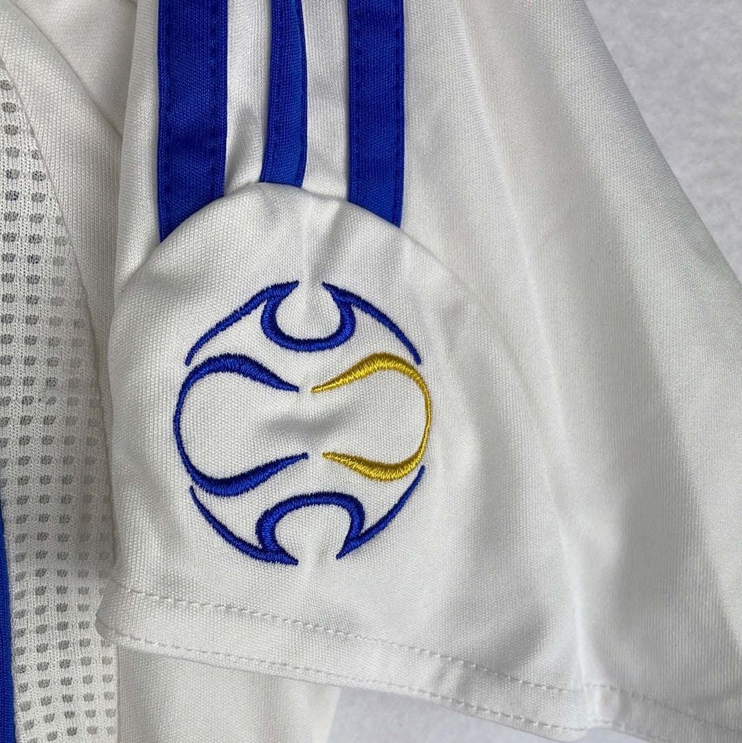 Shirt info: The Chelsea away shirt from the 2006/2007 season. This is a Teamgeist Adidas shirt with the standard template from the time and the Teamgeist logo embroidered on the sleeve. The shirt is white with a light grey stripe and Chelsea blue detailing. This included the front SAMSUNG sponsor, Adidas logo and stripes.