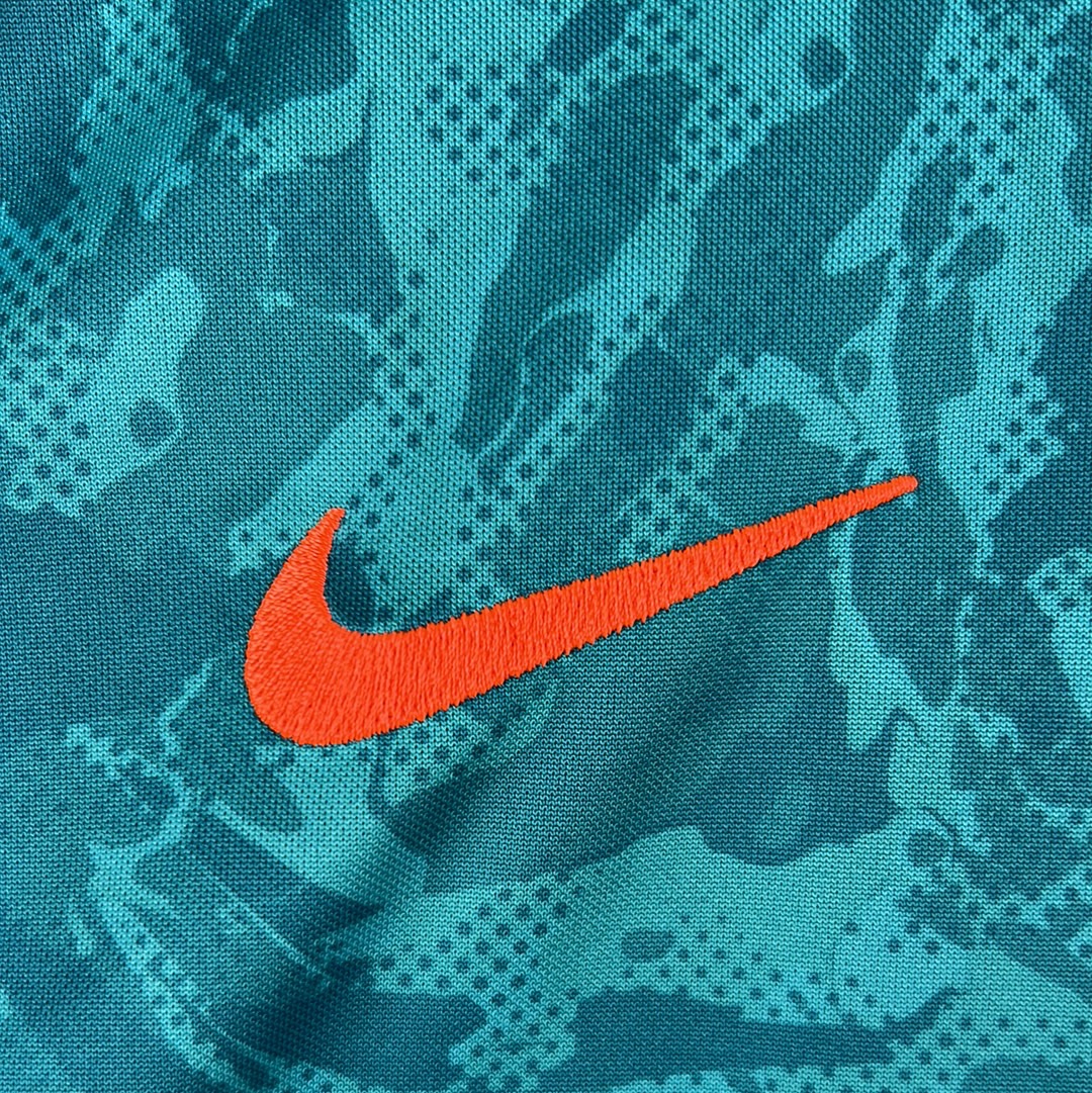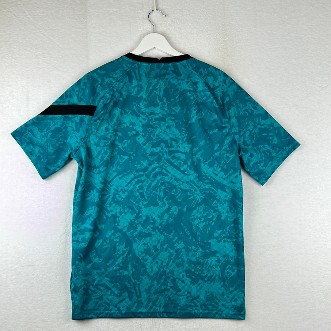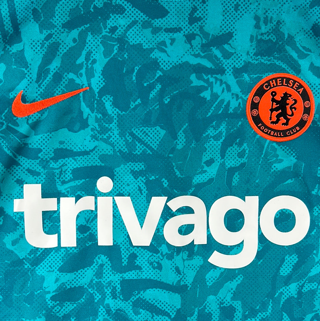 Shirt info: The Chelsea pre-match warm-up shirt for the 2021/2022 season. A turquoise shirt with a darker funky turquoise pattern throughout. Used by the Chelsea men's football team for pre-match warmups.