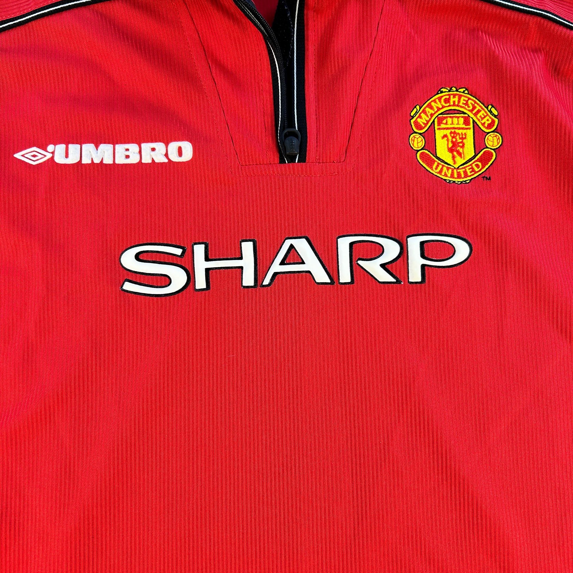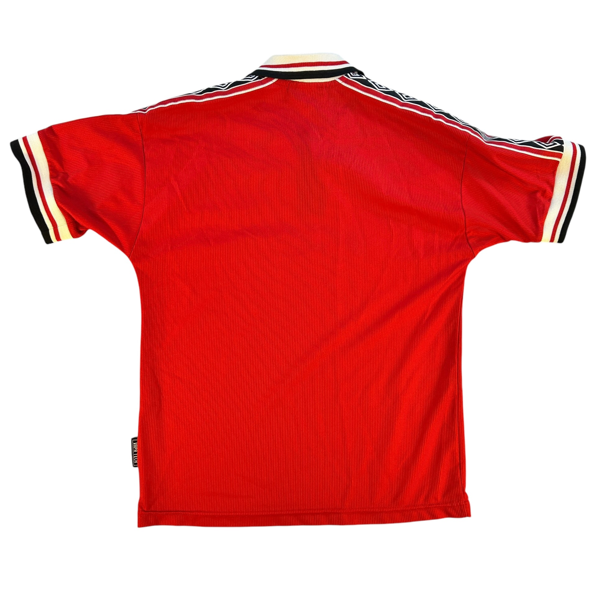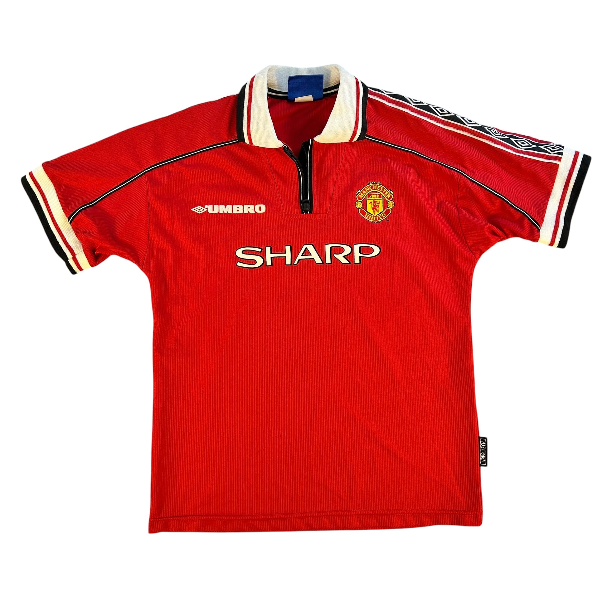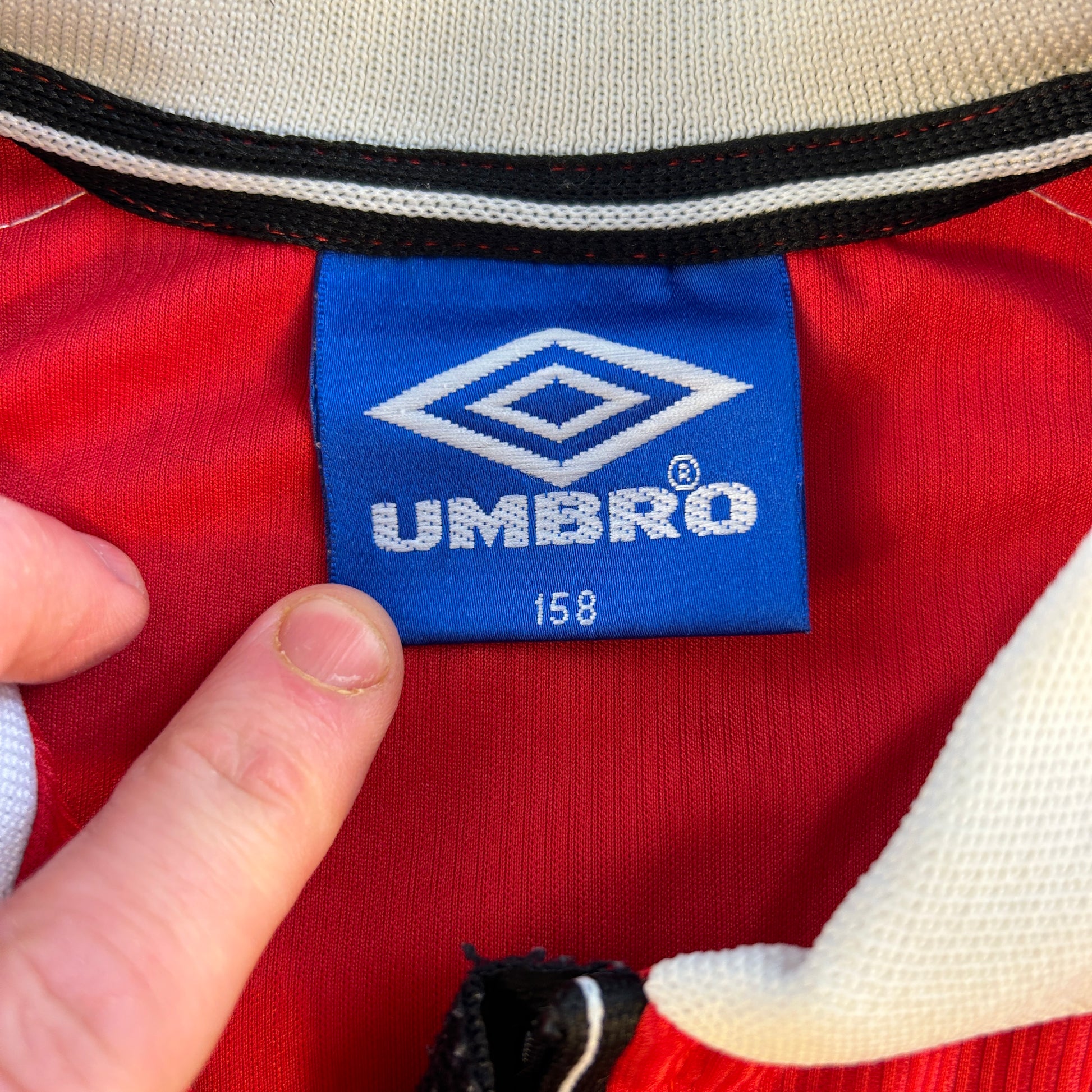 Shirt info: A classic Umbo Manchester United shirt from the 1998/1999 treble-winning season. It has the smaller Umbro logo tape down the sleeves as it is a youth shirt.