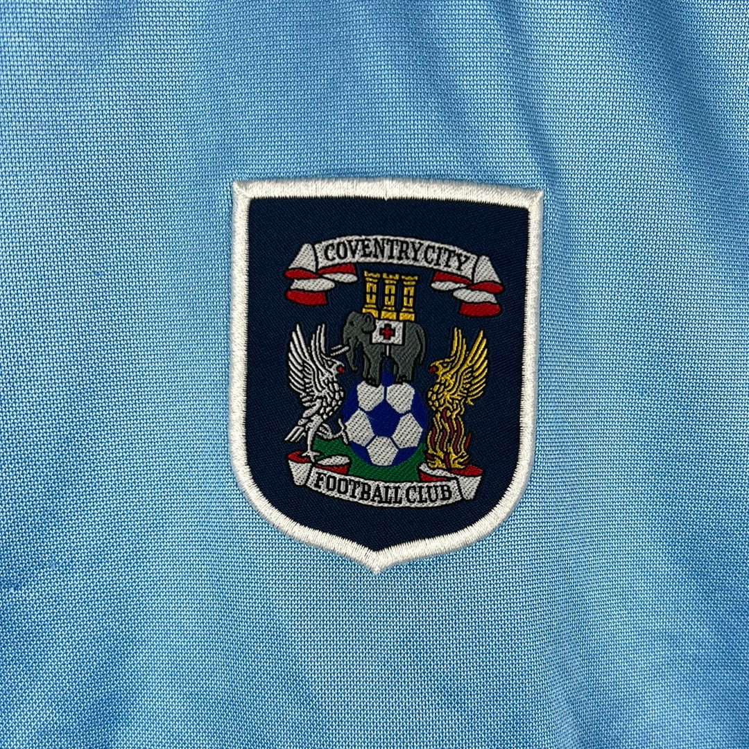 Shirt info: The Coventry City home shirt in the 1999/2000 season. A light blue shirt with dark blue over the shoulders. All the badges are positioned centrally on the shirt.