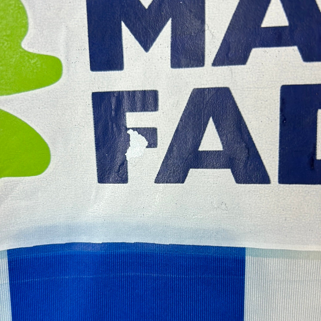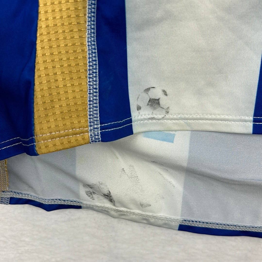 Condition Details: The shirt has some damage with the blue running it to the white on the shirt. The front sponsor has a very minor peel on the F and there are some marks on the print on the back.