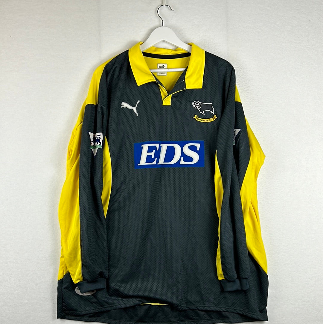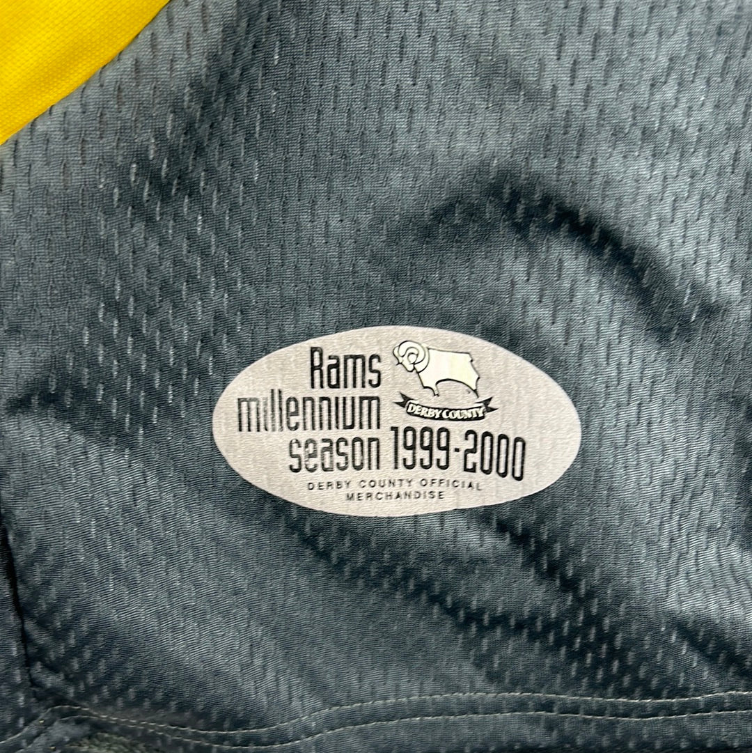 Shirt info: The second-choice goalkeeper shirt for Derby in the 1999/2000 Premier League season. This was the 100th year anniversast of the club and there is a print on the lower front for this.
