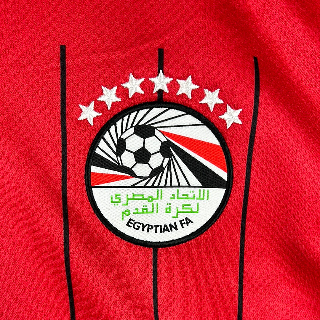 Shirt info: This is the Egypt home shirt for 2022. It is a red shirt with black and white stripes on the front. It has a black and white V-neck collar. The badge has eight stars embroidered above in white.