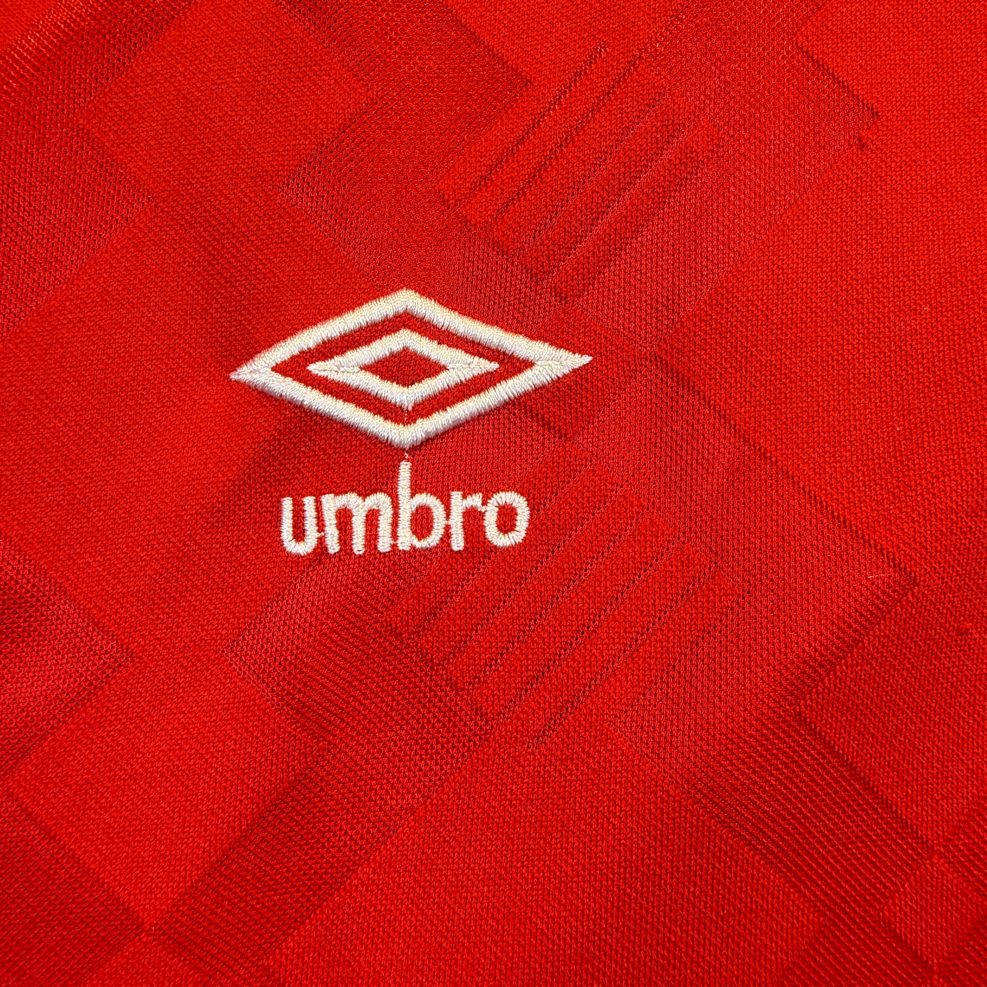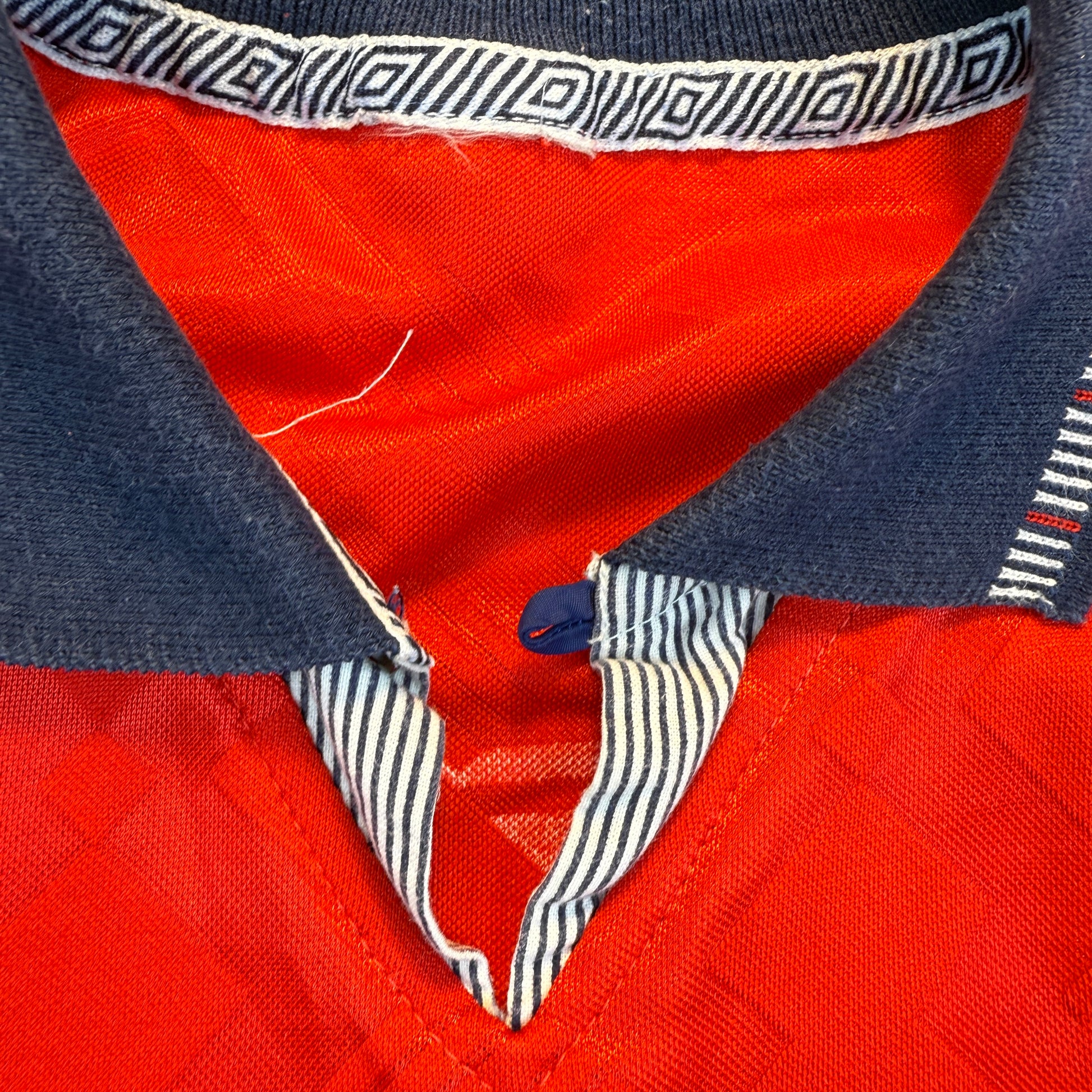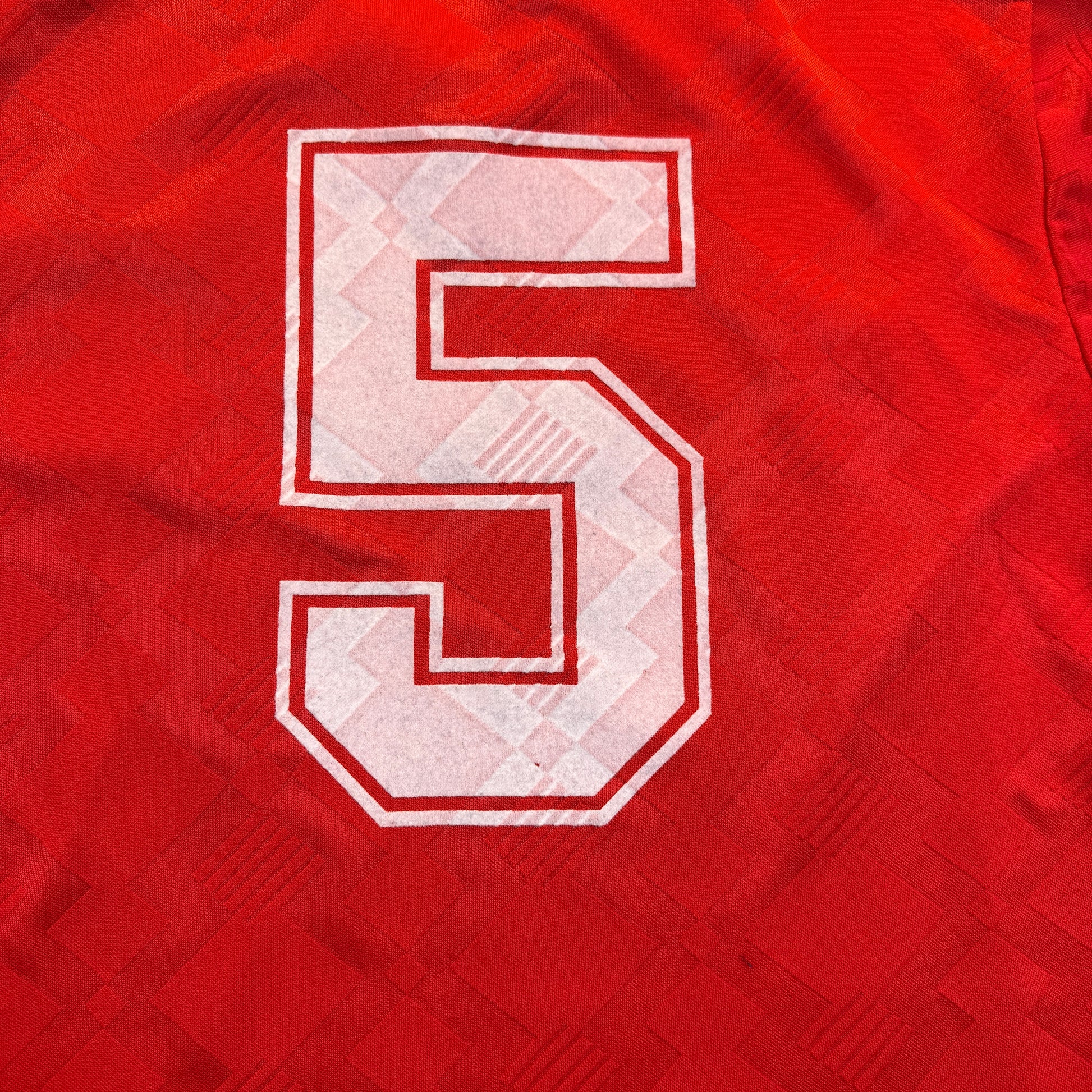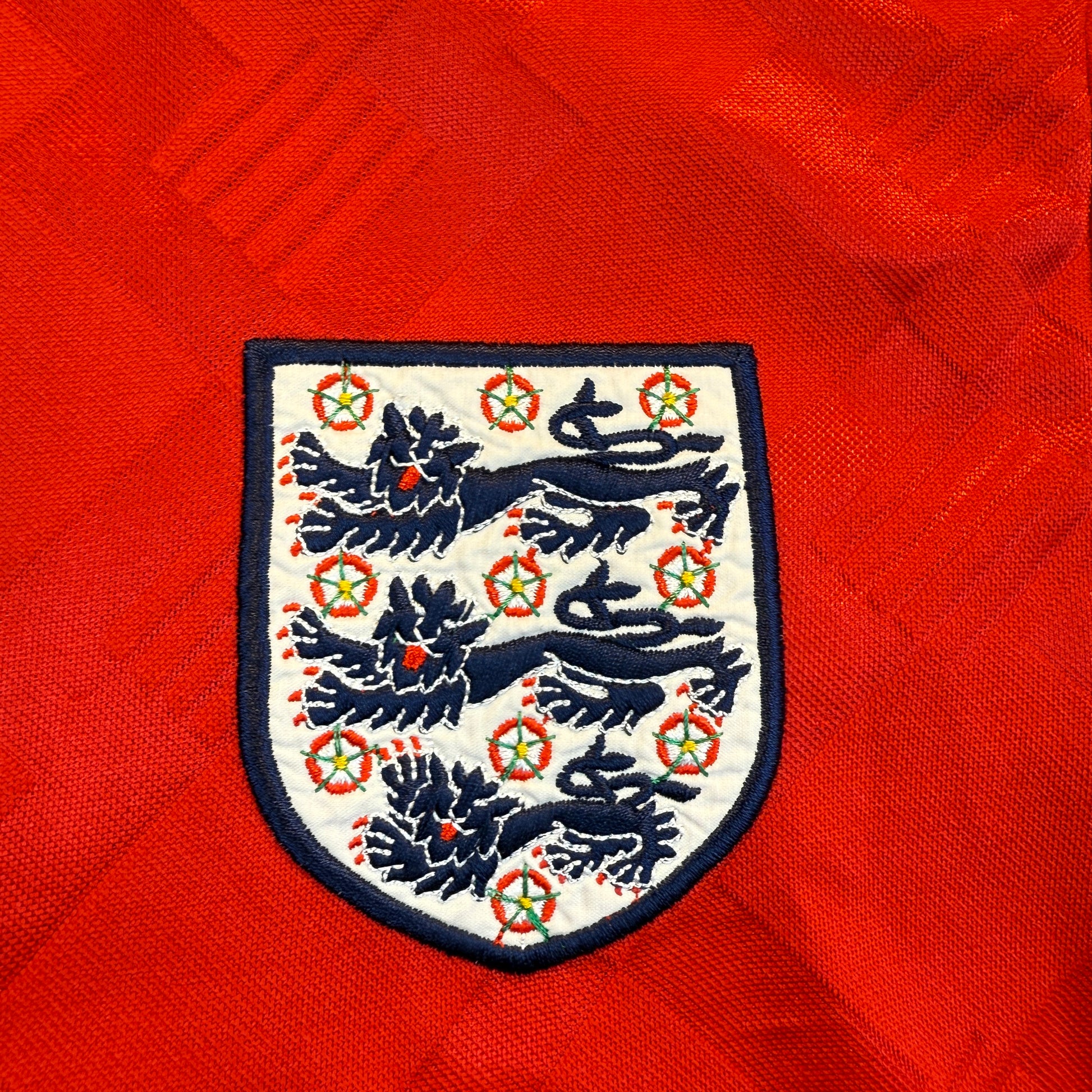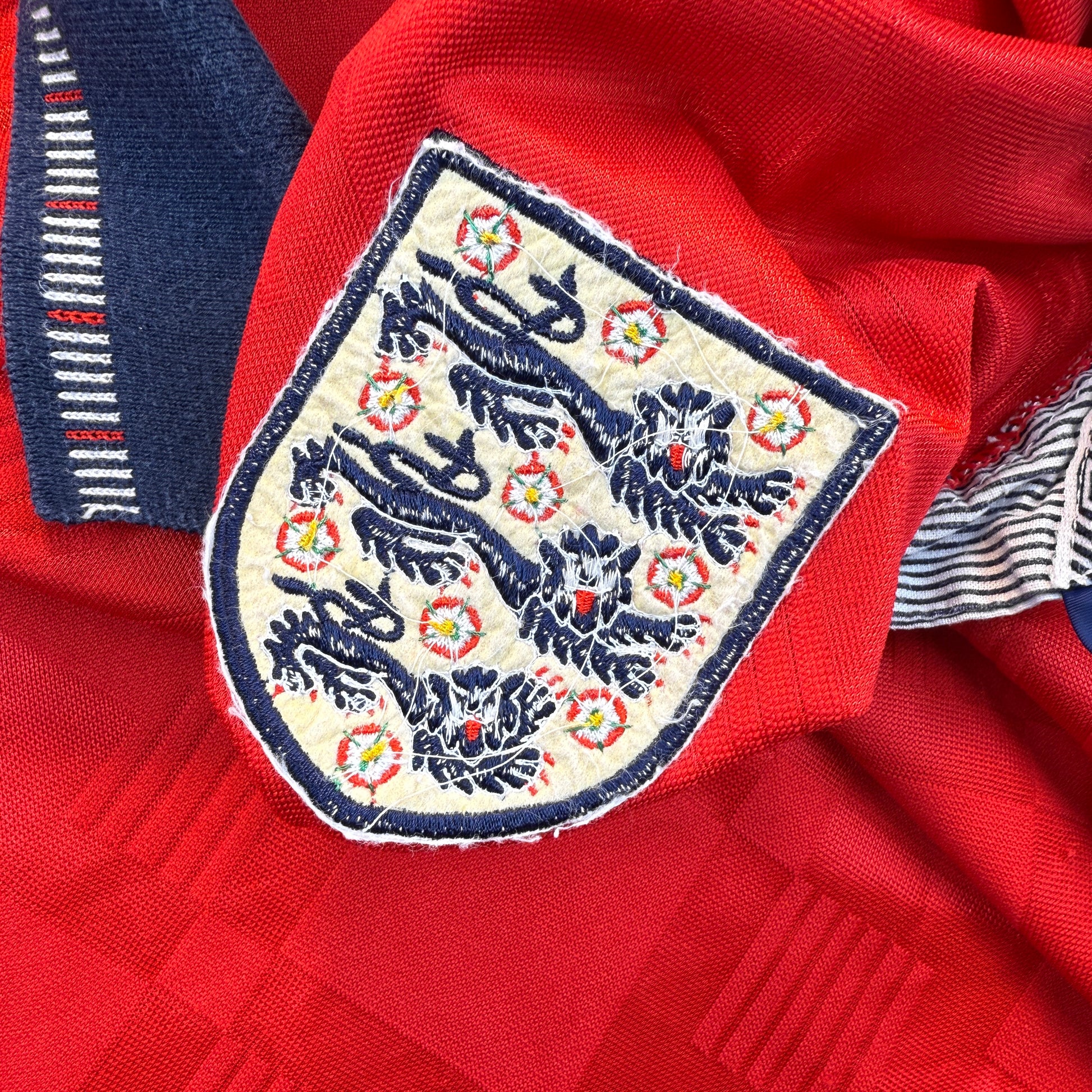 Shirt info: This is the classic 1990 away shirt for England. It features a fully embroidered badge, which was previously exclusive to player-issued shirts. The shirt has no prominence, so we are unable to tie it to be match-worn or issued. It could have been worn for a full game or for an under-21s game.