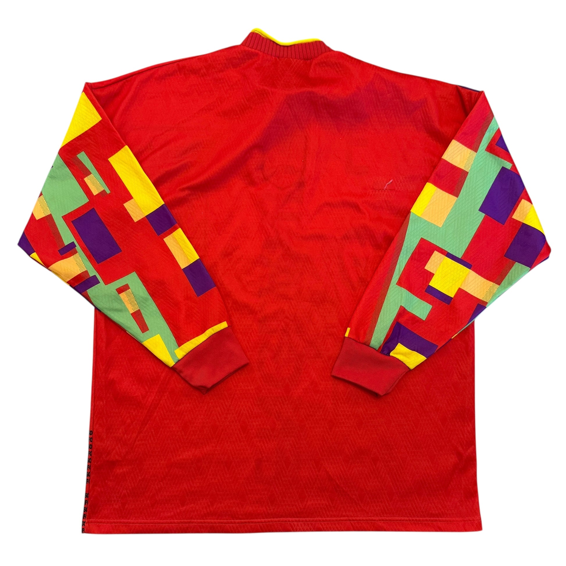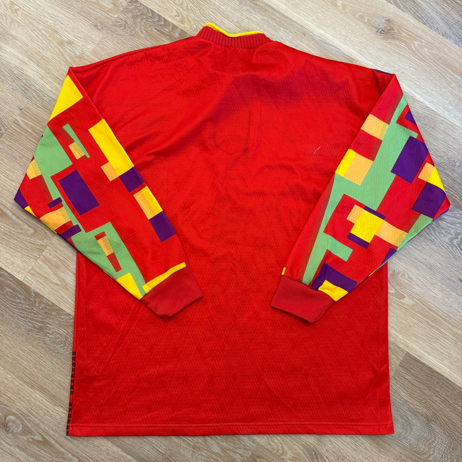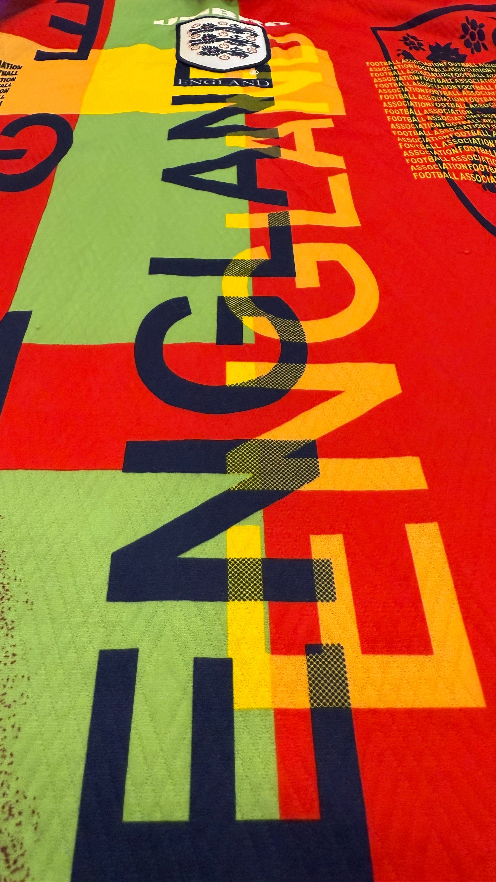 Shirt info: The England goalkeeper shirt for Euro 96. These are from back in the day when goalkeeper shirts were loud and jazzy!