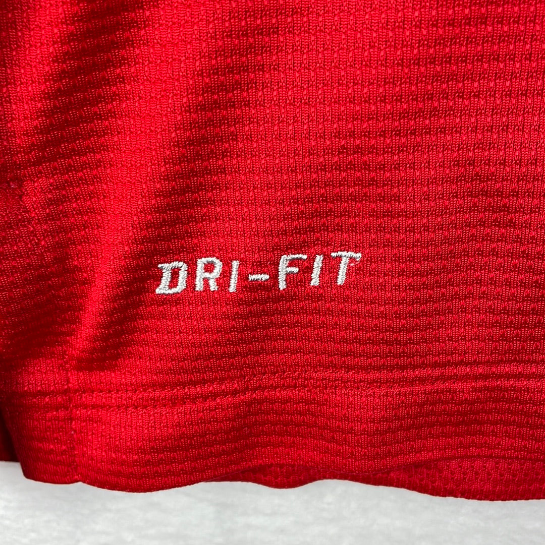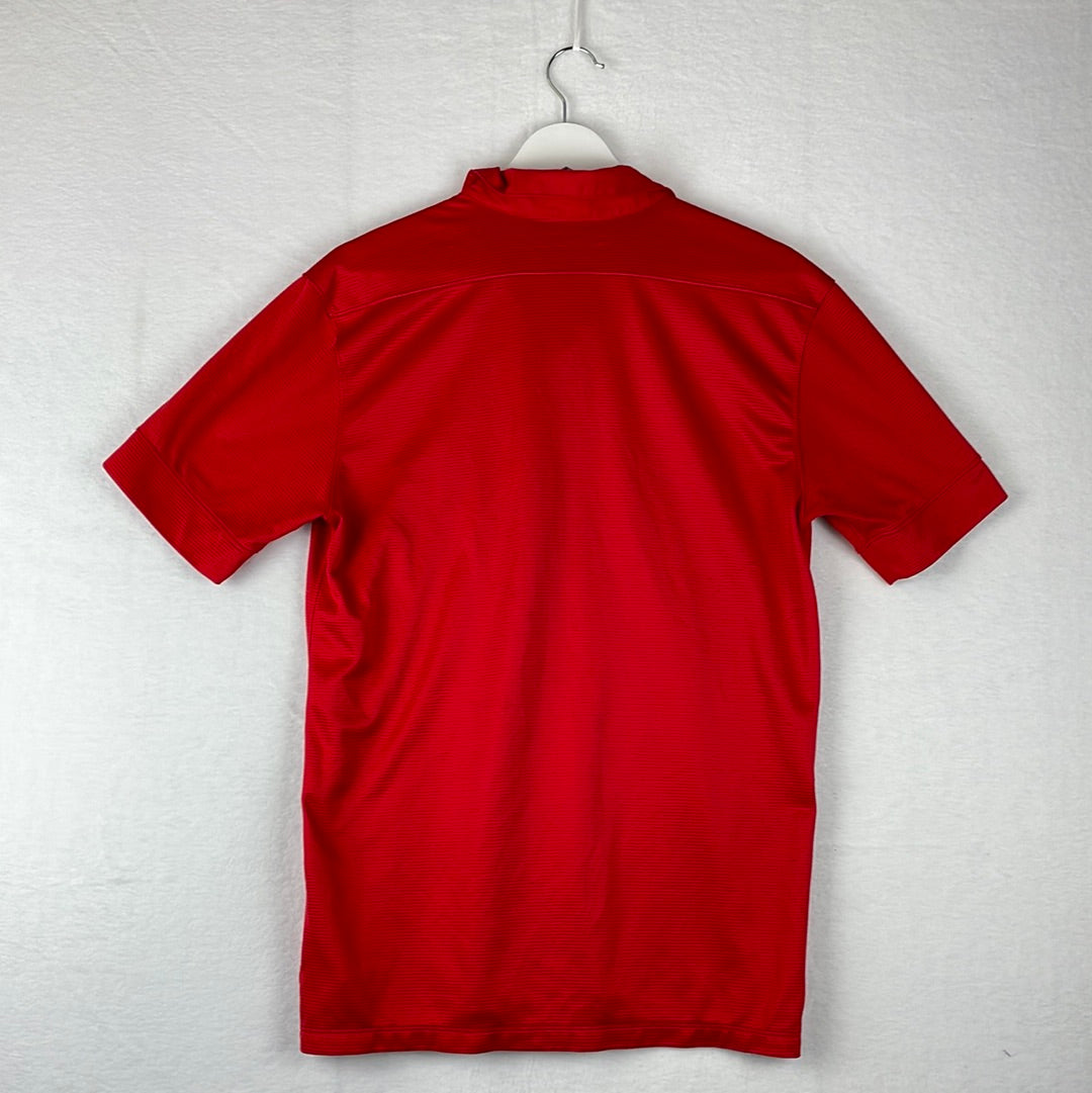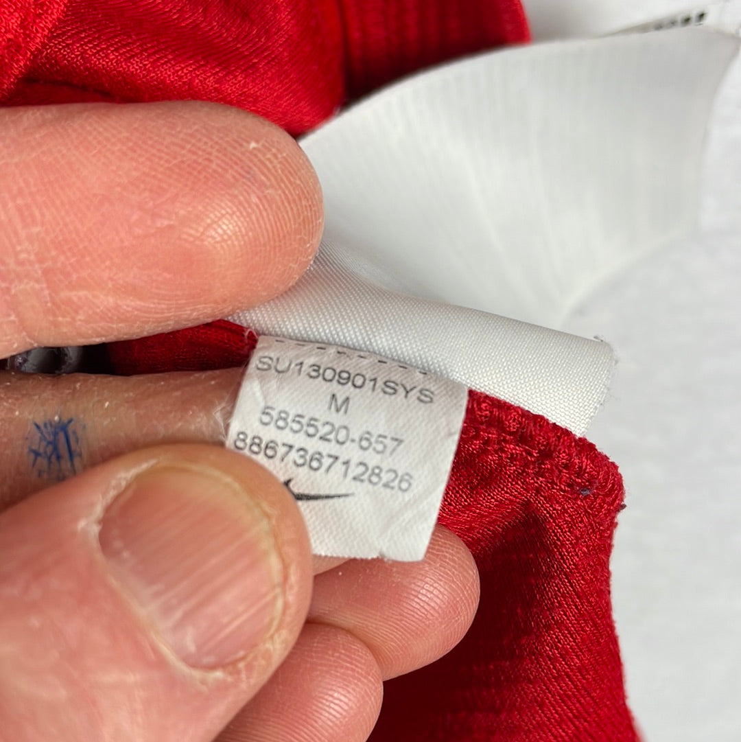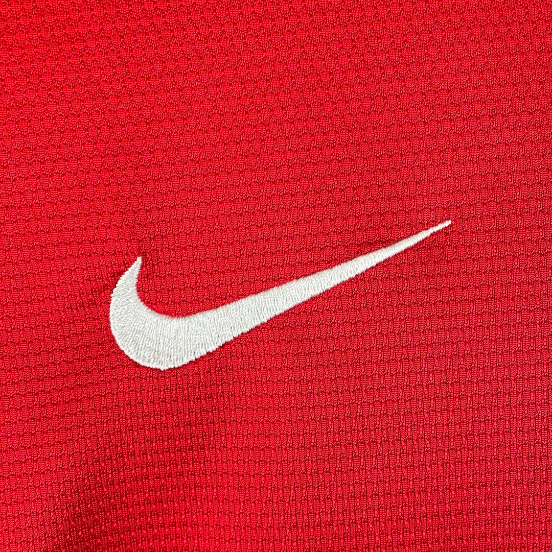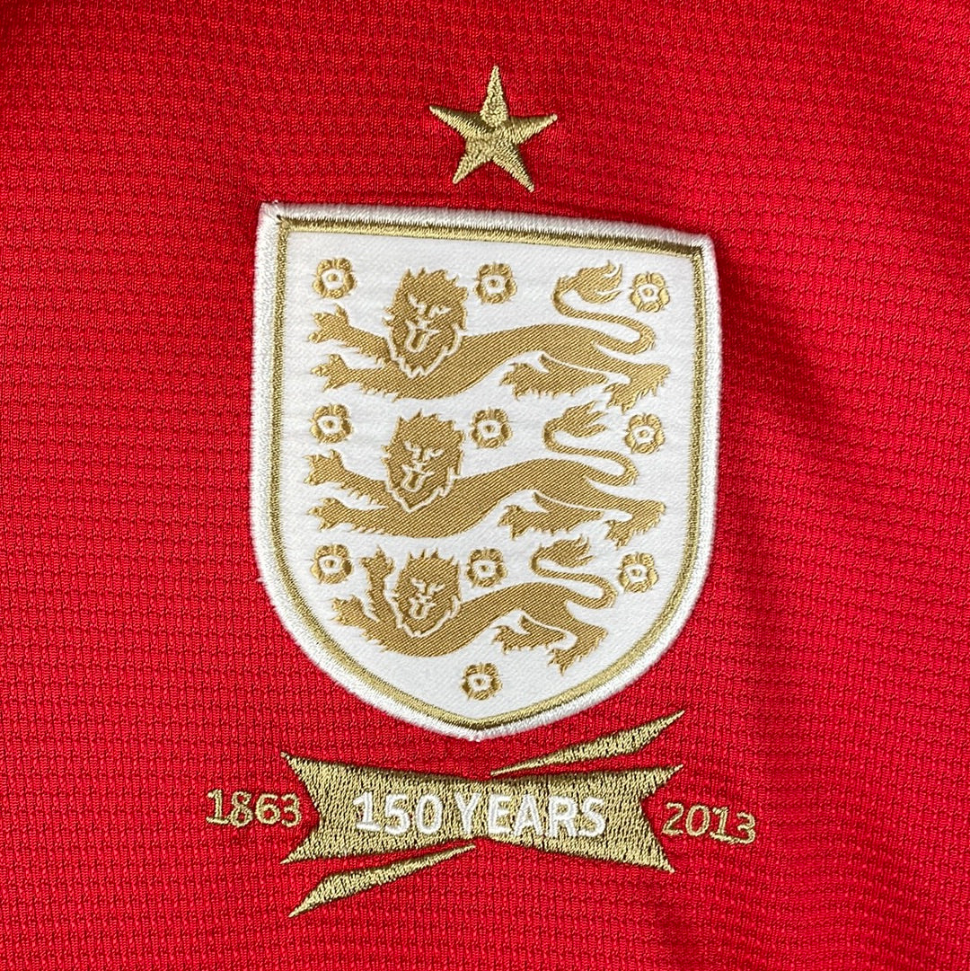 Shirt info: The England shirt for the 2013 season. A traditional red shirt with a shirt collar. The Nike swoosh is embroidered in white. The England badge is a patch with a star embroidered above it and the 150 years embroidered below.