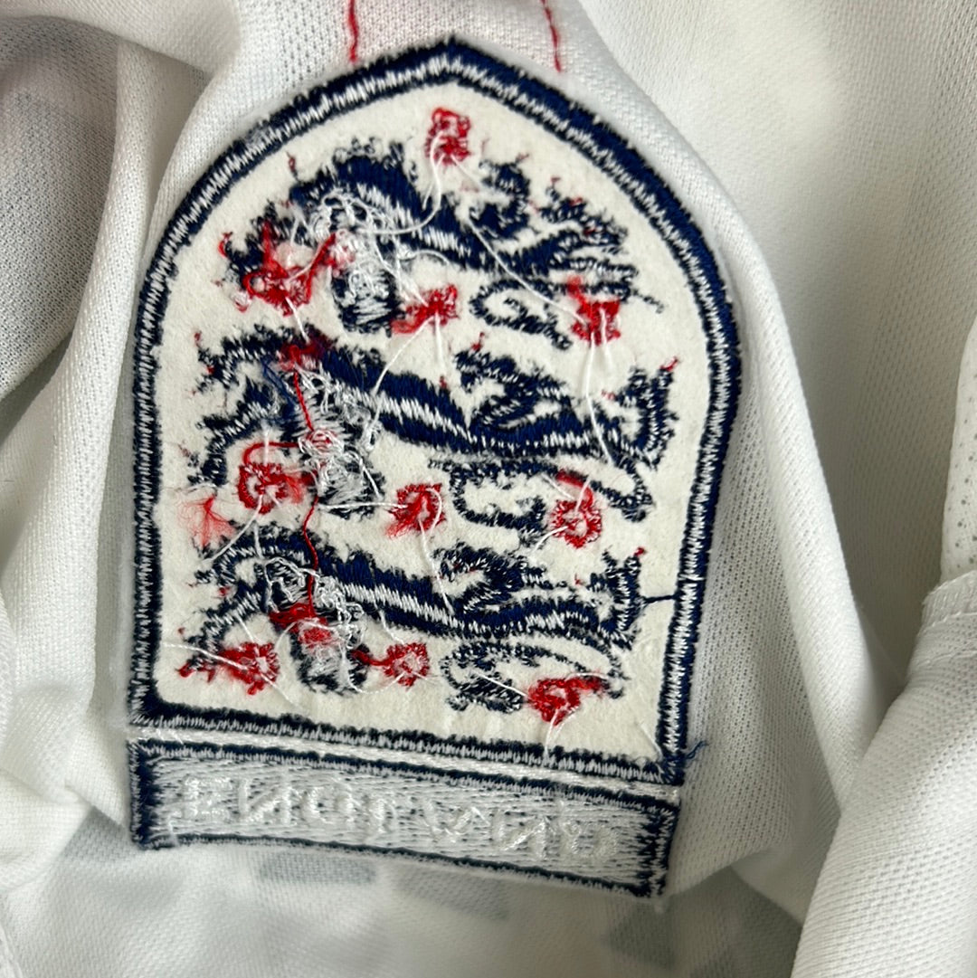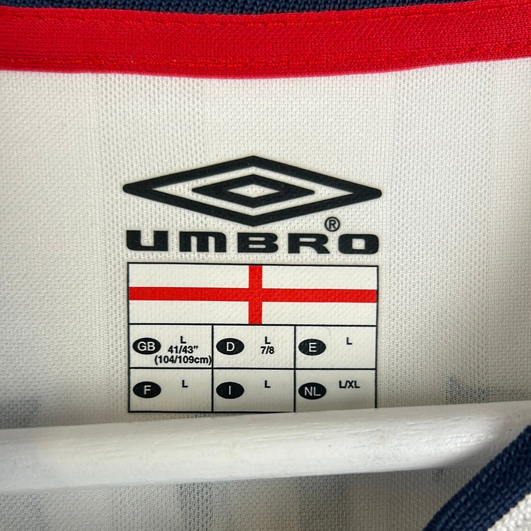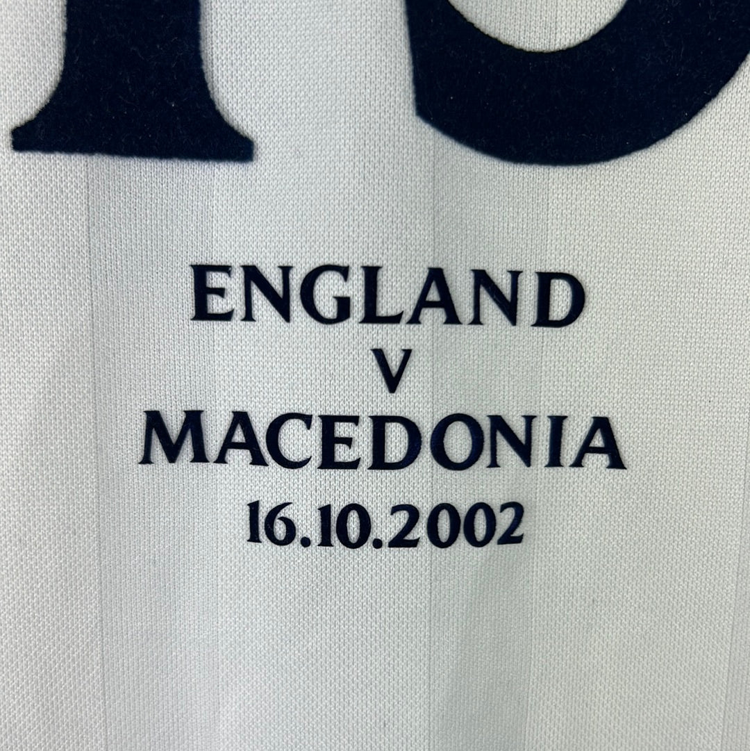 Shirt info: Issued to Owen Hargreaves for the 2002 game v Macedonia. This has a felt number on the front and the match detailing. The number on the back is also a felt print. This is a player issued Umbro shirt.