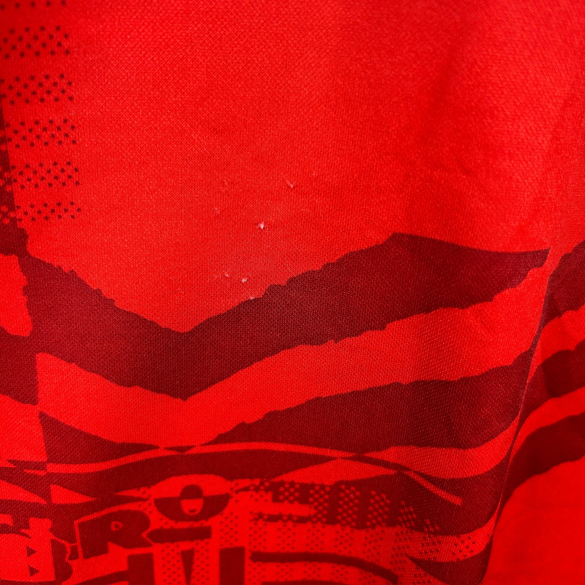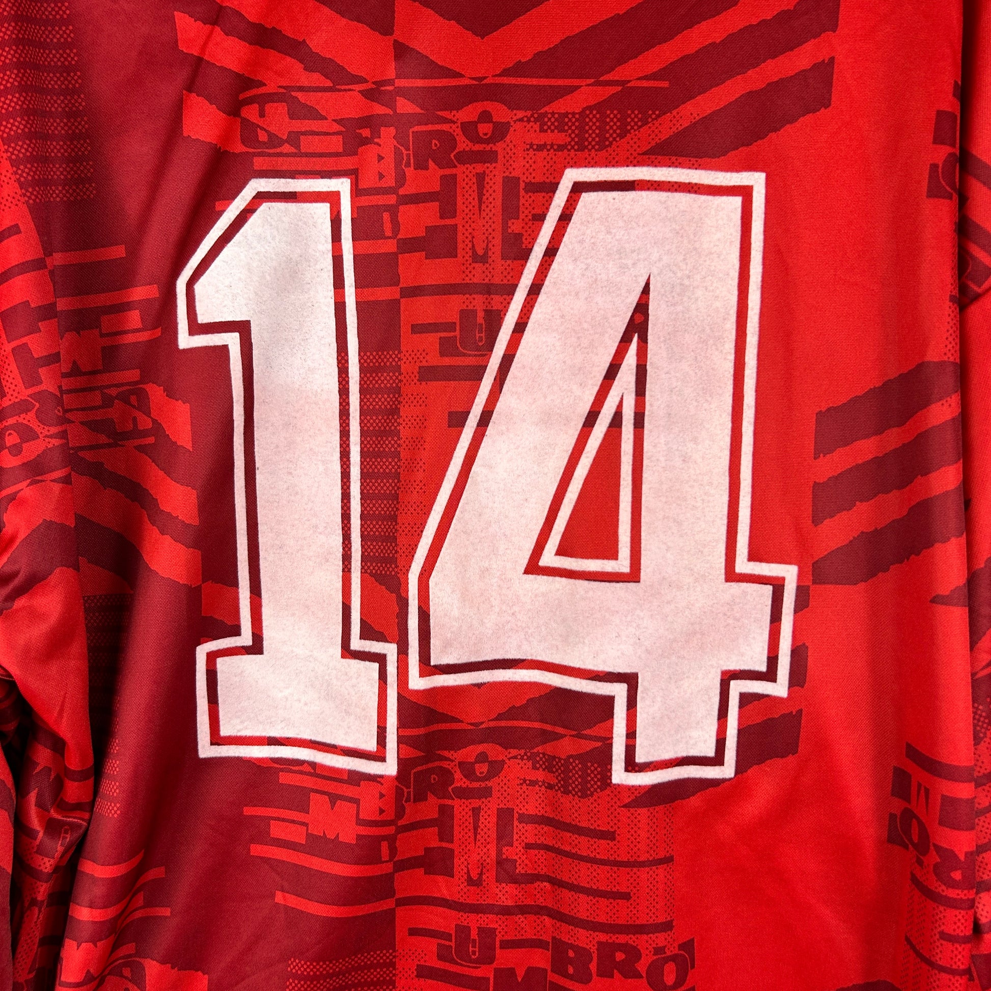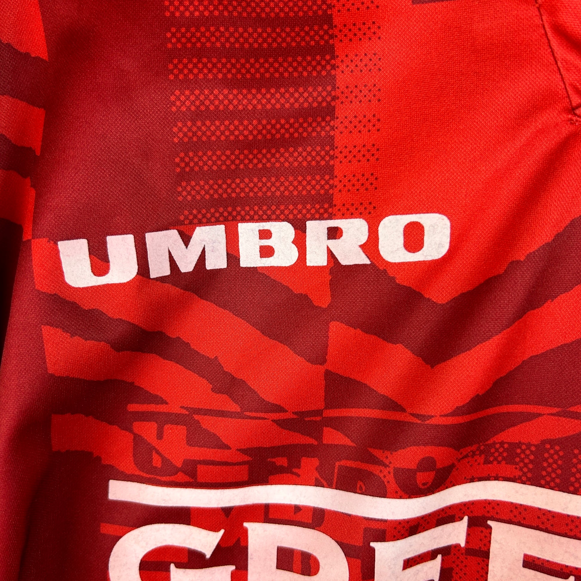 Shirt info: This is a long-sleeve England training top from around 2000-2002. It is funky and designed with a printed Umbro logo.